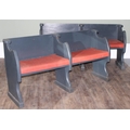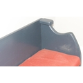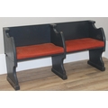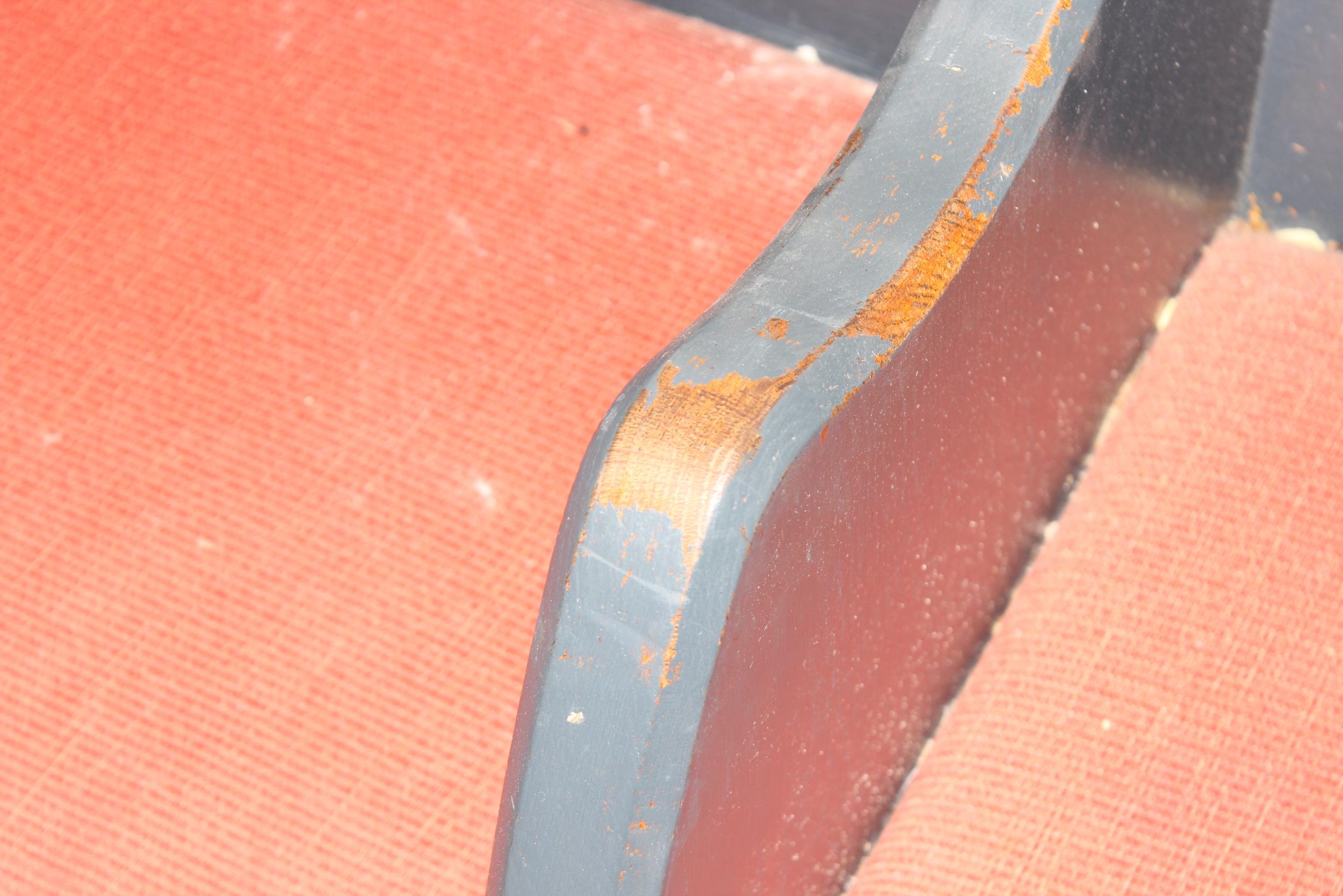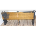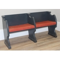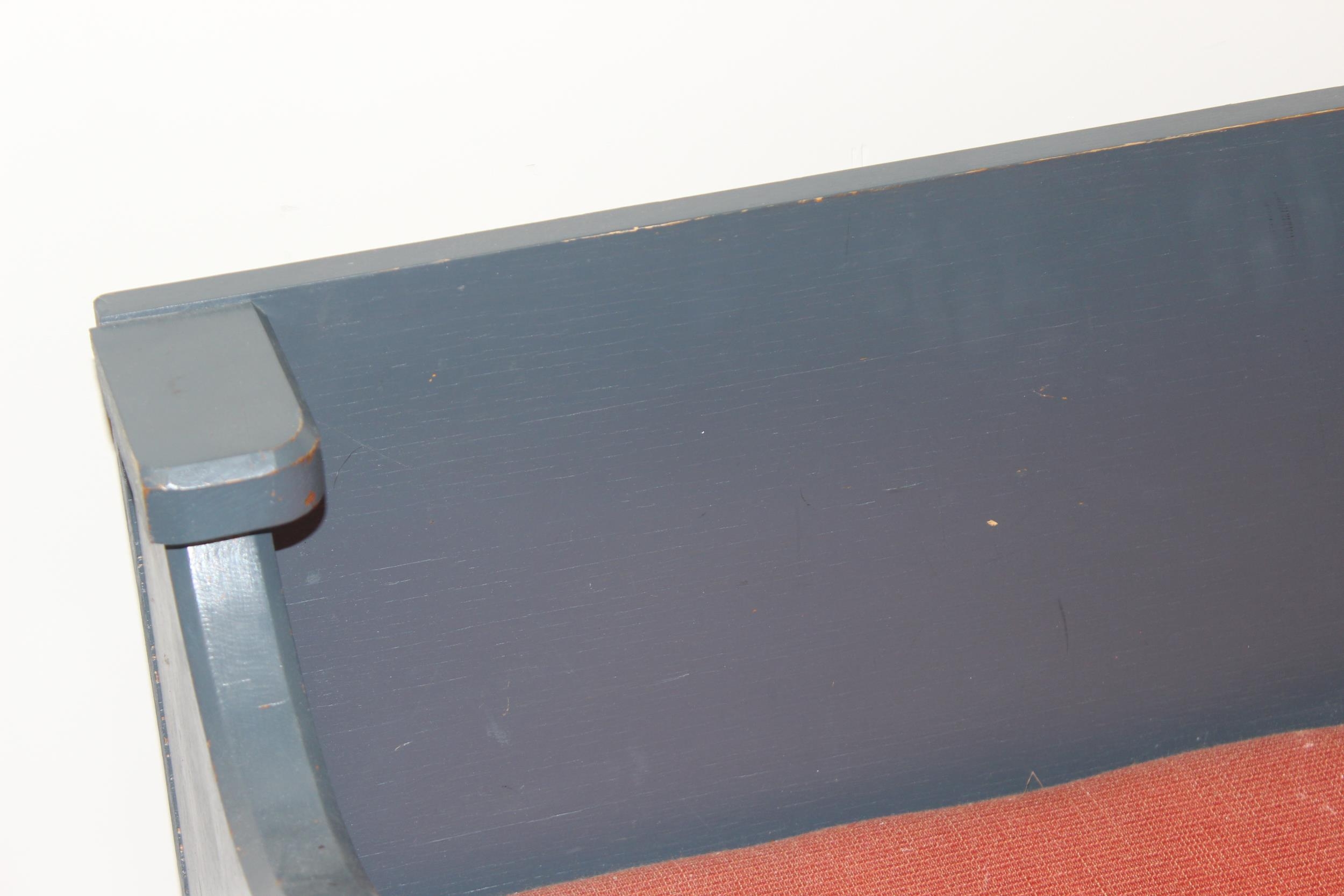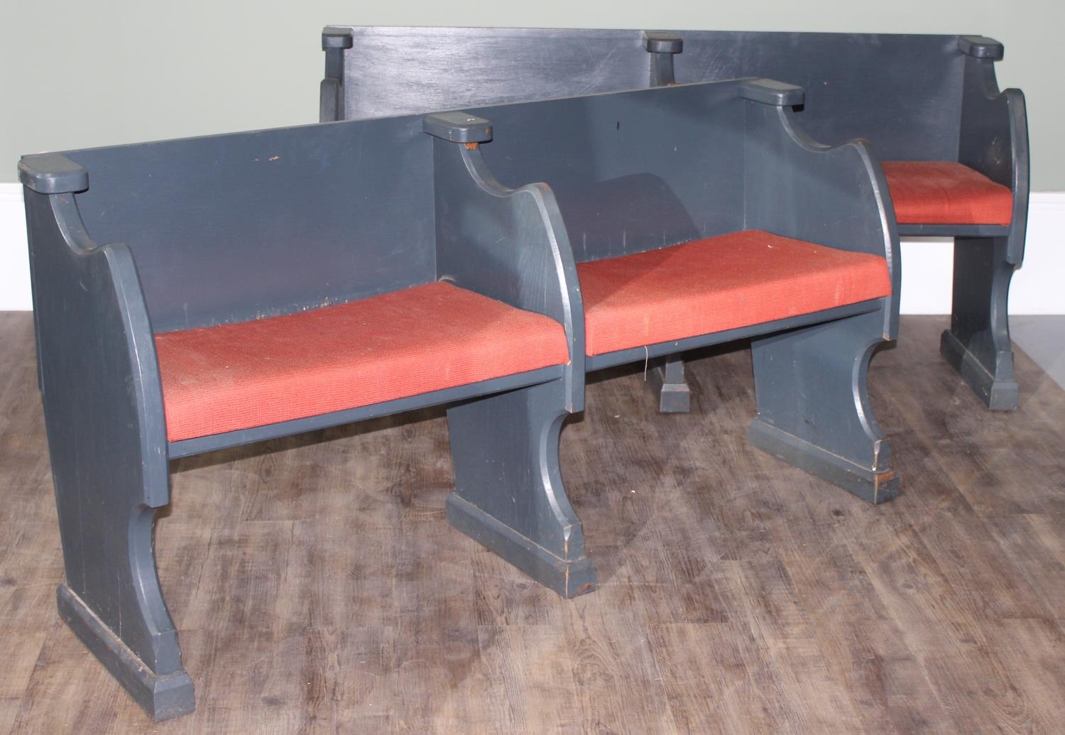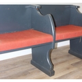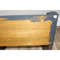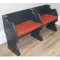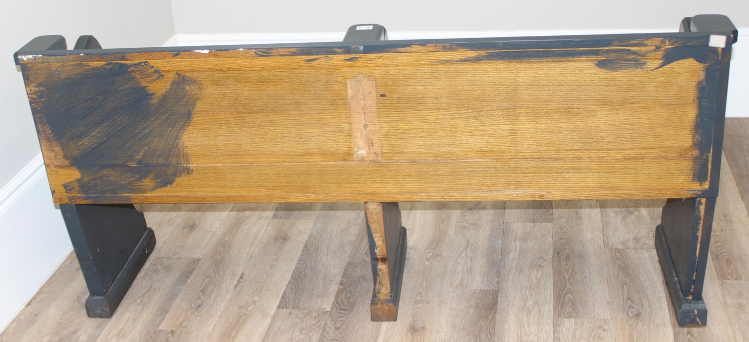 2 vintage double-seat painted oak benches or settles with cushioned seats, approx 170cm wide x 48cm deep x 83cm tall