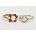 TWO CULTURED PEARL RINGS, one 9ct white gold ring set with a singular cultured pearl, measuring approximately 5mm, set in a skirted setting with fourteen round brilliant cut accent diamonds, ring size O, also including one 9ct yellow gold ring set with a singular cultured pearl, measuring approximately 6mm, four accompanying circular cut rubies, split shoulders, polished band, ring size N, both rings hallmarked 9ct gold Birmingham, approximate gross weight 5.9 grams, (condition report: general moderate wear, would benefit from a gentle clean, overall condition good)