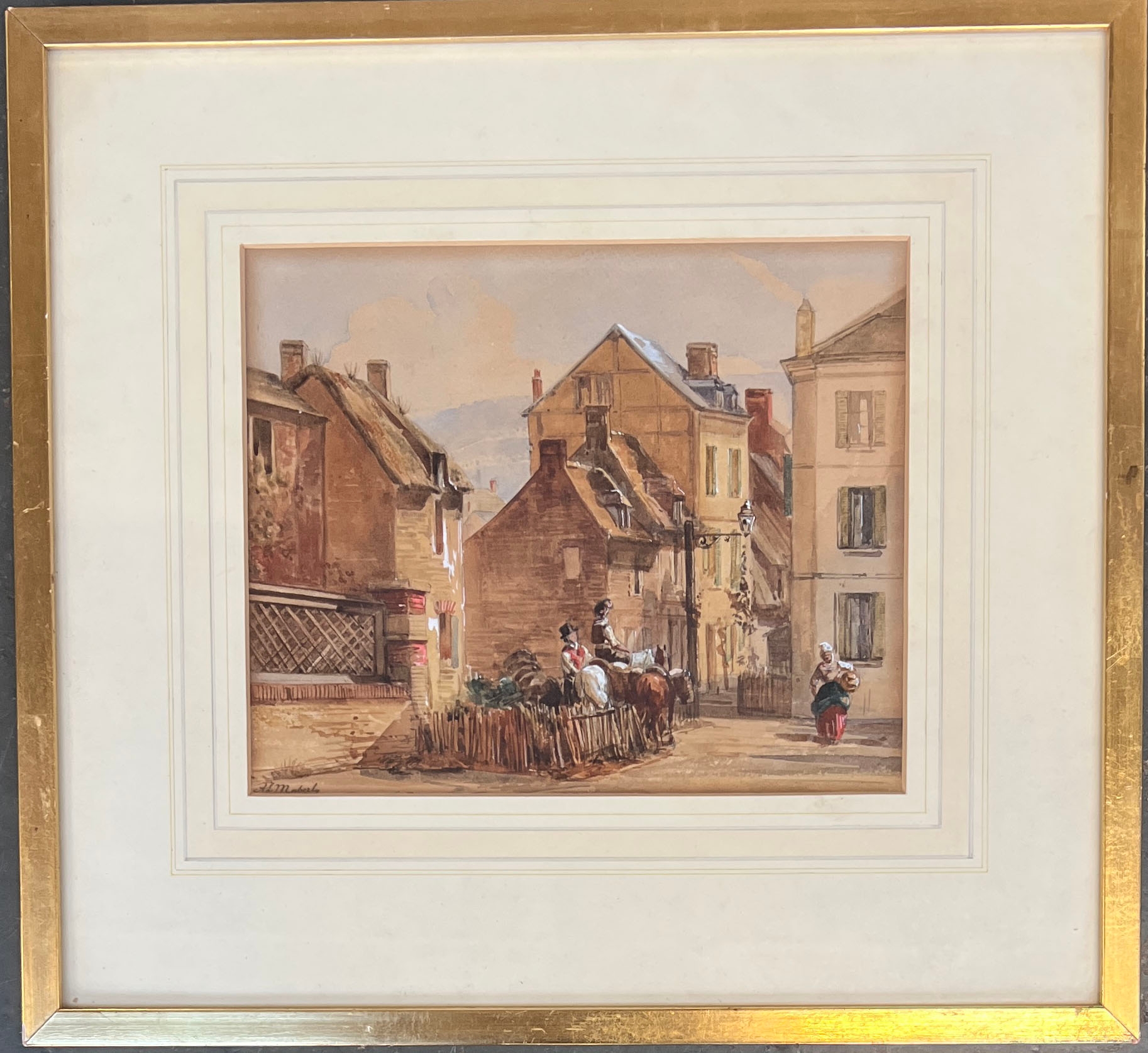 A 19th century watercolour, street study with horses, signed Maberly lower left, 20.5x25cm