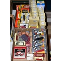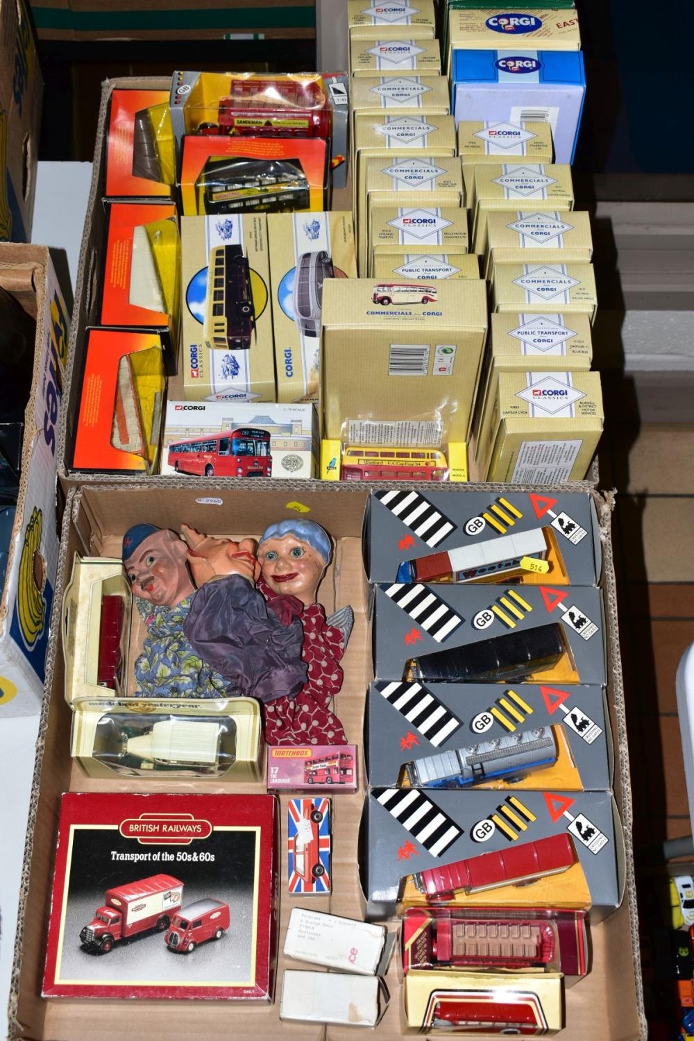 A QUANTITY OF BOXED CORGI CLASSICS COACH MODELS, assorted mixture of AEC Regal, Leyland Tiger and Daimler CV, all complete with limited edition certificates except for Grey Green AEC Regal, with a quantity of other Corgi Classics bus models (with certificates), Corgi buses, Corgi and other diecast vehicles, and three vintage hand puppets, composition heads, cloth bodies (worn) (2 boxes)