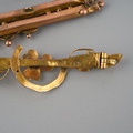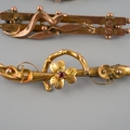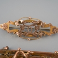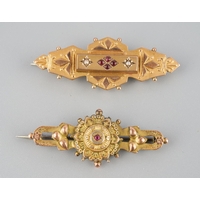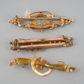 A collection of three 9ct gold antique brooches. Each brooch with marks indicating 9ct gold, some brooches AF, approx lengths 43mm to 45mm, approx gross weight 5.8 grams.