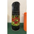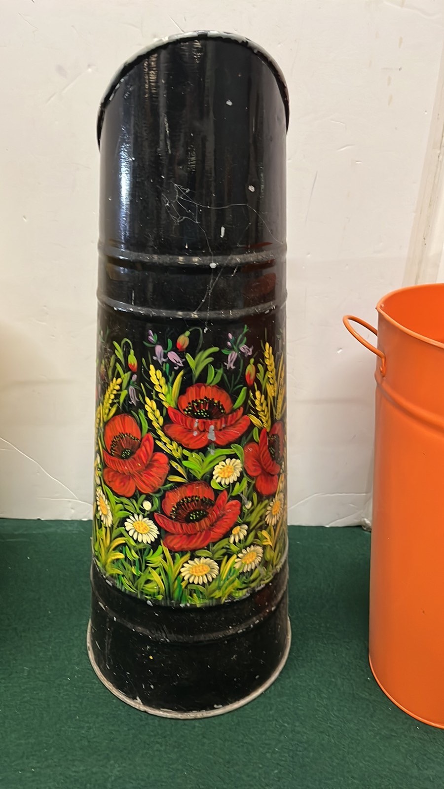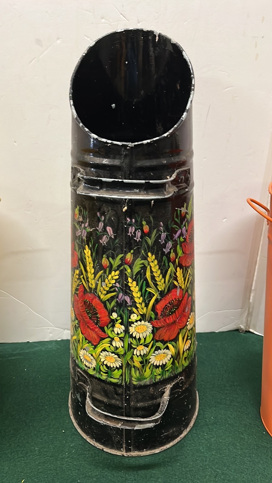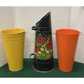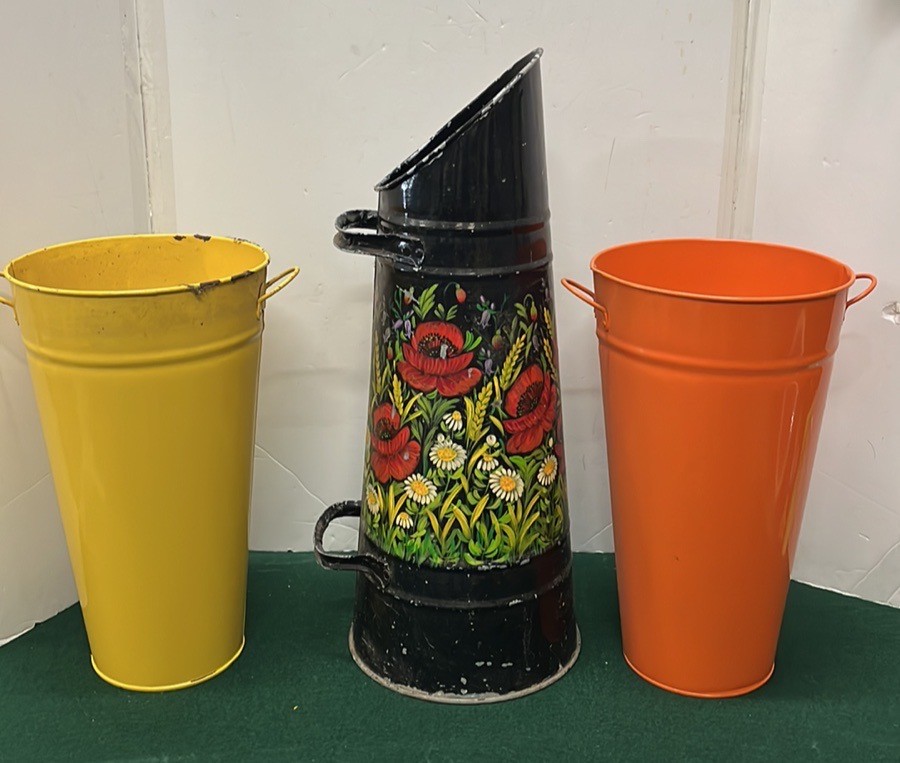 BARGE WARE COAL SCUTTLE AND TWO COLOURED FLOWER BUCKETS