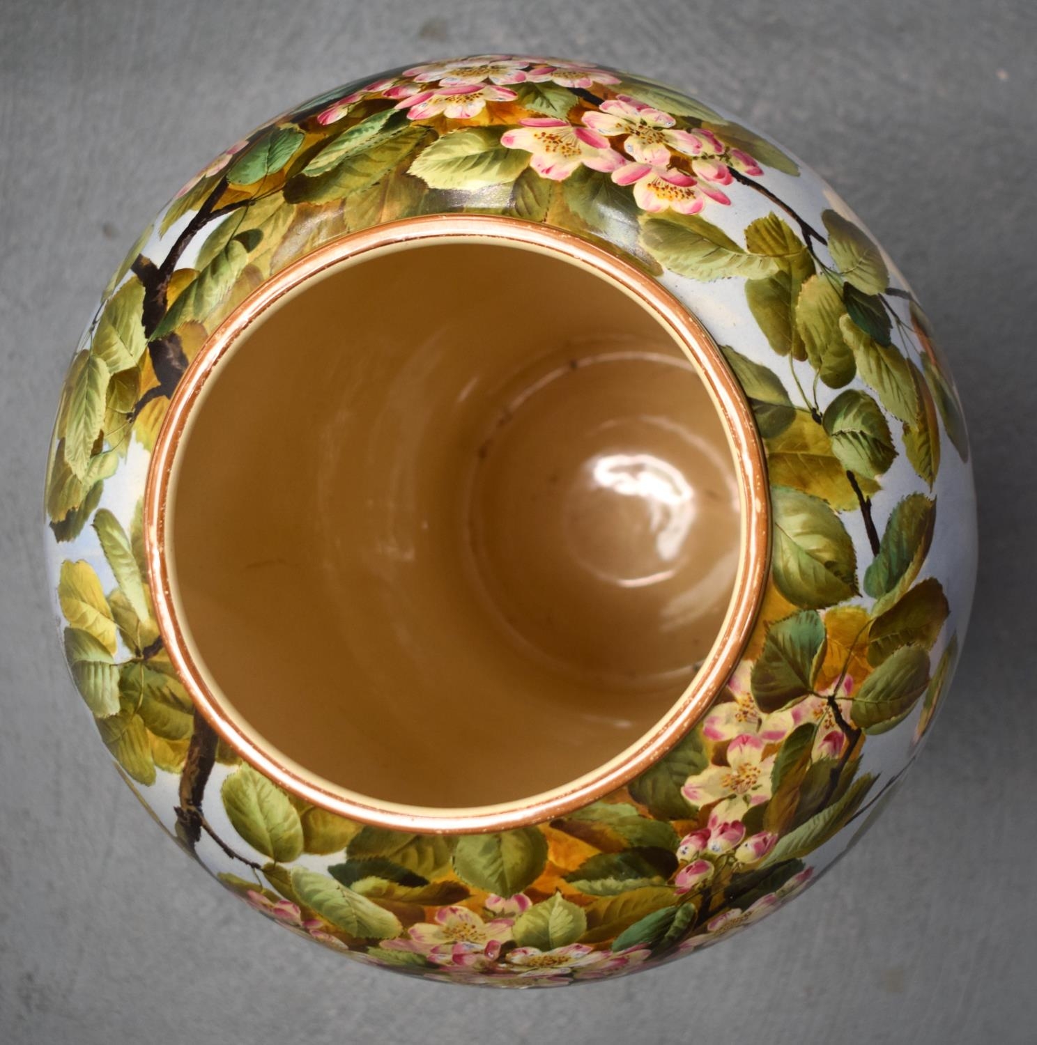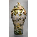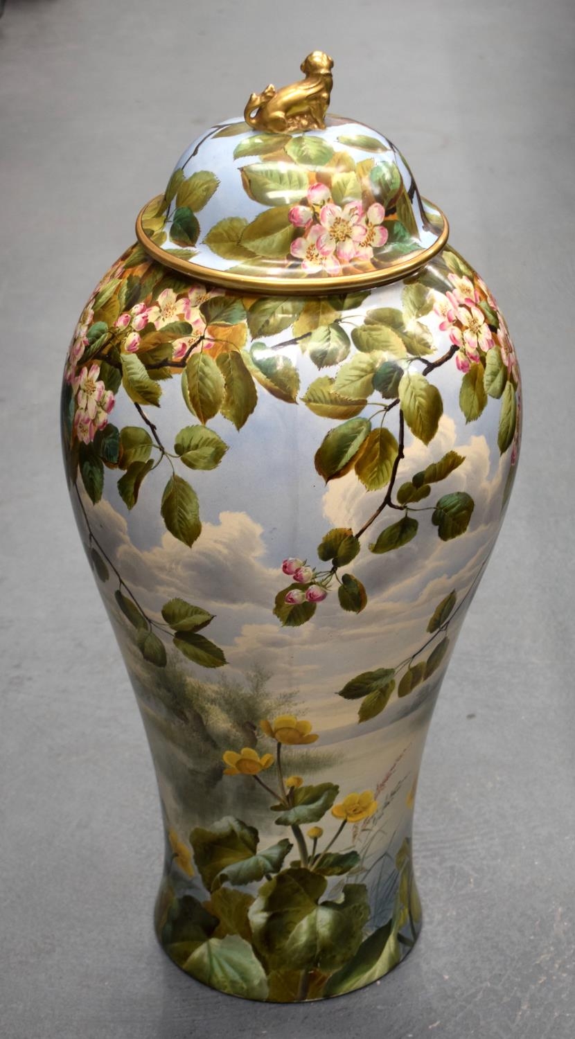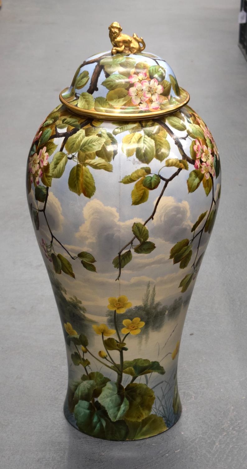 A LARGE 19TH CENTURY CONTINENTAL POTTERY FLOOR STANDING VASE AND COVER probably Minton or Burmantofts, painted with flowers. 68 cm x 20 cm.