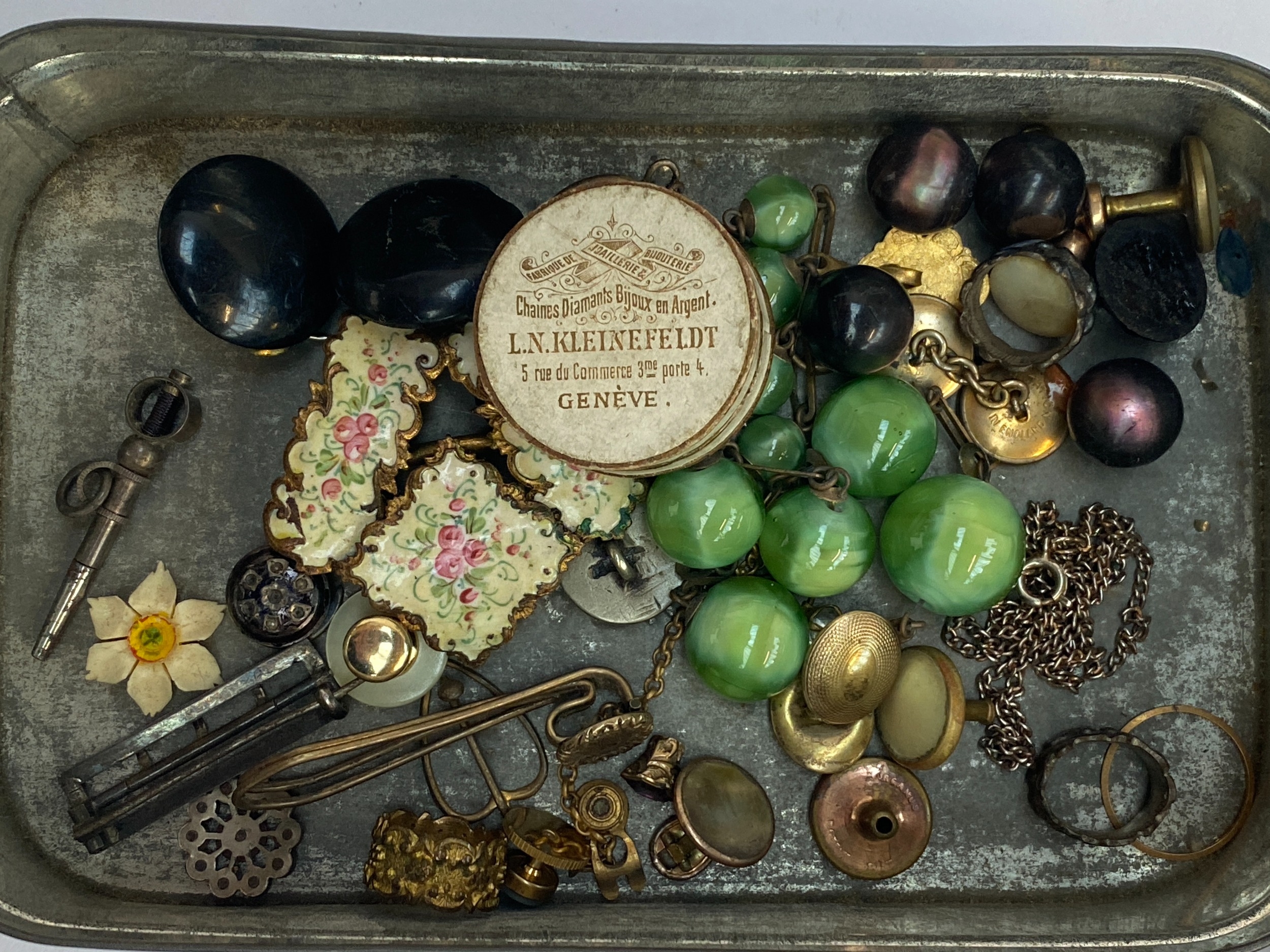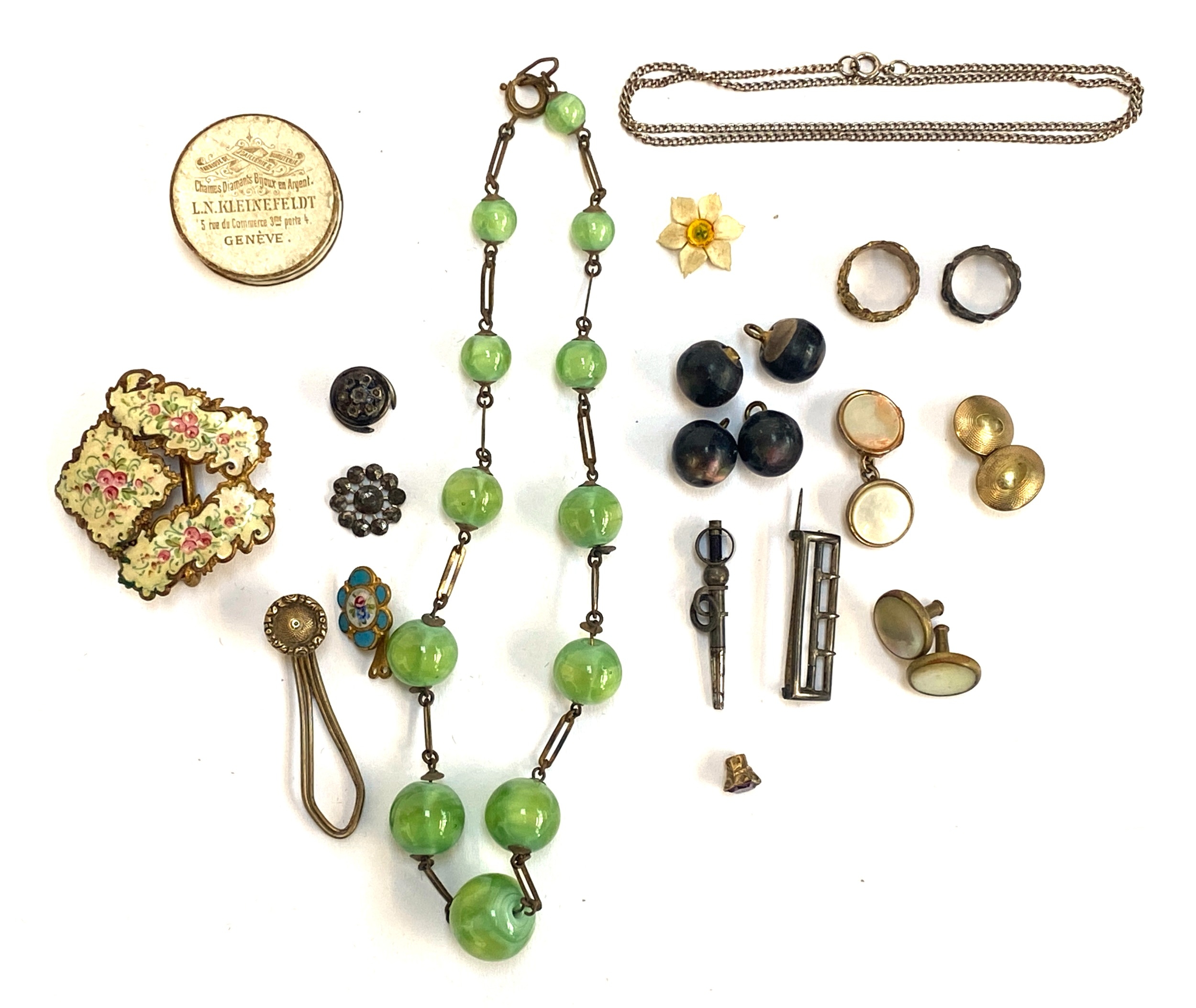 A mixed lot of jewellery and components to include gilt metal hair clip; half an enamel buckle decorated with roses; buttons include abalone shell; buckle brooch etc