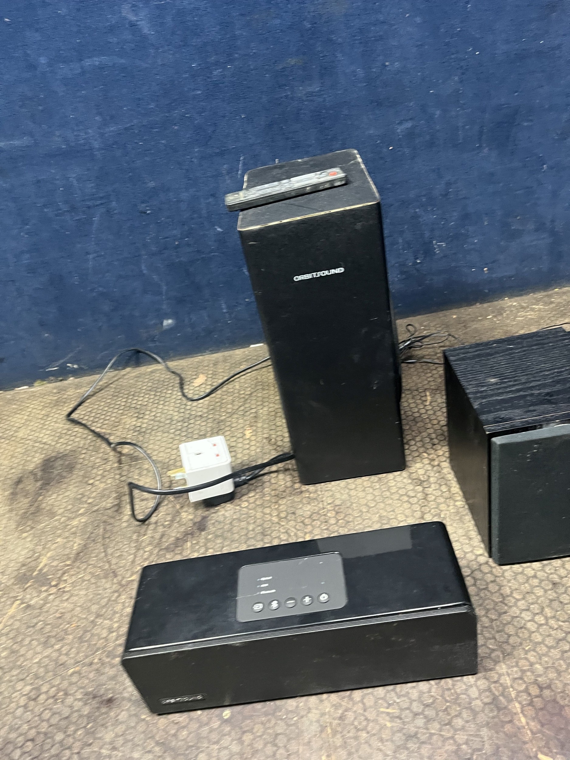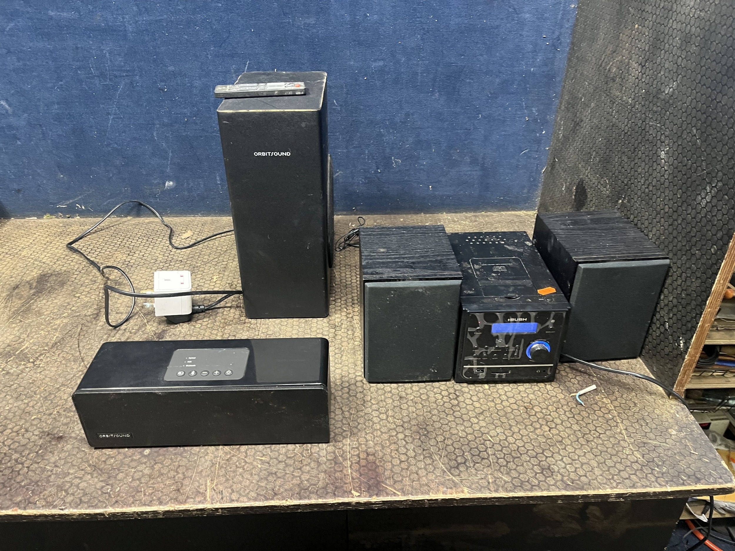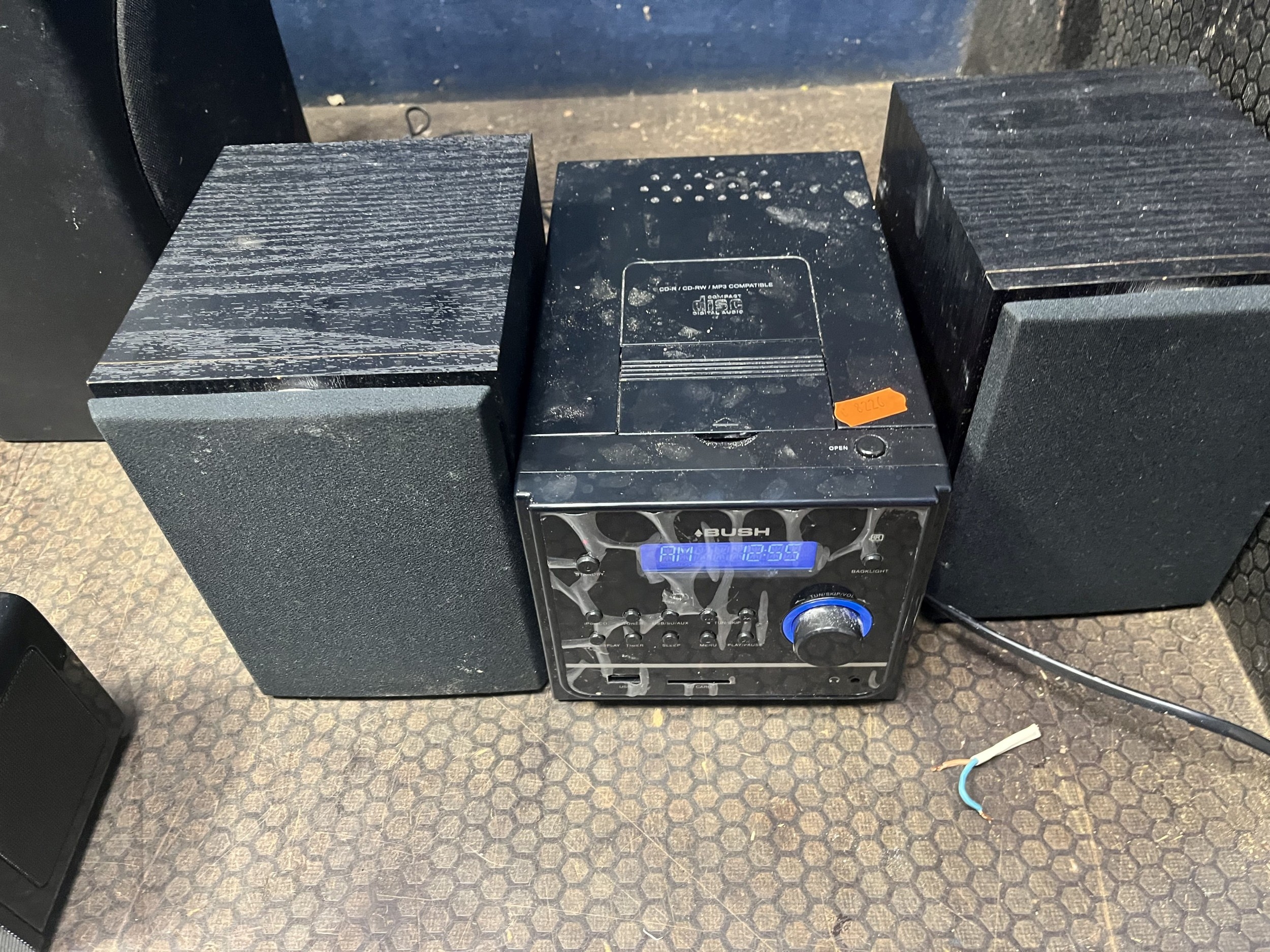 A BUSH HI FI with matching speakers (PAT pass and working) and an Orbit Sound subwoofer and soundbar (both untested) (5)
