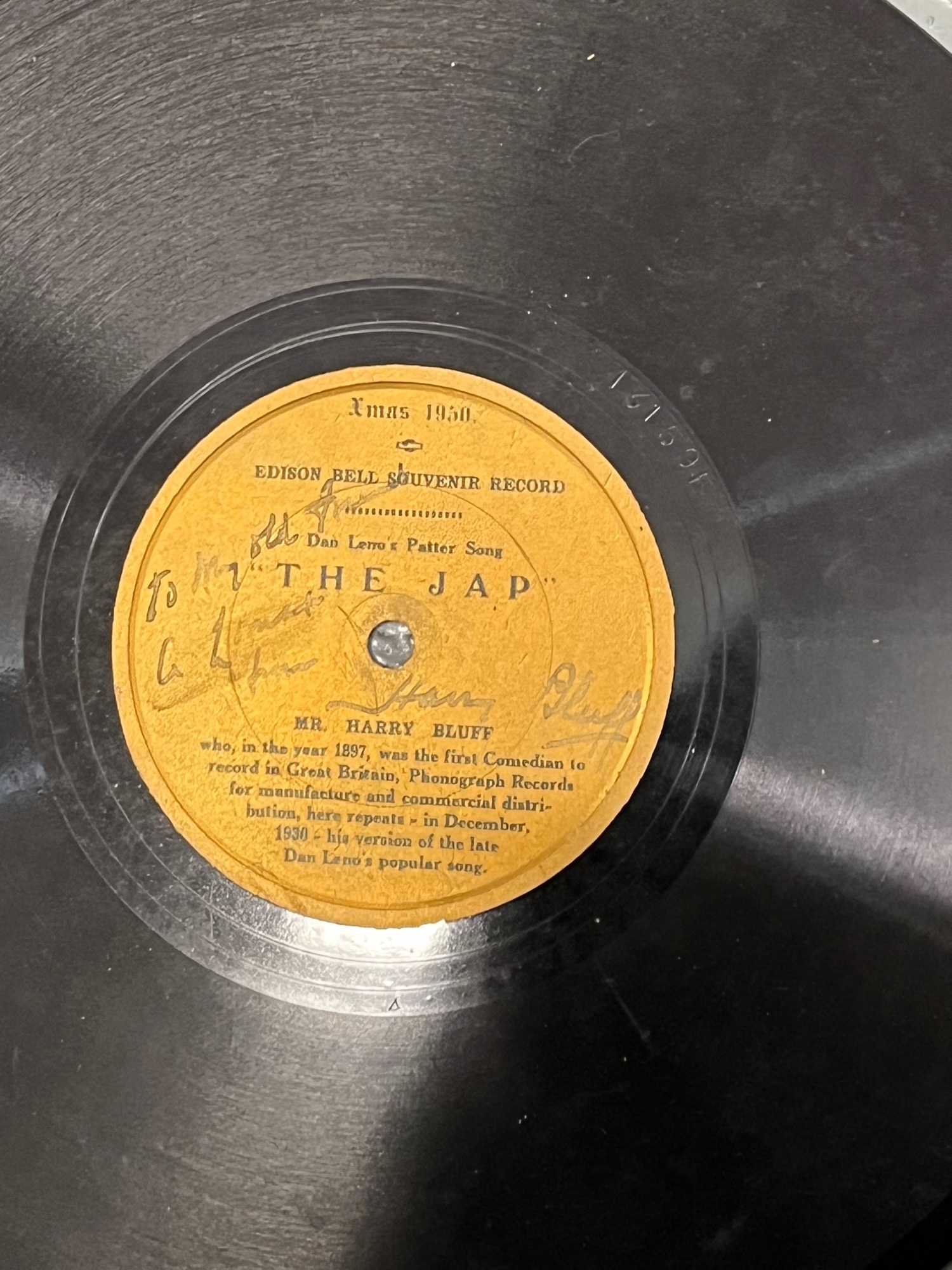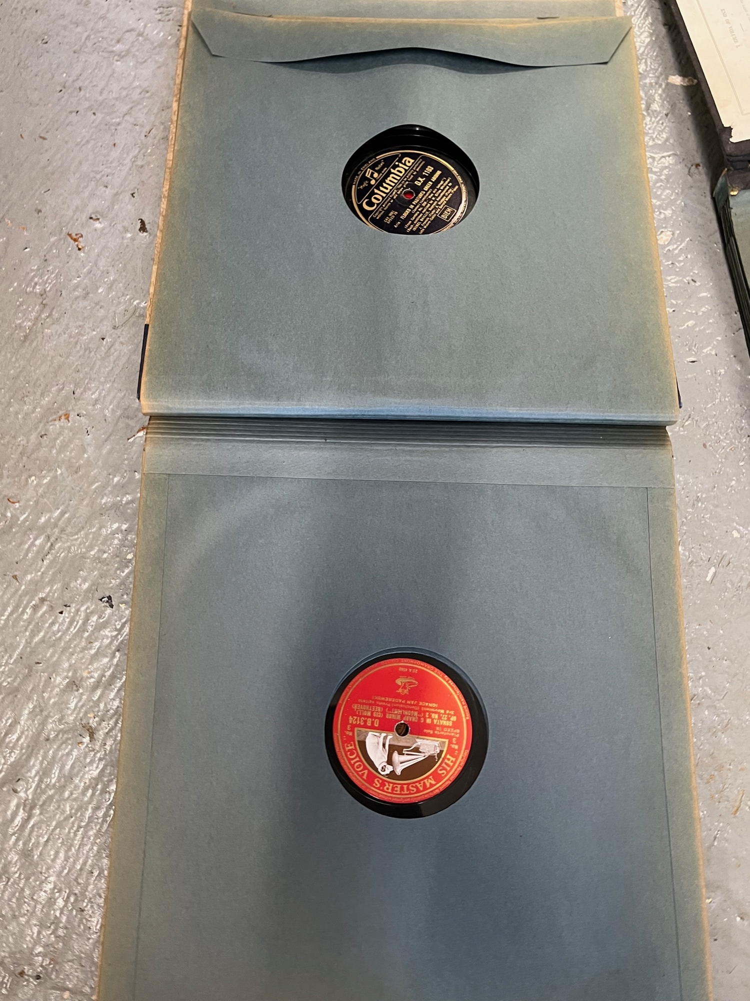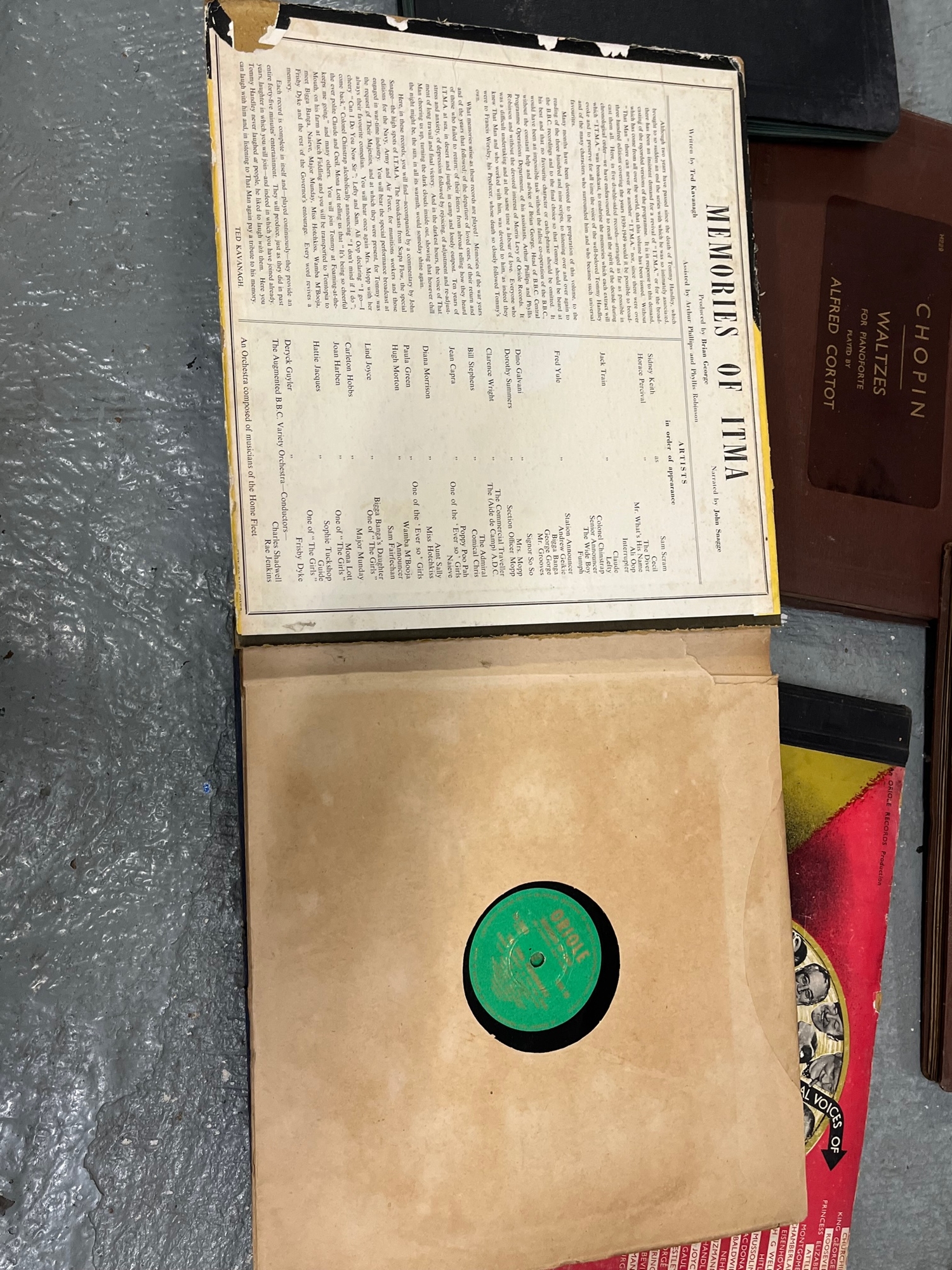 A selection of orchestral themed records in cases to include, A personally signed Edison Bell souvenir record Xmas 1950 record titled Dan Lenos Patterson the jap signed by Mr Harry Bluff, His masters voice, The sounds of time 1934-1949 and others.