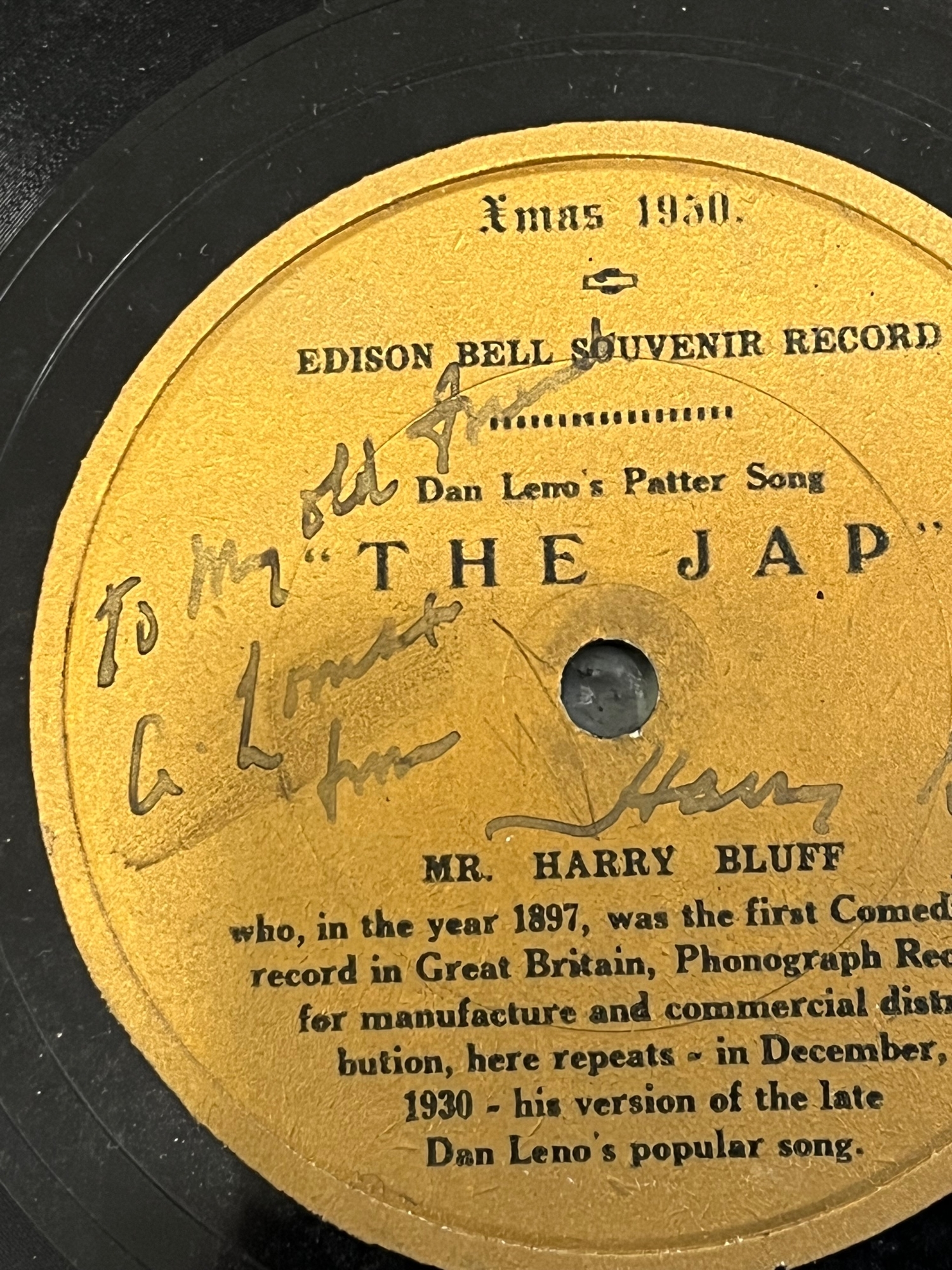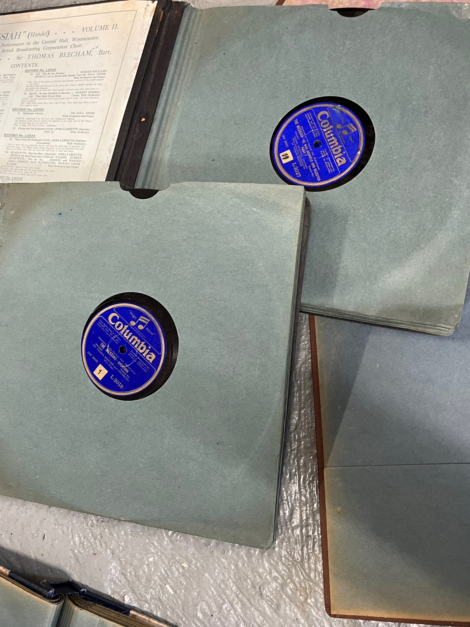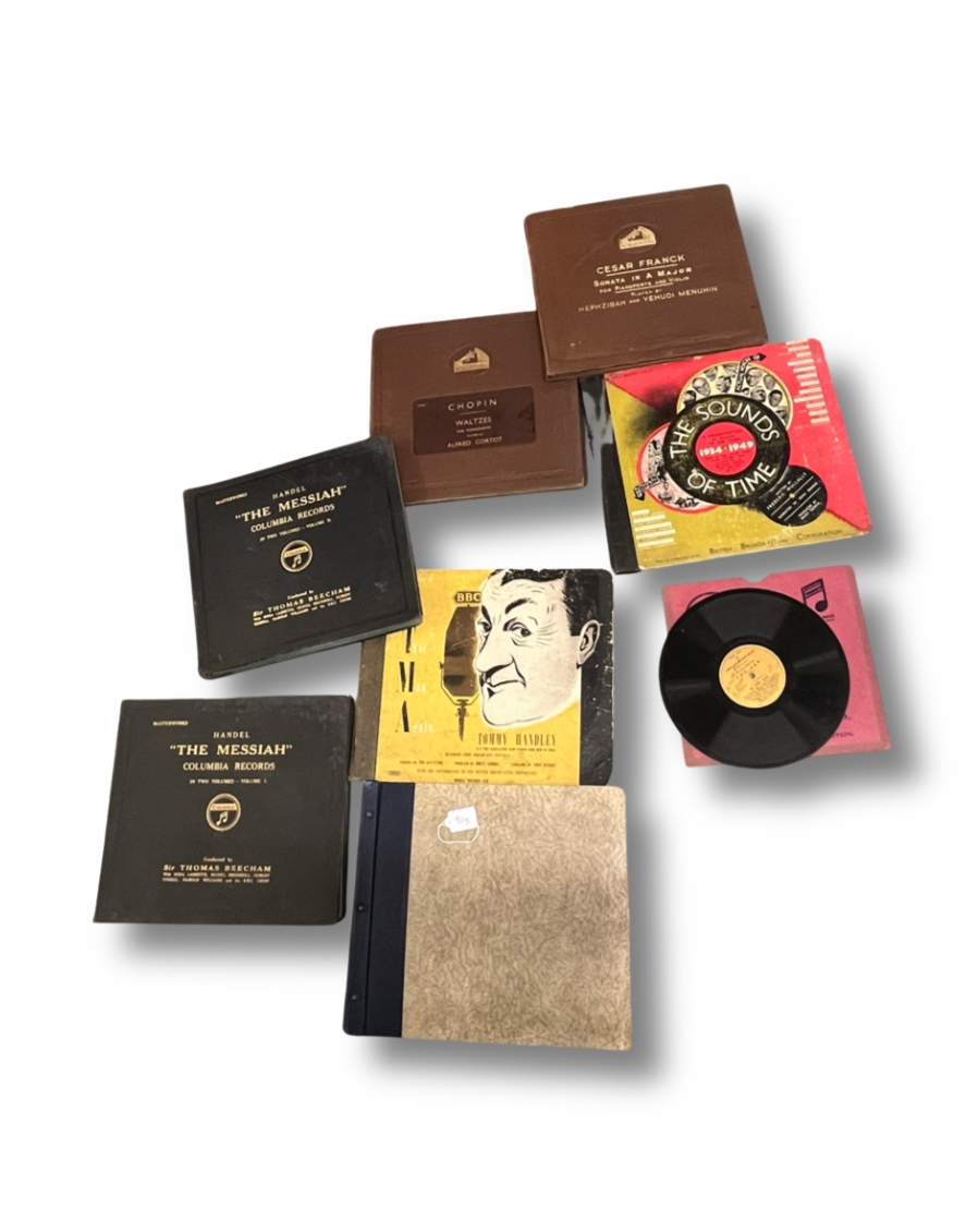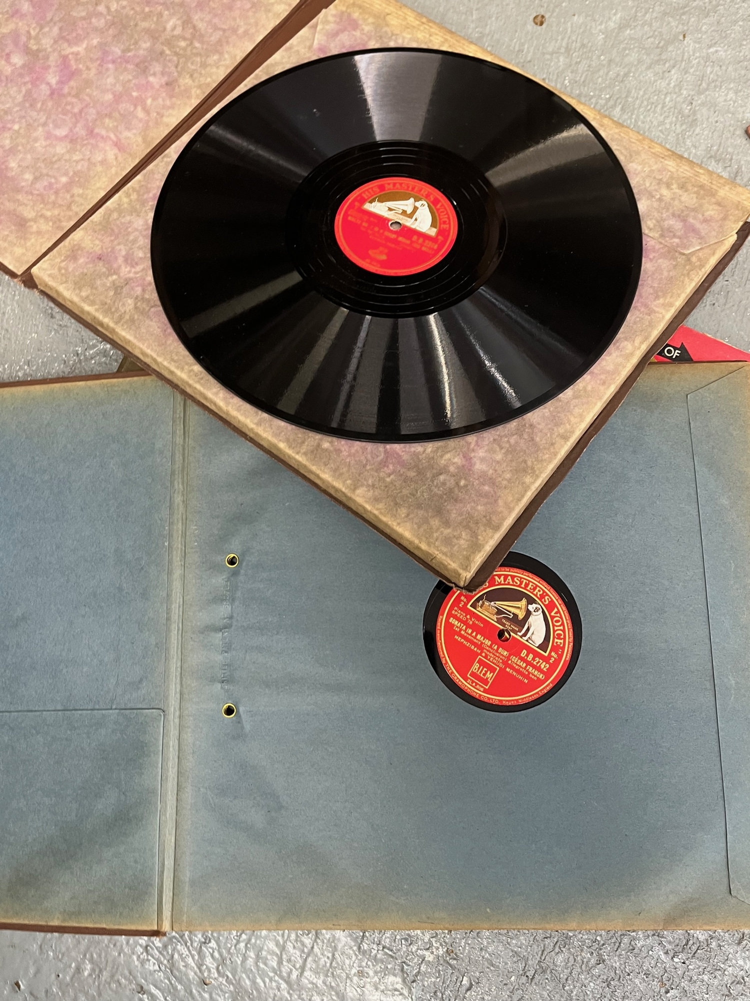 A selection of orchestral themed records in cases to include, A personally signed Edison Bell souvenir record Xmas 1950 record titled Dan Lenos Patterson the jap signed by Mr Harry Bluff, His masters voice, The sounds of time 1934-1949 and others.