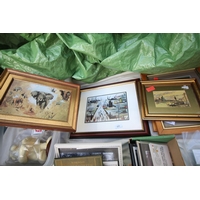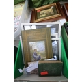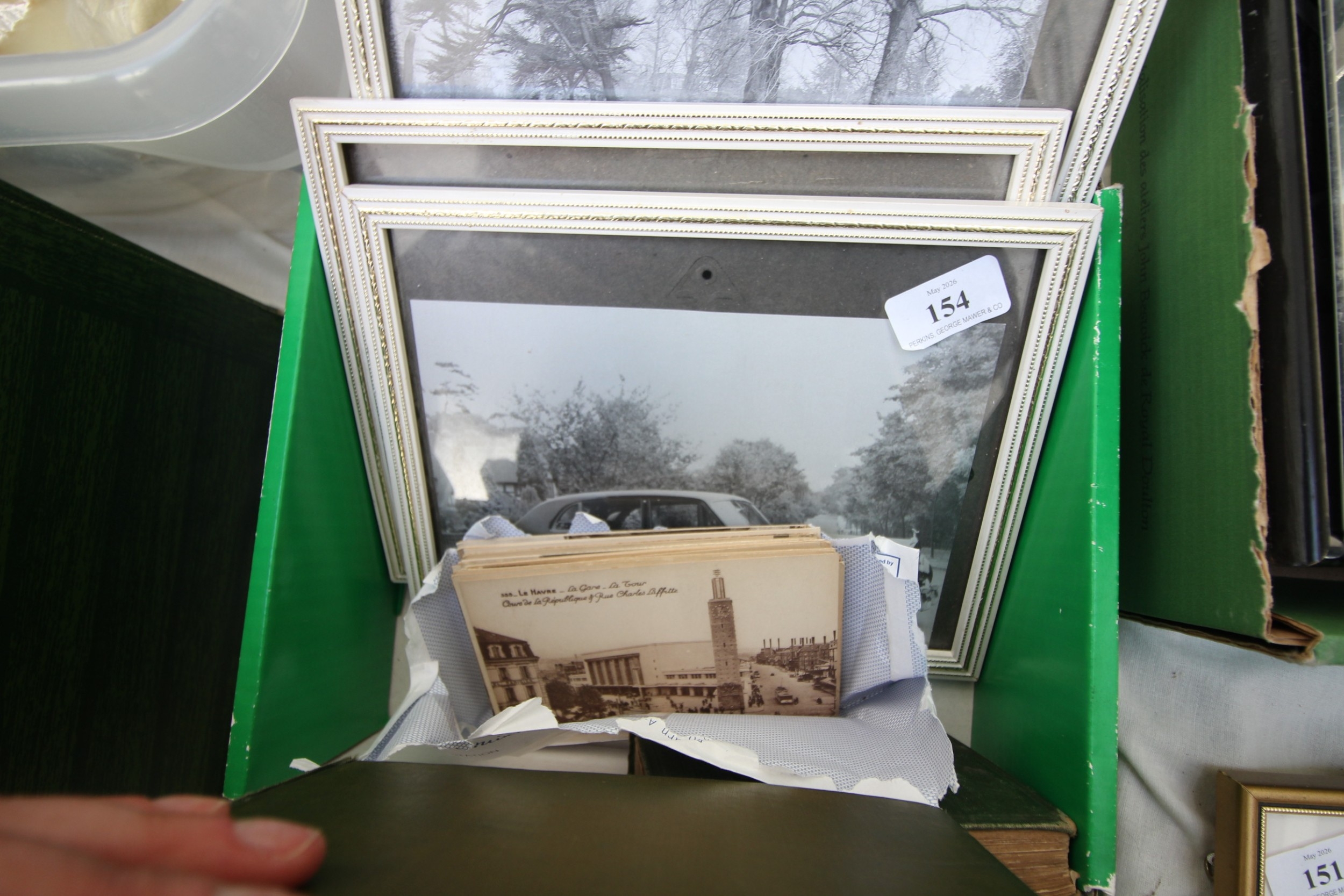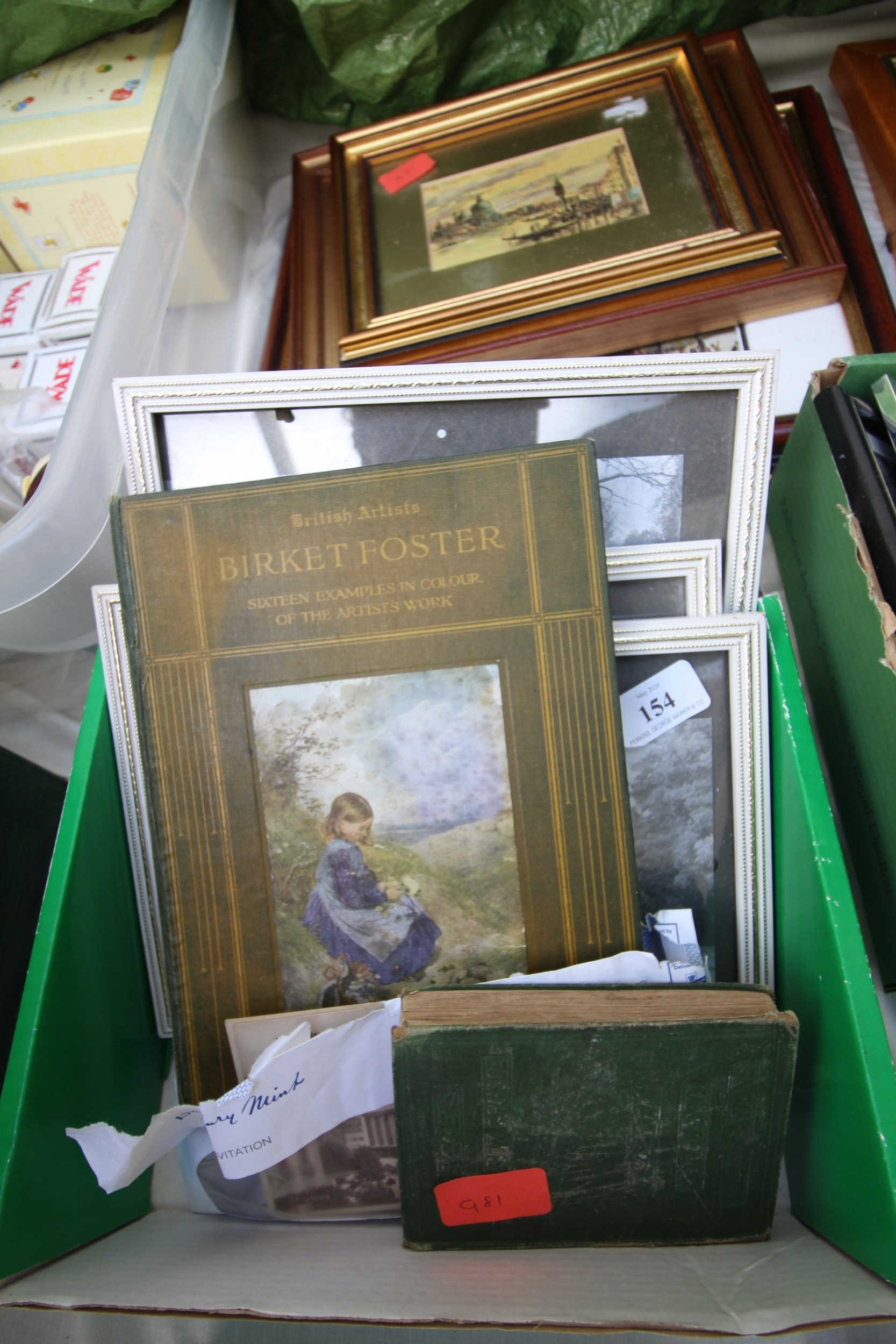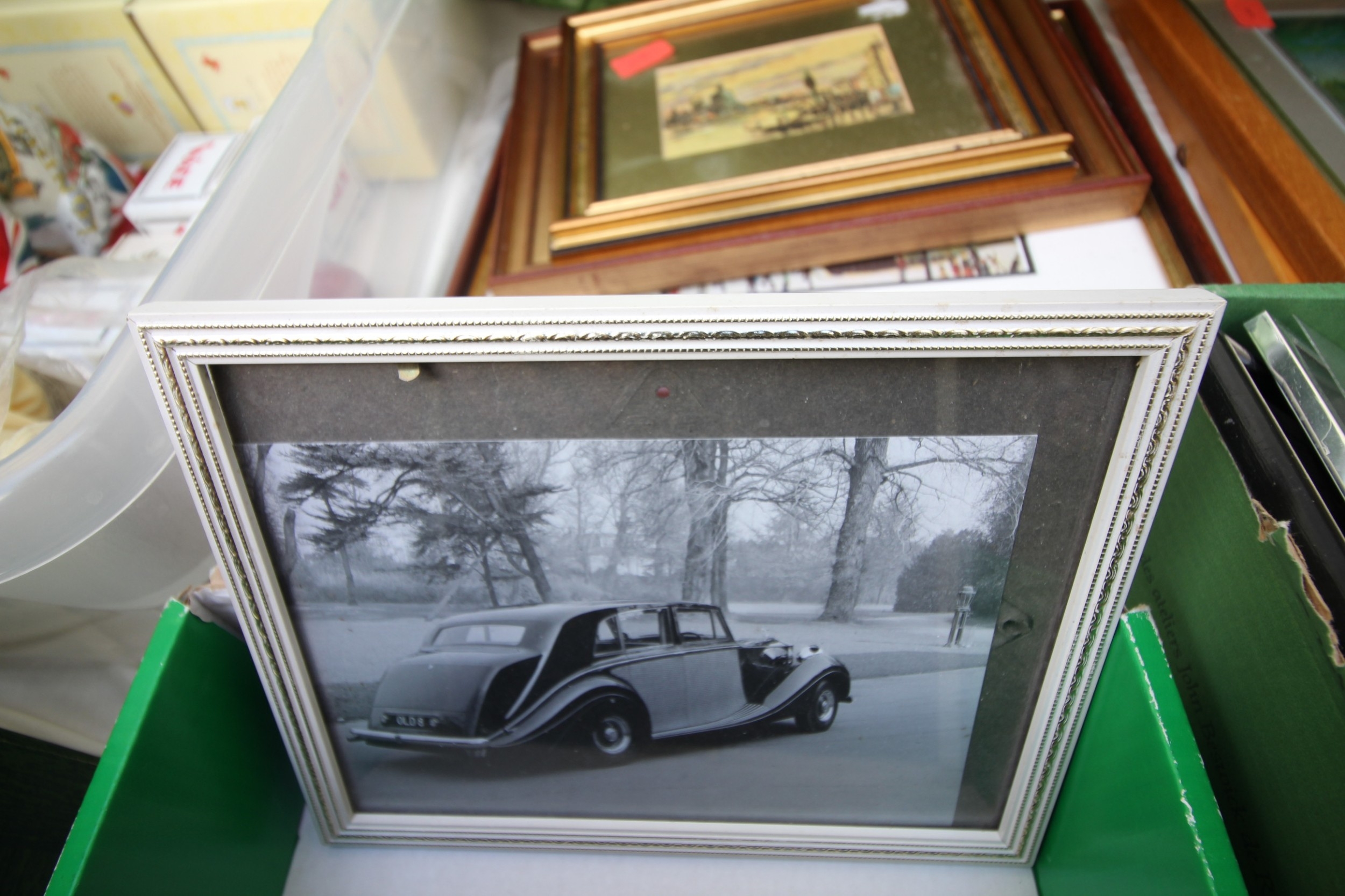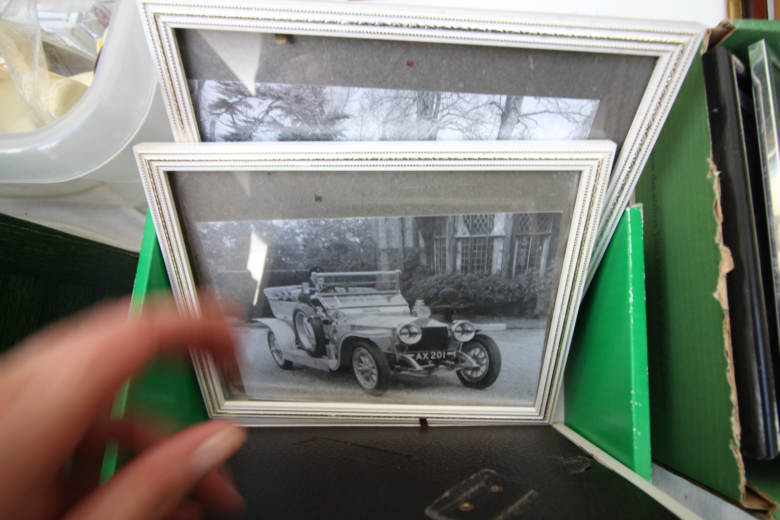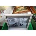 3 framed vintage car photographs in frames, book British Artist Burkitt Foster, book Robinson Crusoe and series of postcard photographs