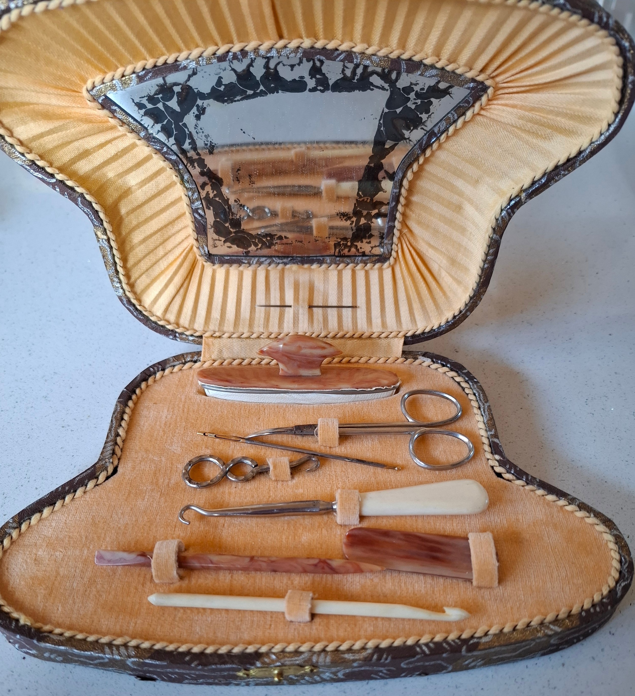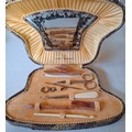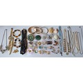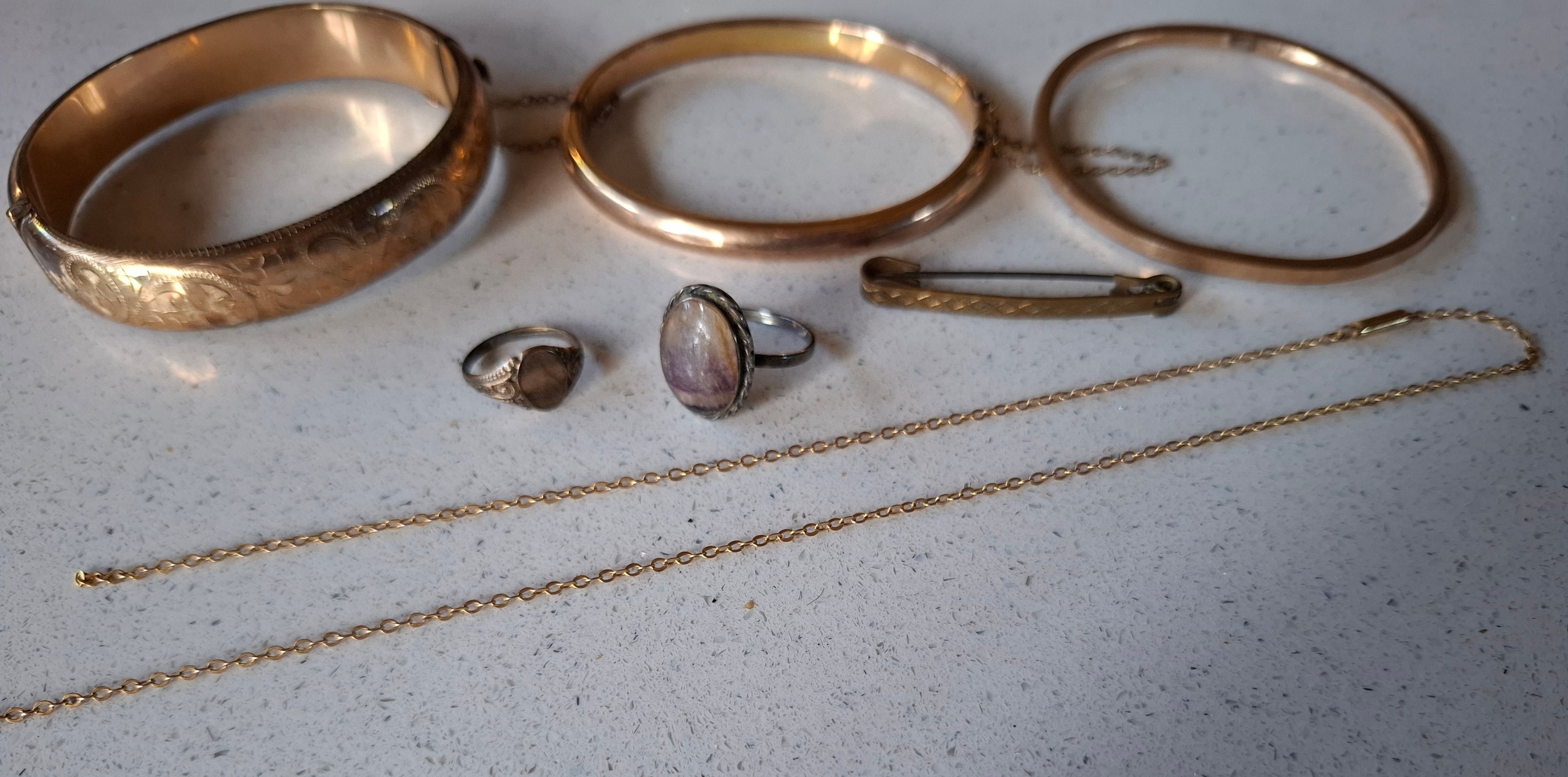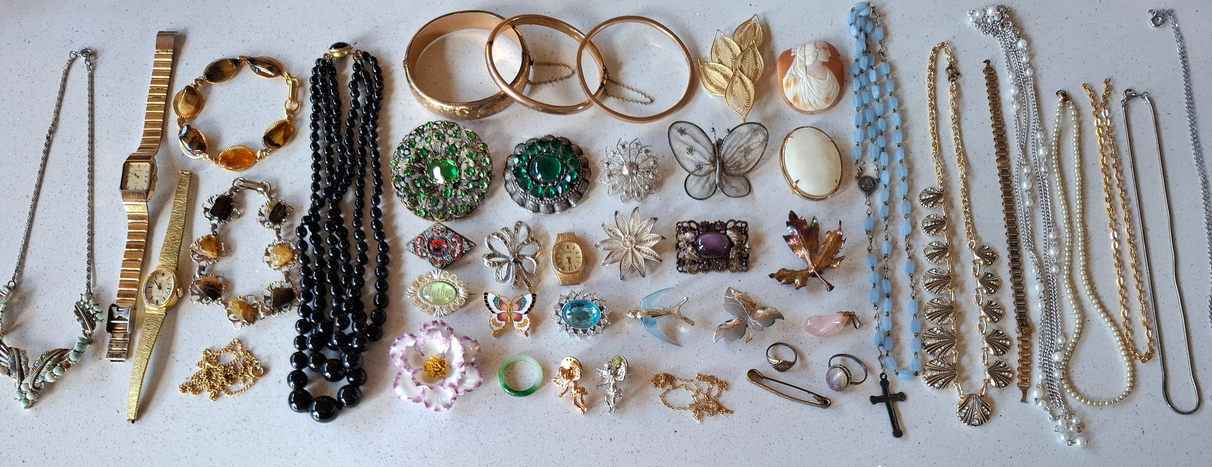 Vintage costume jewellery to include a rolled gold engraved and hinged bangle and 2 other yellow metal bangles, paste stone brooches, 2 white metal filigree brooches, an unframed cameo, a micro-mosaic brooch, a West German black multi-string necklace, a rosary, 2 ladies watches to include Pulsar, a silver 3 leaf brooch, 2 Kirks Folly cherub pin brooch, a 9ct gold chain A/F, a yellow metal bar brooch, a silver agate ring and a very small yellow metal signet ring together with an early 20th Century manicure set. Location: CAB