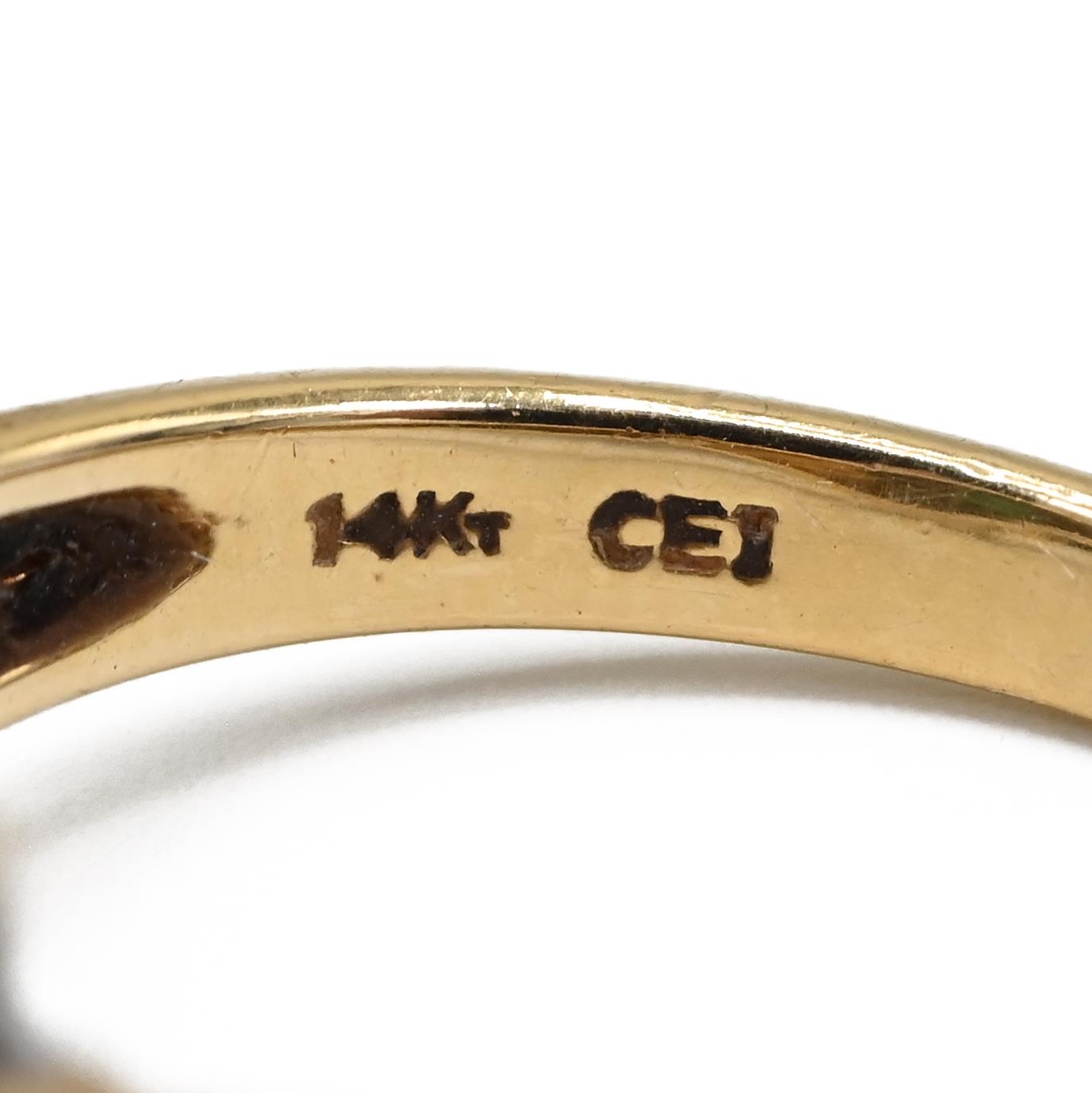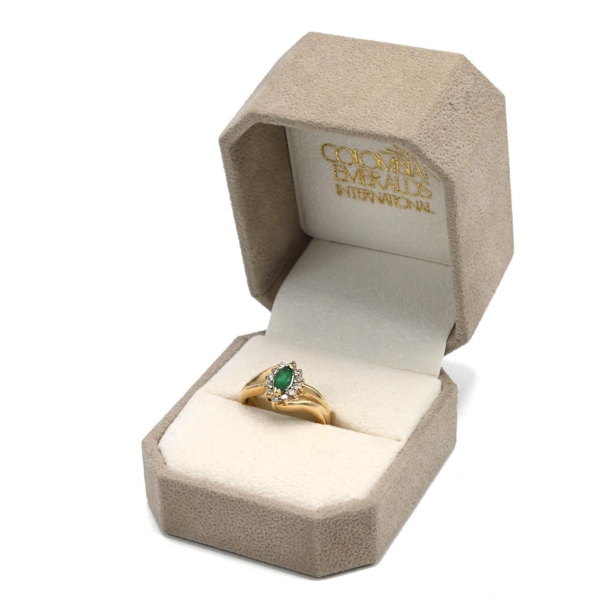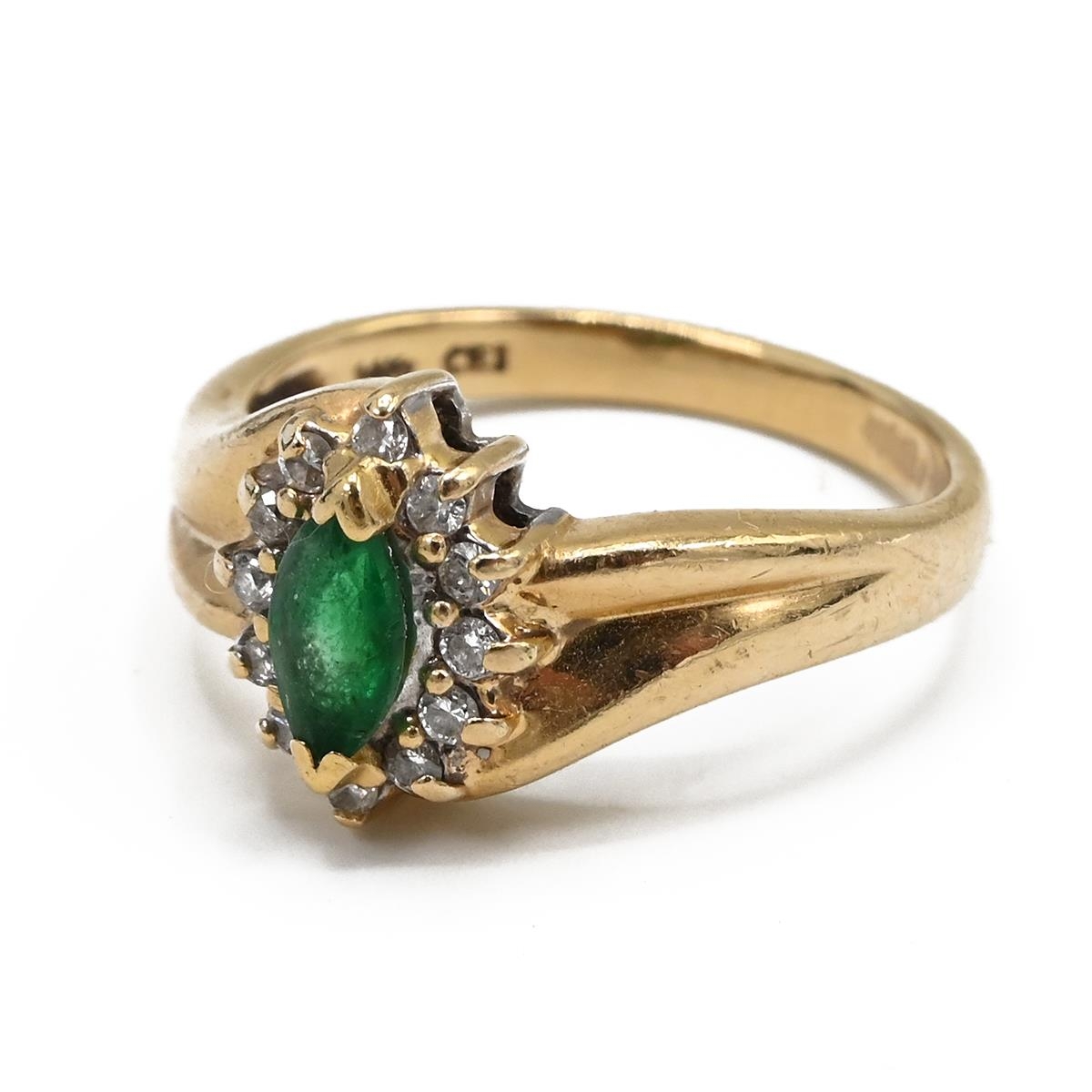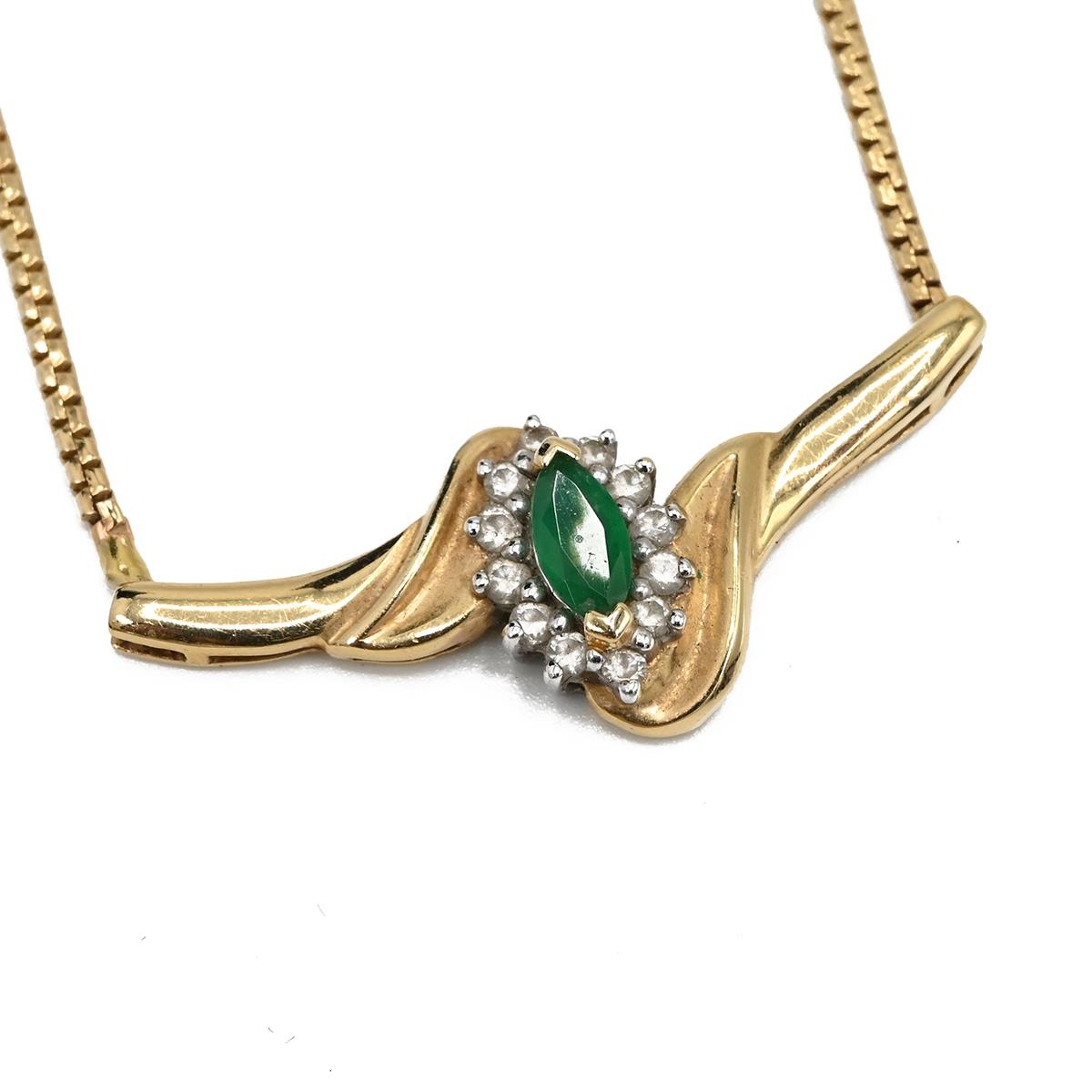 A 14ct gold and emerald ring and diamond cluster ring, set with pear shaped emerald, finger size M 1/2, along with matching necklace 10.53 grams. (J)