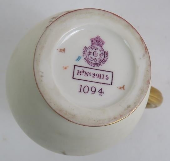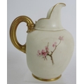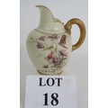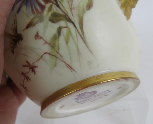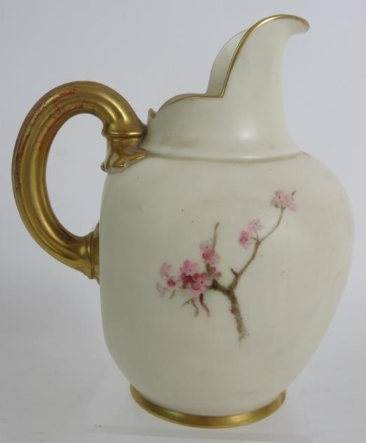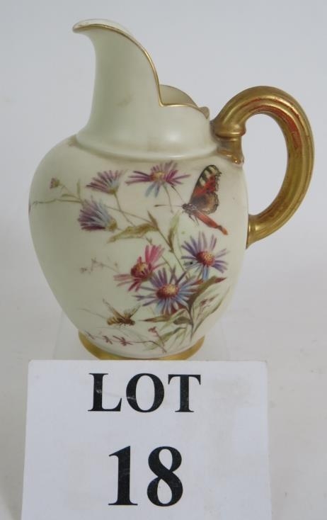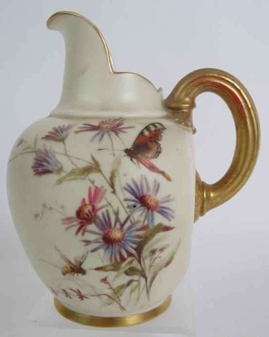 A Royal Worcester blush ivory jug with flower and butterfly decoration reg No 29115, circa 1885. Indistinctly signed. Height 13.5cm.