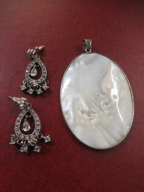 OVAL MOTHER OF PEARL PENDANT AND A PAIR OF SILVER EARRINGS