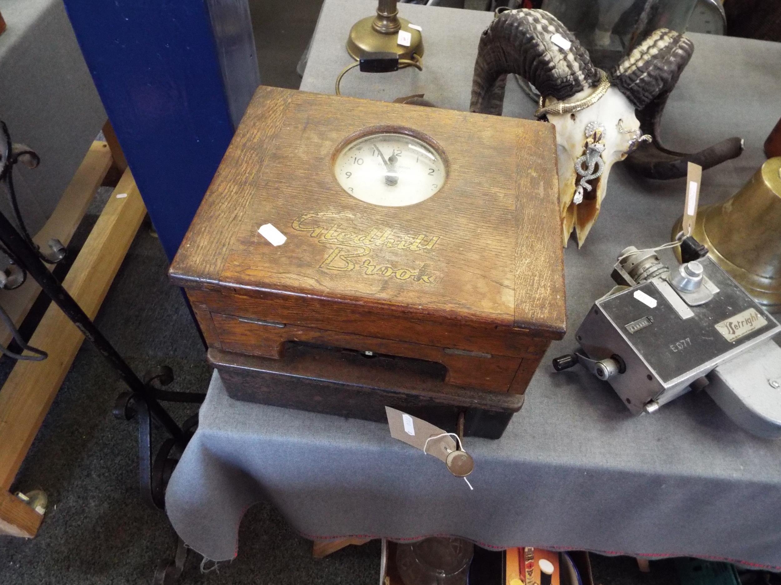 A vintage oak cased time recorder clocking in machine by Gledhill Brook (clock is working)