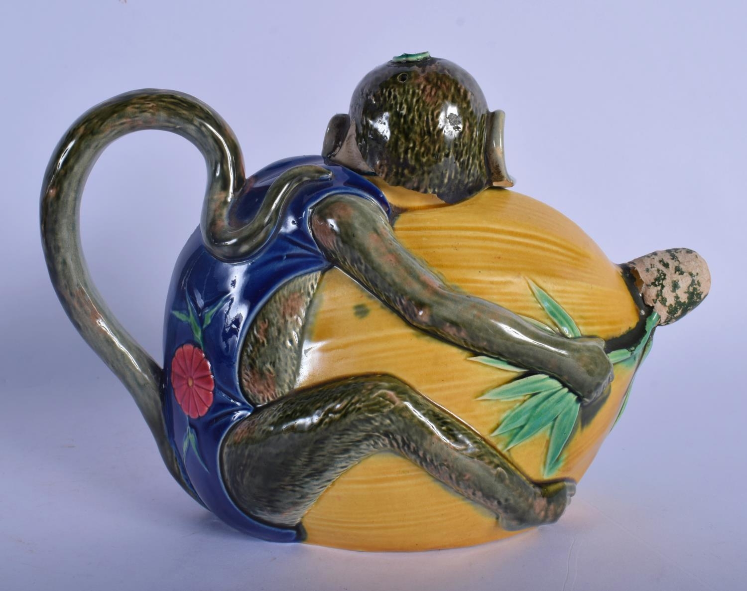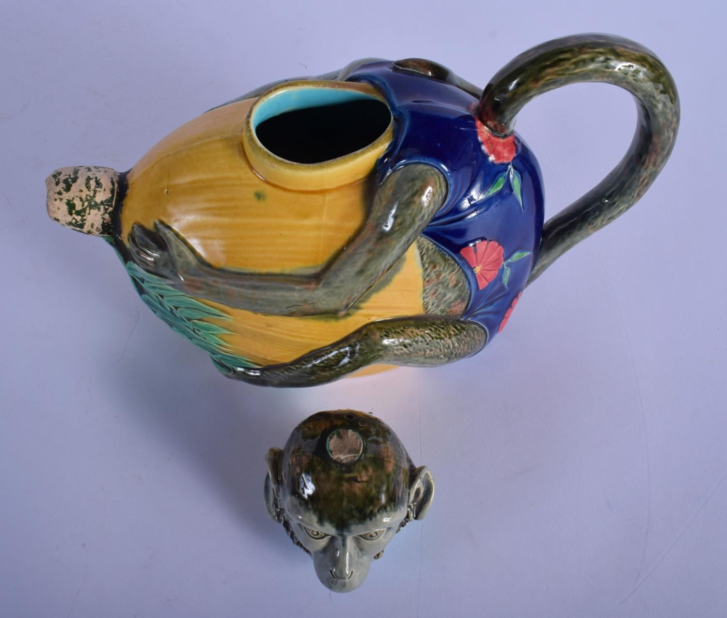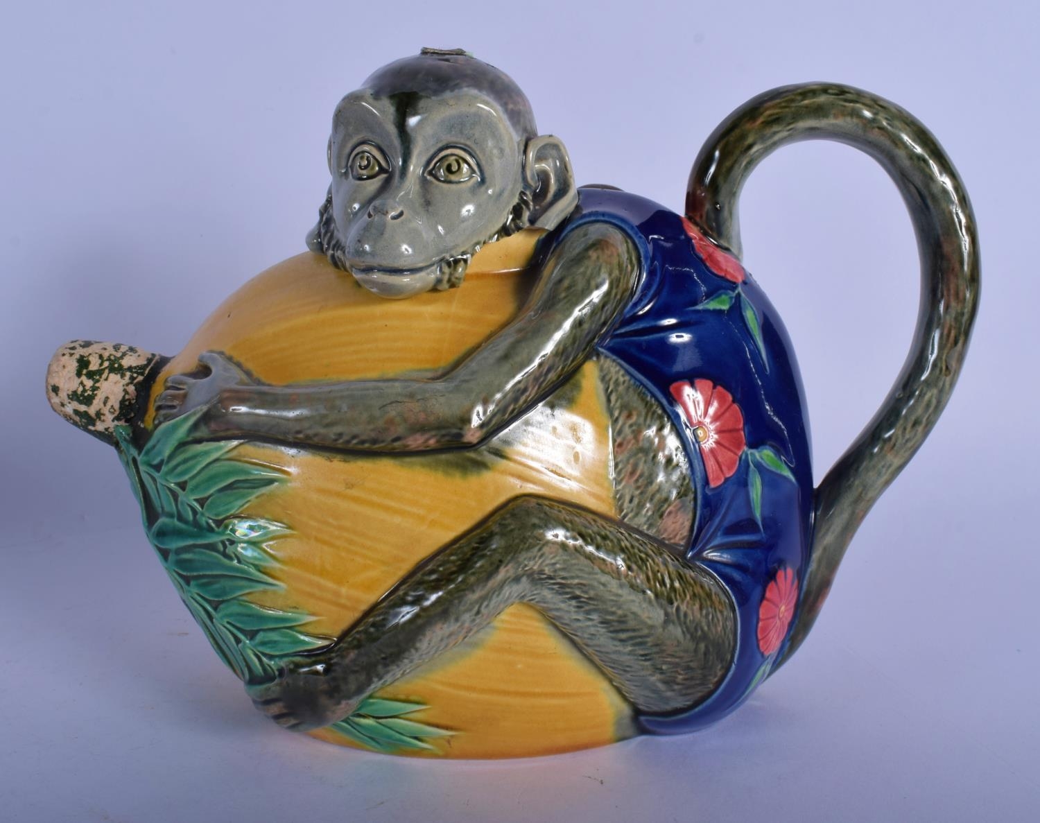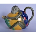 A RARE 19TH CENTURY MINTON MAJOLICA TEAPOT AND COVER in the form of a monkey. 21 cm x 17 cm.