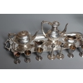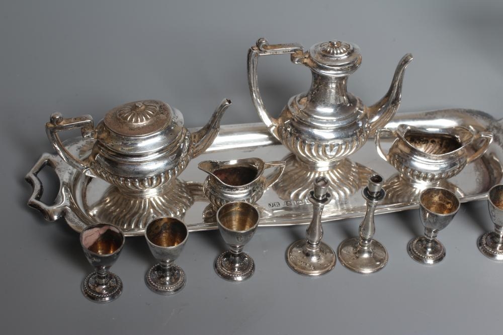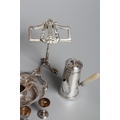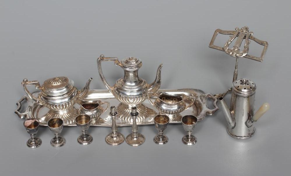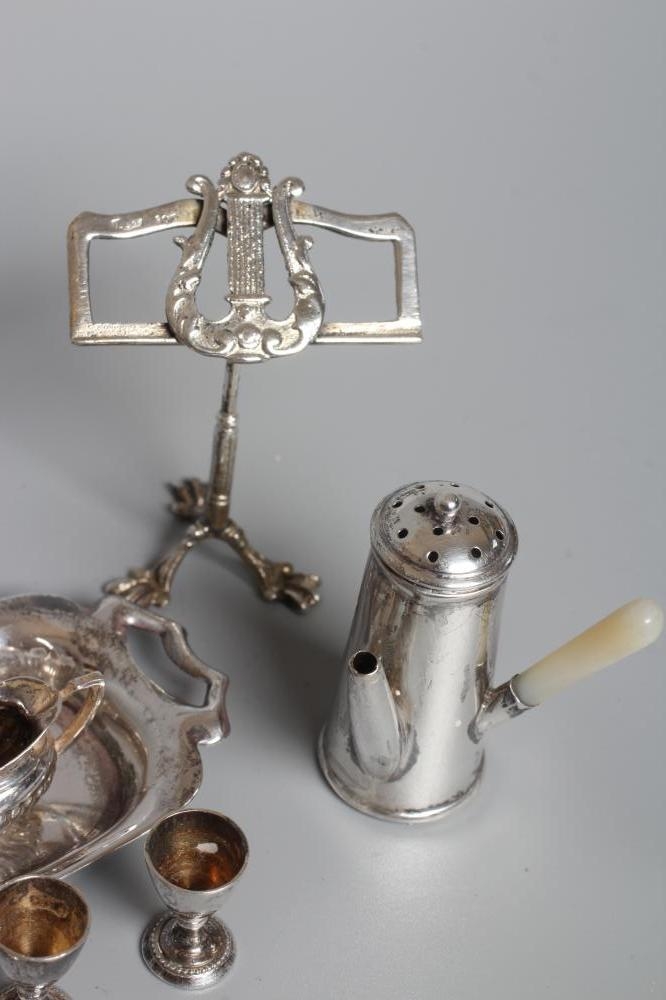 A COLLECTION OF SILVER TOYS comprising a novelty café-au-lait pepperette by William Vale, Birmingham 1900, with mother-of-pearl angular handle, 1 3/4" high, a four piece tea and coffee service with matching tray, all by John Rose, Birmingham 1965, tray 5 3/4" long, a pair of candlesticks, maker's mark DWM, London 1965, 1" high, a set of five goblets by J & J Maxfield Ltd., Sheffield 1902, 3/4" high, 3ozs total gross, together with an 800 standard music stand place card/menu holder, 2 1/4" high (Qty)