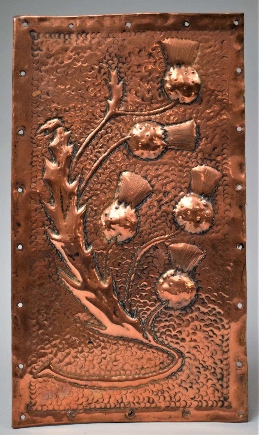 A Hand Hammered Embossed Arts and Crafts Rectangular Panel Decorated with Thistles, Possibly Glasgow School, 35.5x20cm