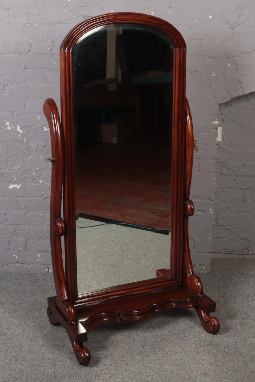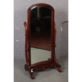 A large ornate mahogany cheval mirror, with bevel edge glass.