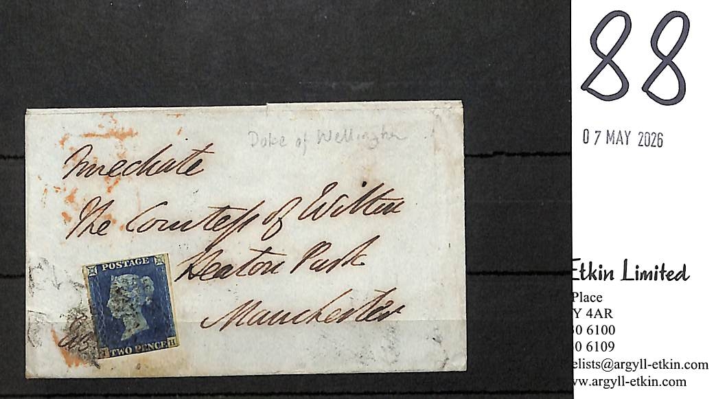 1843 (Sep 14) Small cover from Walmer franked 1840 2d blue plate 2 IH, three margins, just touched at base, tied by a very smudged black Maltese Cross, addressed in the Duke of Wellington s handwriting to "The Countess of Witton, Heaton Park, Manchester", the reverse with "WALMER" undated circle and red wax seal impressed with the Dukes arms.