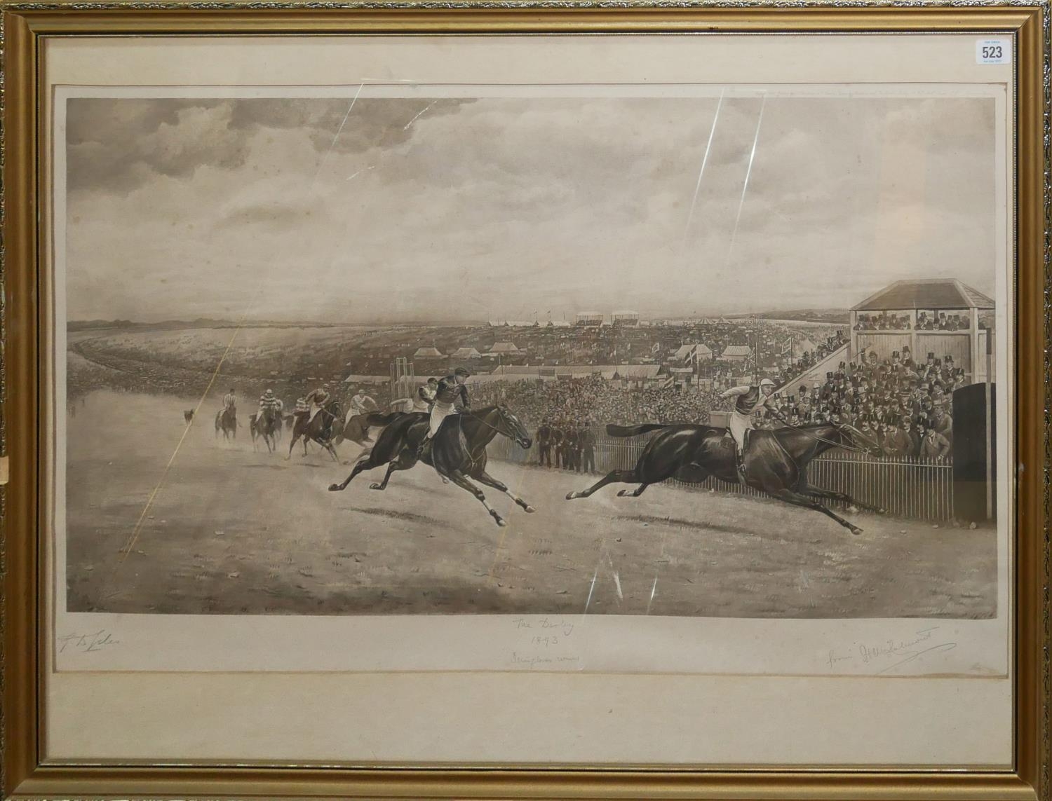 Horse racing scene, titled 'The Derby 1893', signed in pencil in margin, framed and glazed.