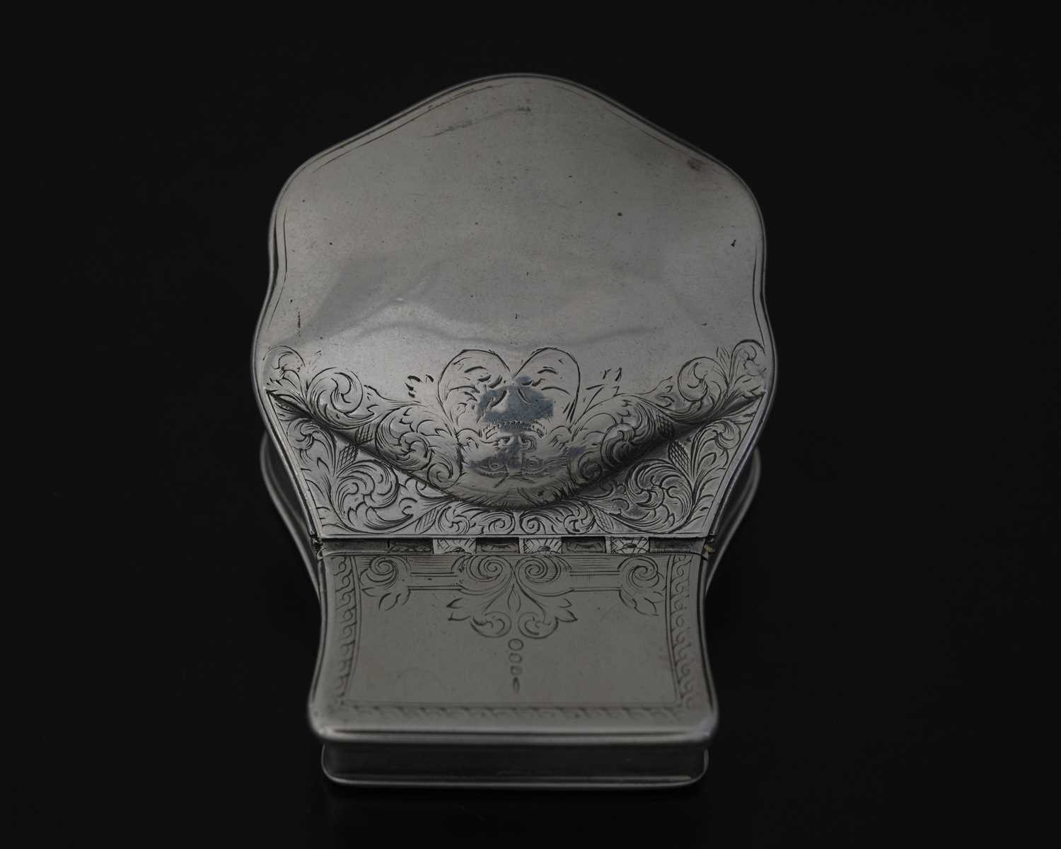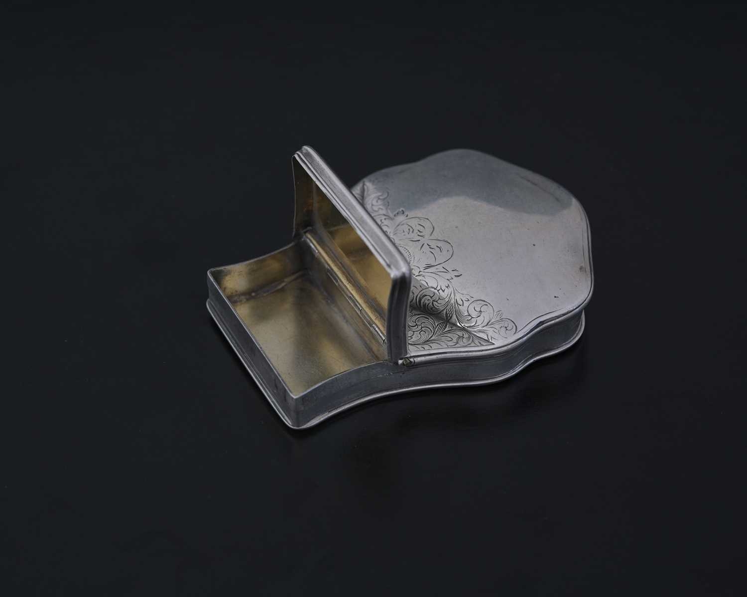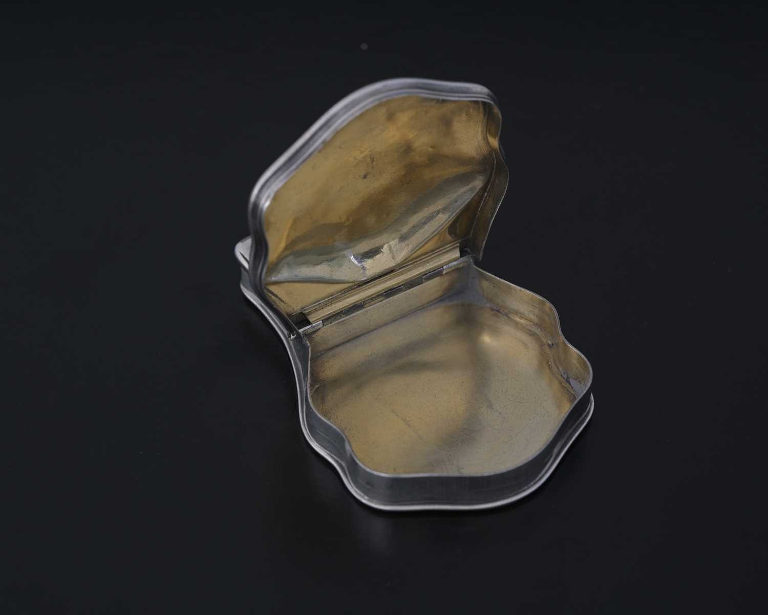 An early eighteenth-century silver snuff box, English circa 1720-40, of stylised shell form, decorated with scrollwork, with dual hinged compartments, each with gilt interior, apparently unmarked, length 7.2cm, weight 65g/2.08ozt approx