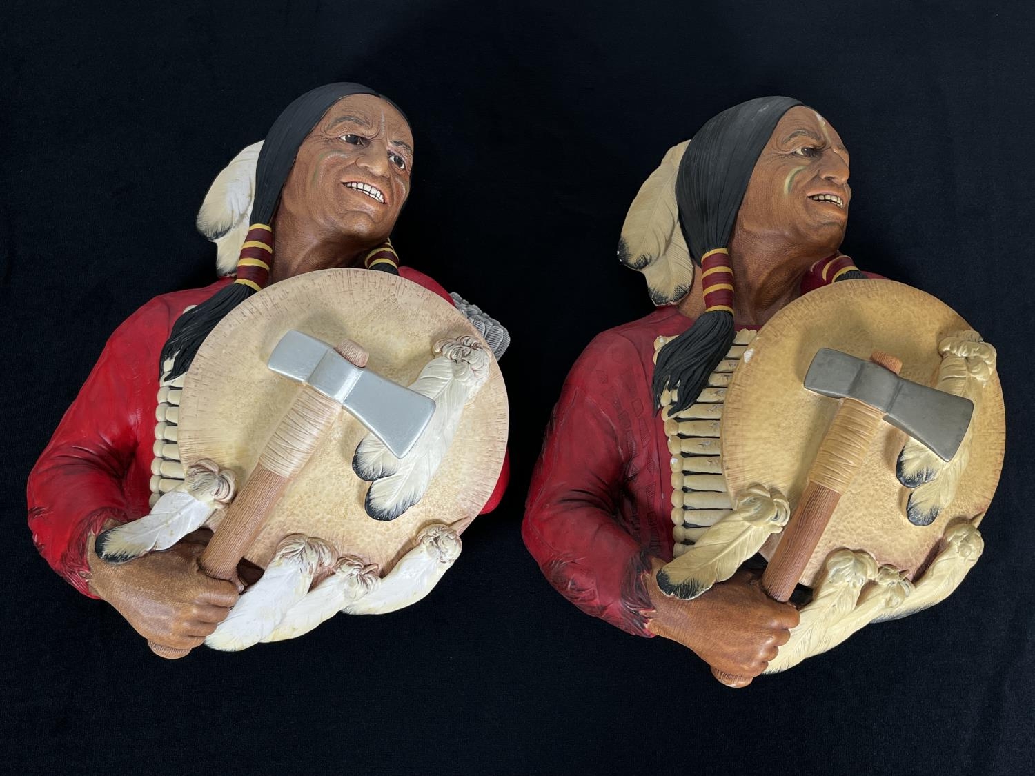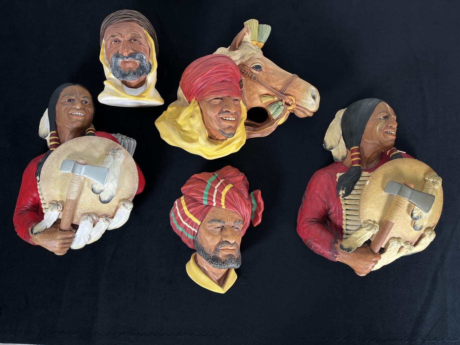 Five Bossons chalkware head wall masks and ornaments comprising Lords of The Desert, Abdhul, Moroccan yellow painted version and two Cheyenne