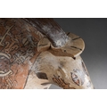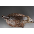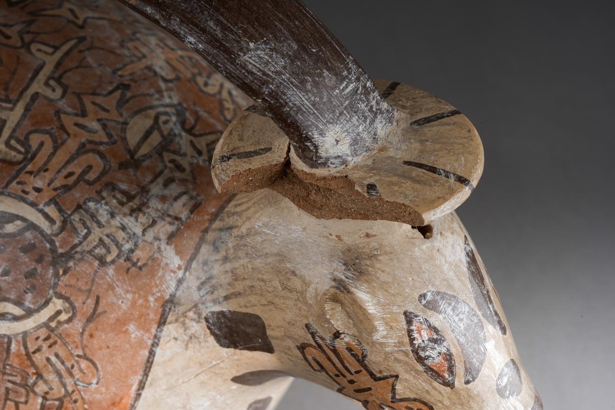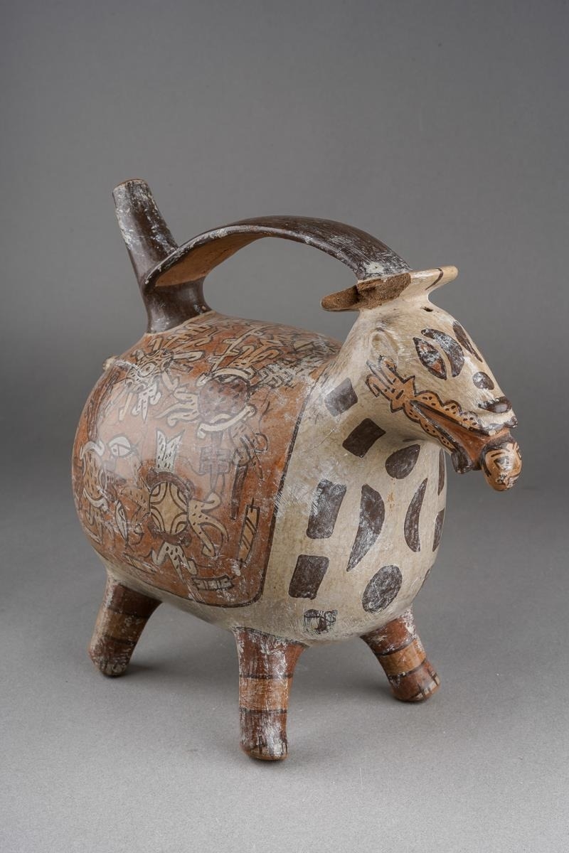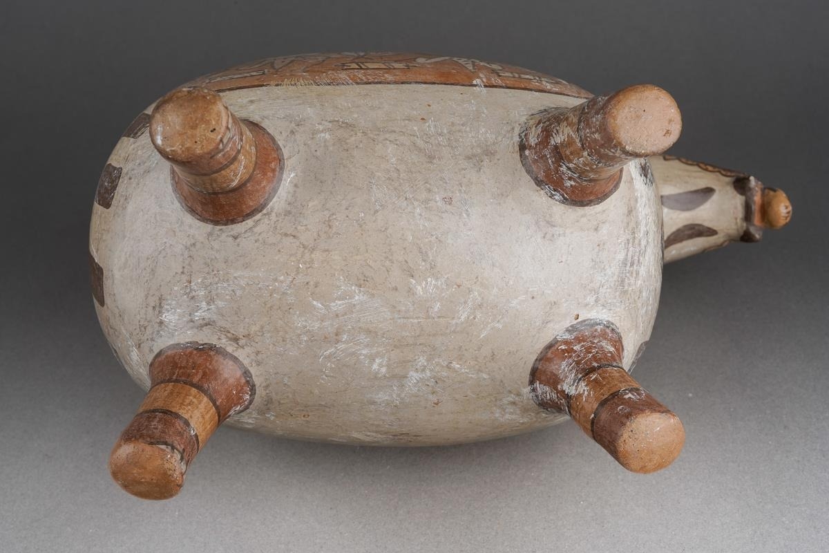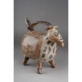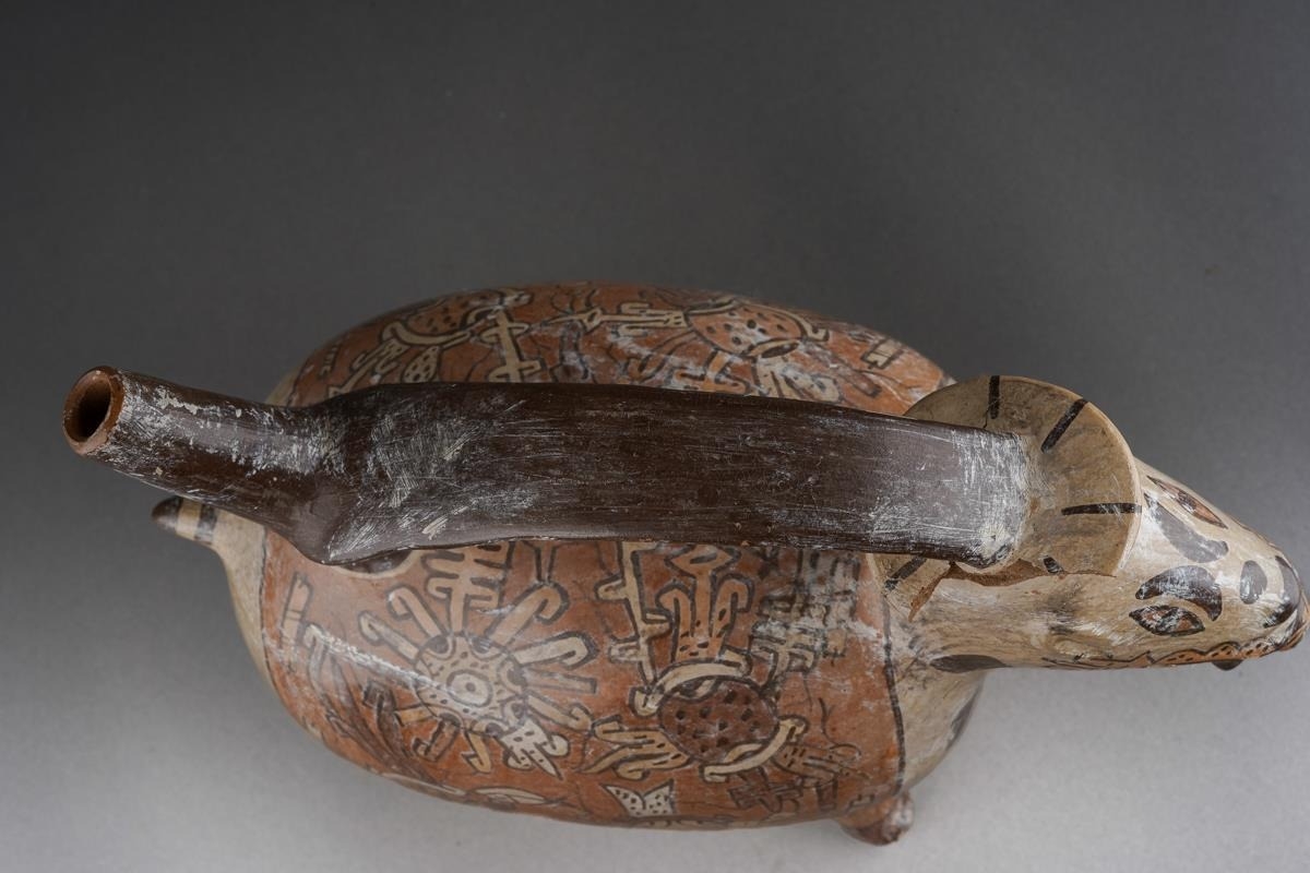 Pre Columbian Moche pottery stirrup spout vessel in a form of an animal with a human head sticking out of his mouth , approx. 21 cm tall and 23 cm long