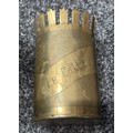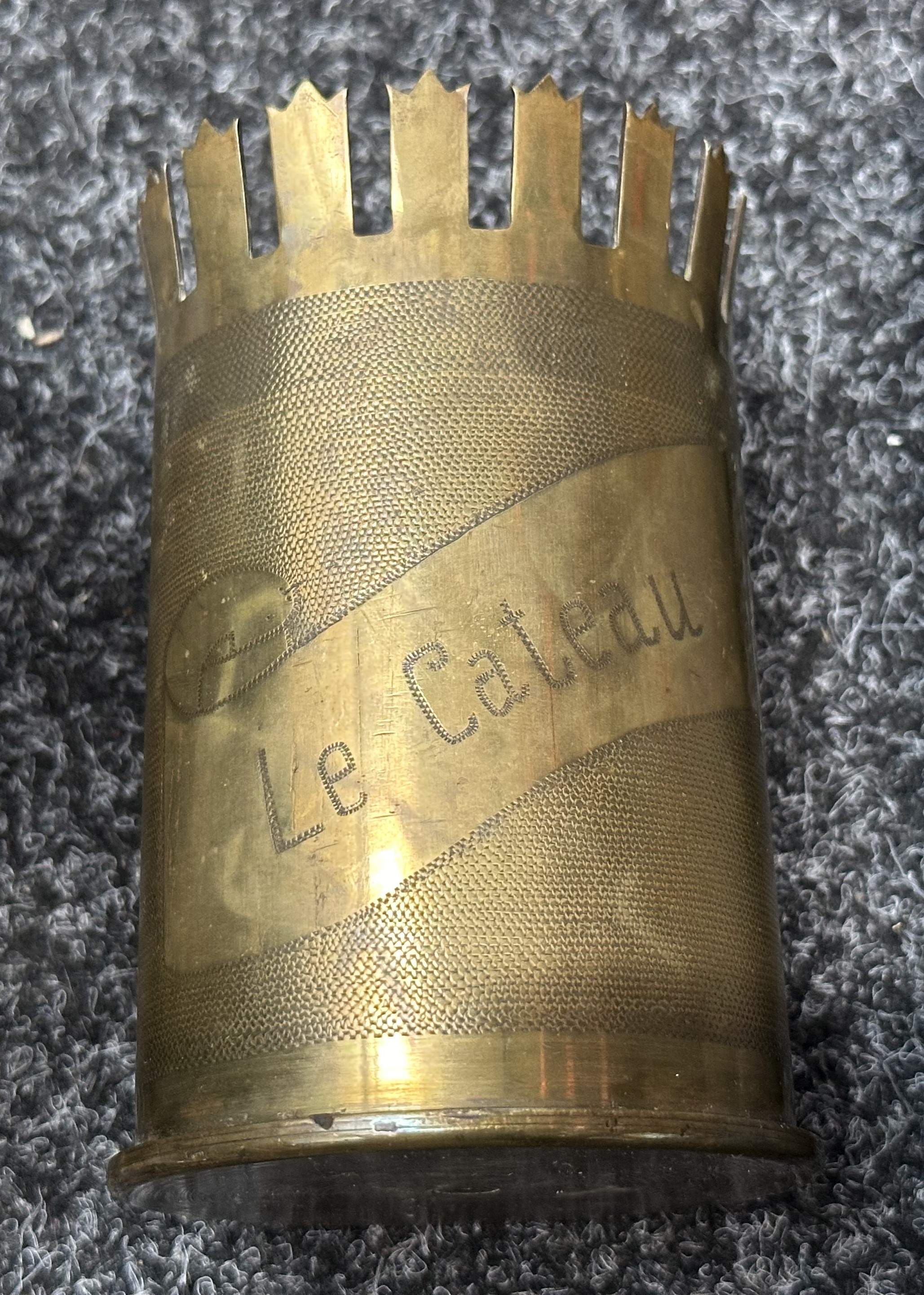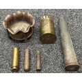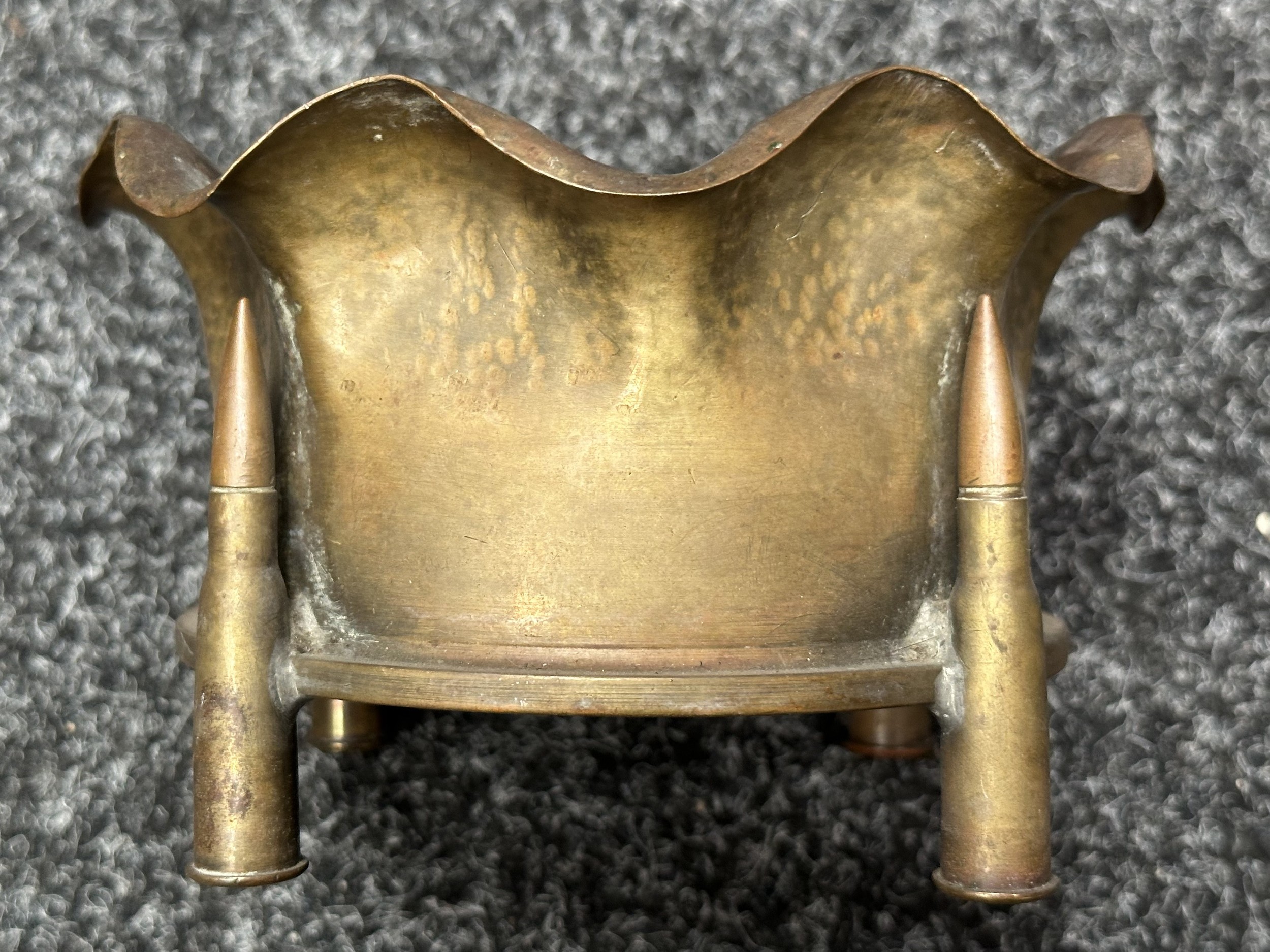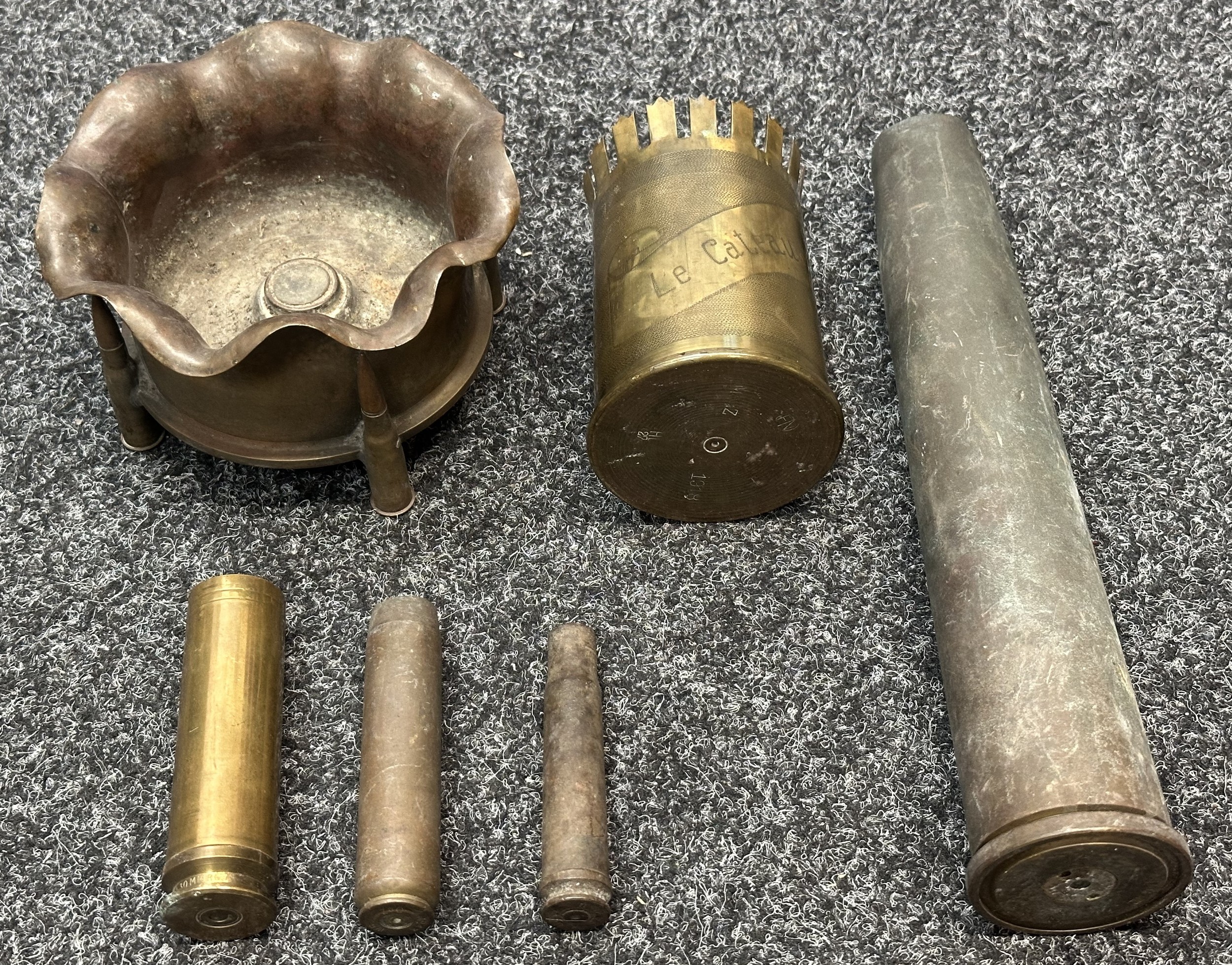 WW1 British Trench Art bowl made from a British 4.5 inch shell case dated 1917 on French Lebel cartridge case feet: Vase made from a 1918 dated shell case inscribed "Le Cateau": three WW2 shell cases. (6)