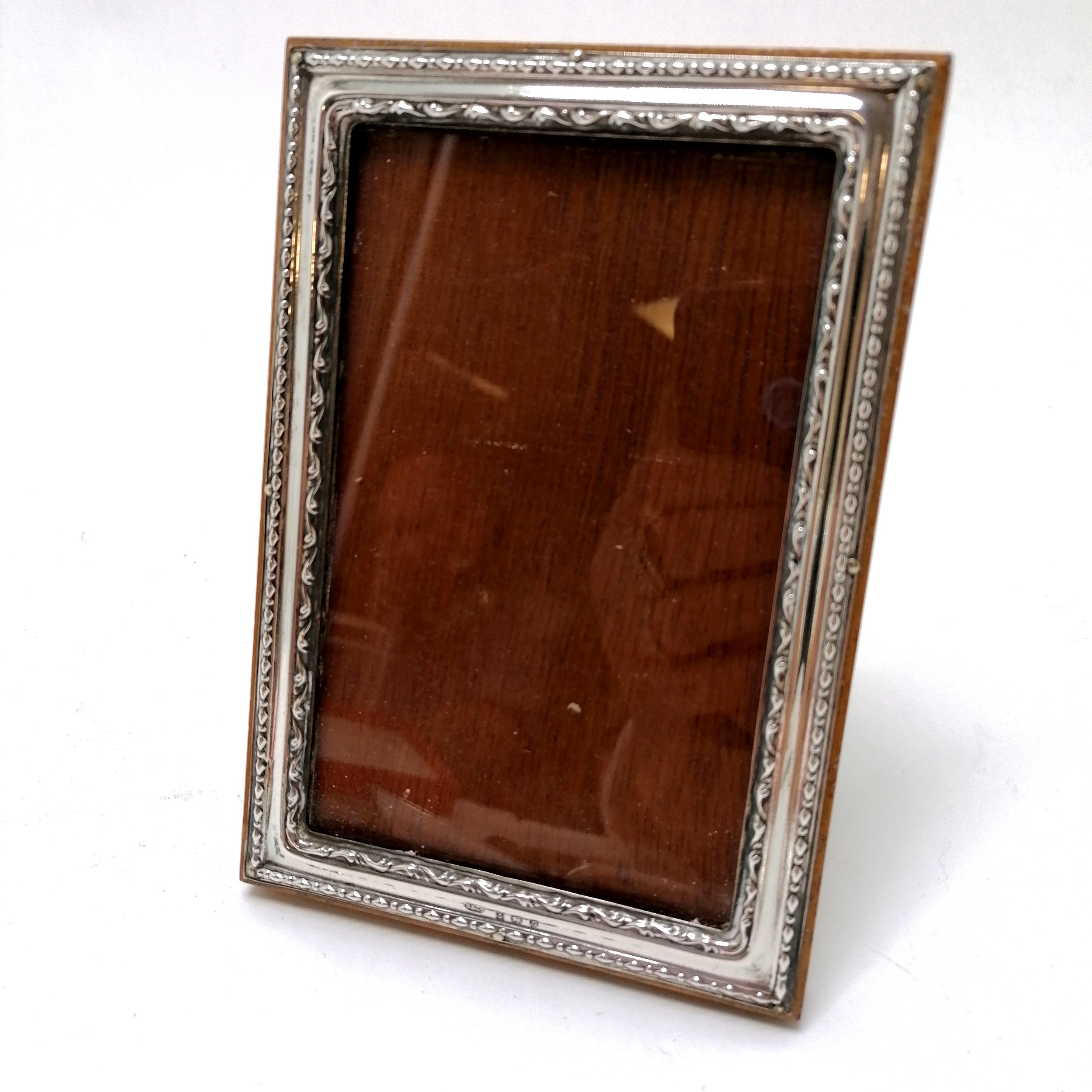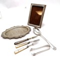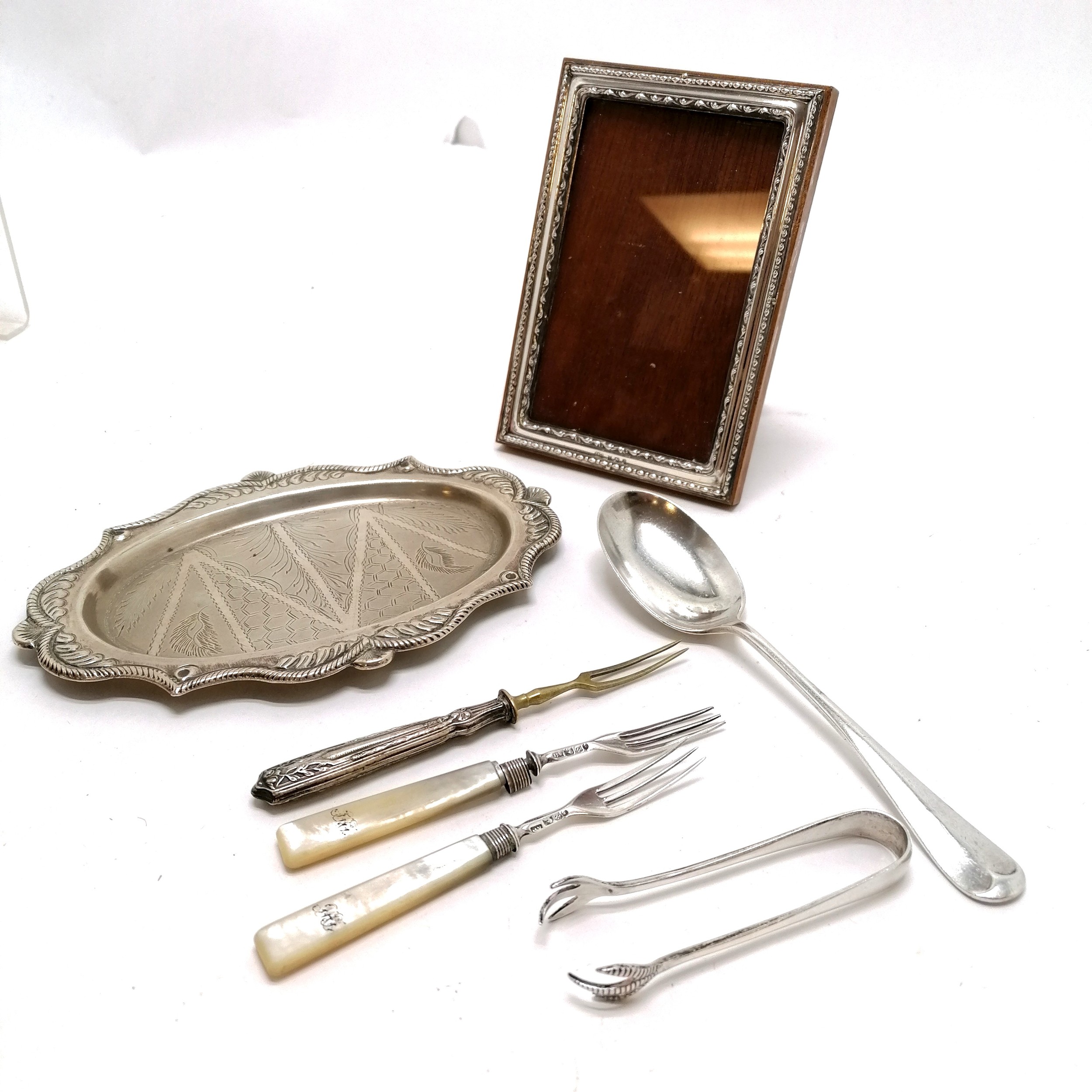 Silver wooden backed picture frame (14cm x 10cm) t/w silver spoon, tongs, 2 silver pronged mother of pearl forks (a/f) - spoon / tongs / forks total weight 100g t/w a silver plated small tray