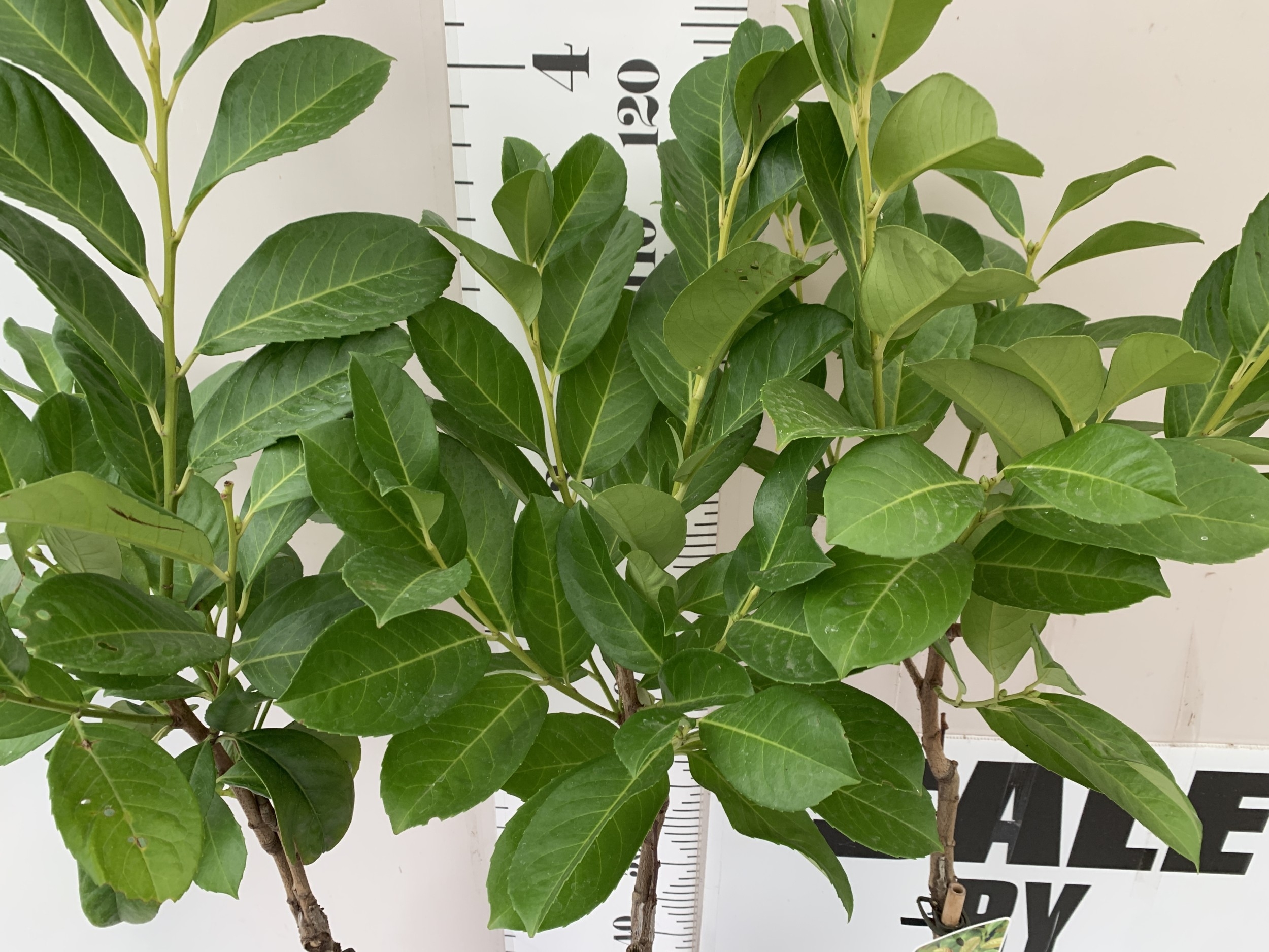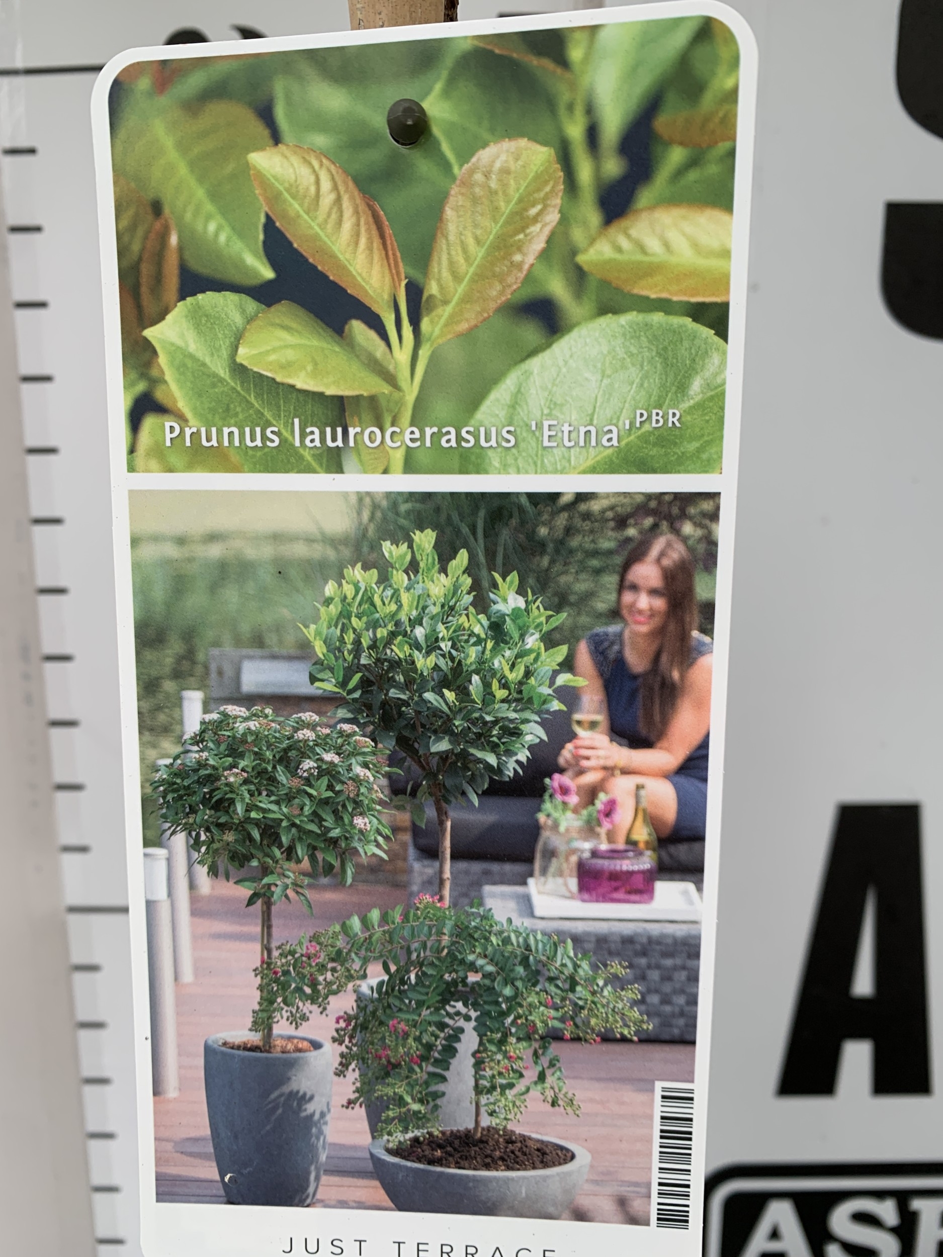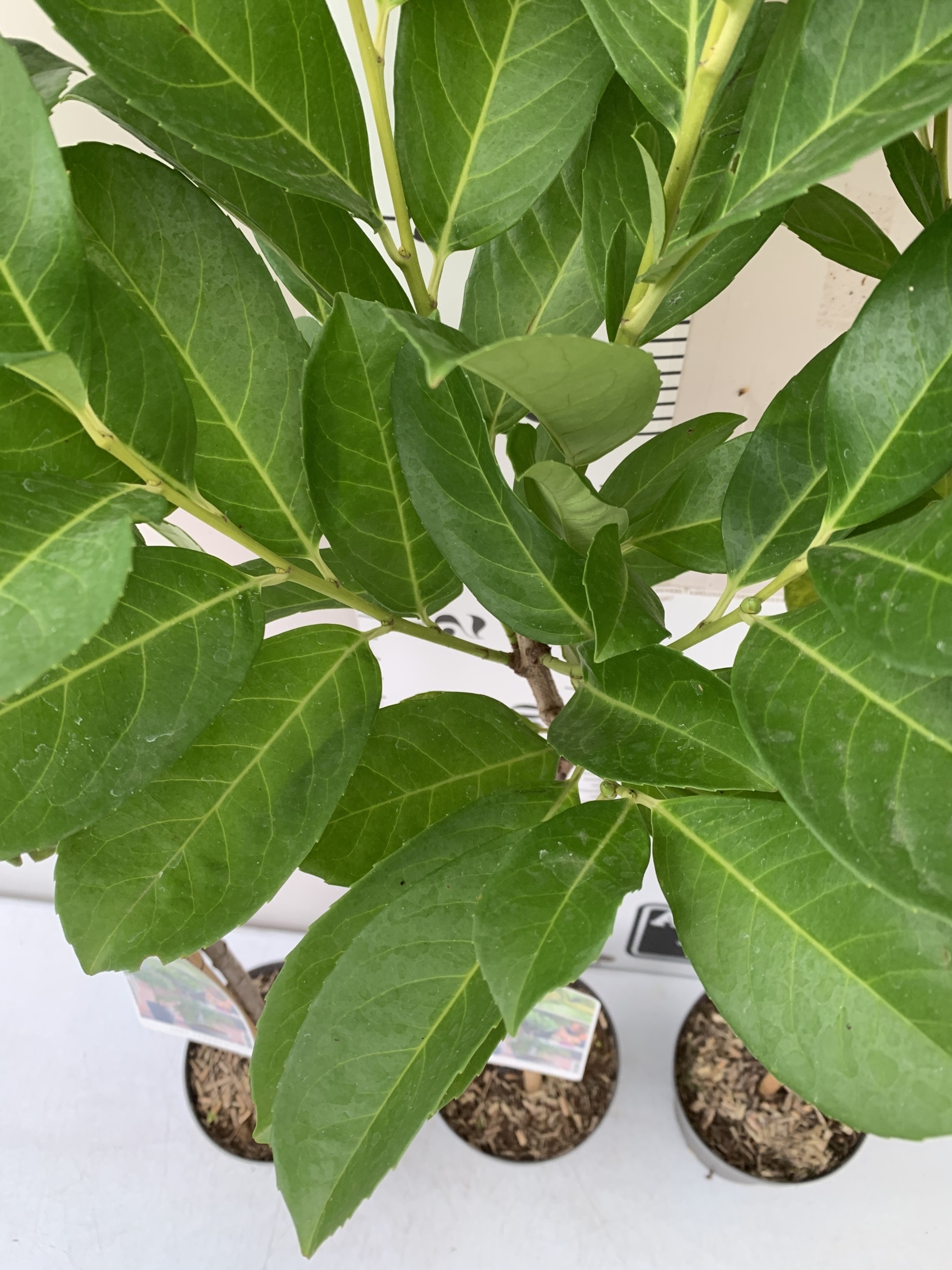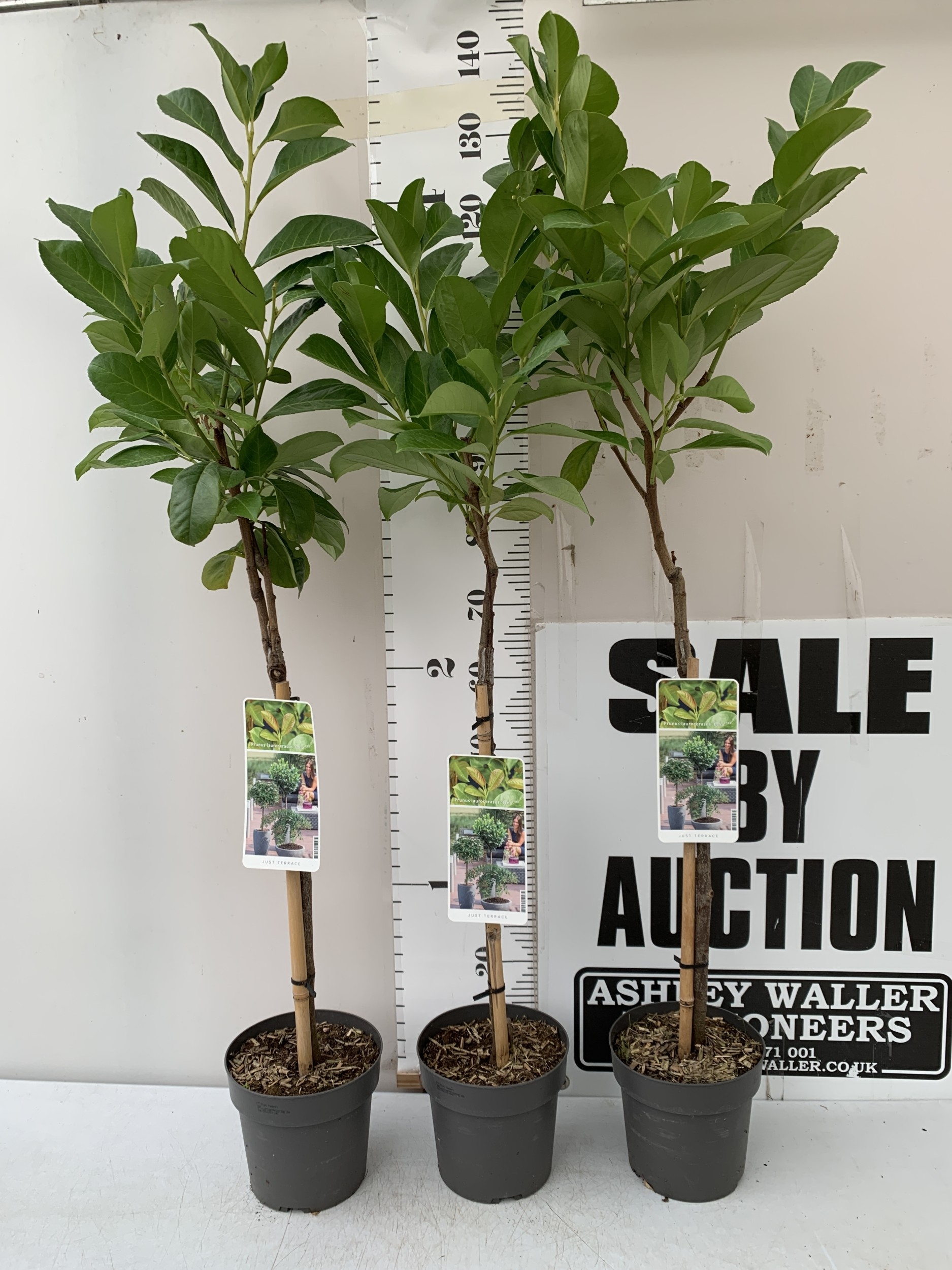 THREE STANDARD LAUREL PRUNUS LAUROCERASUS 'ETNA' IN 3 LTR POTS. APPROX 140CM TALL, TO BE SOLD FOR THE THREE