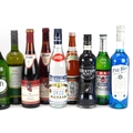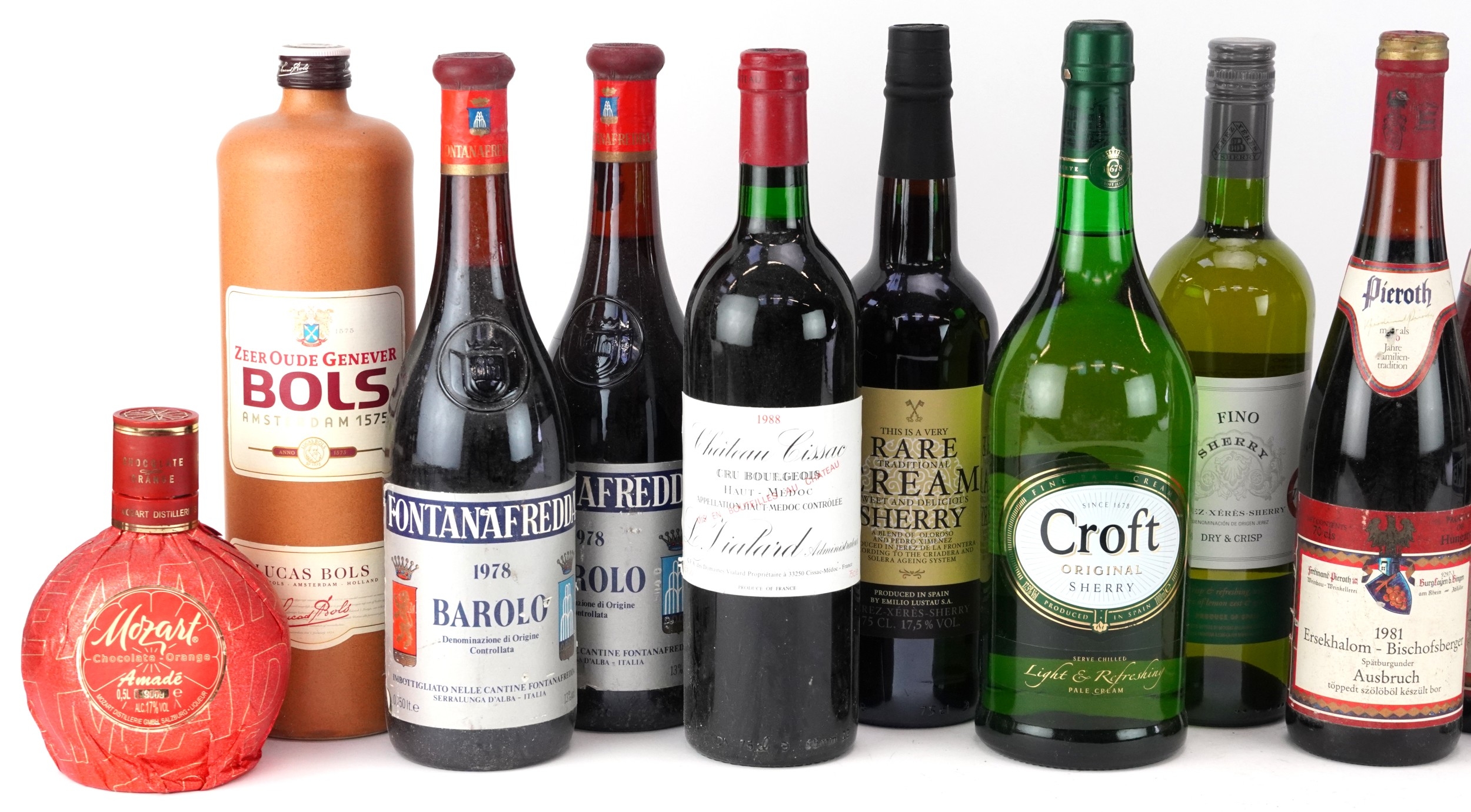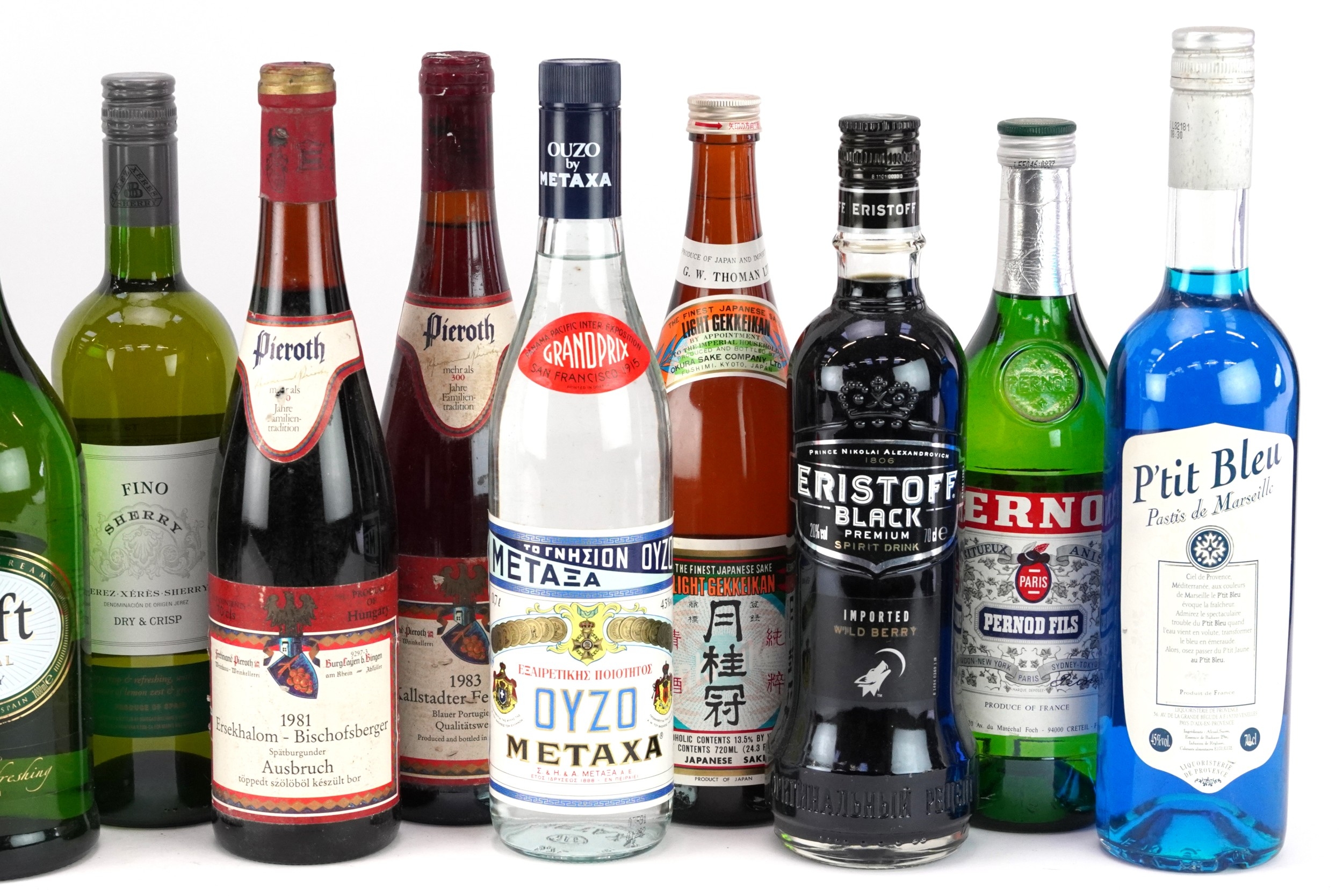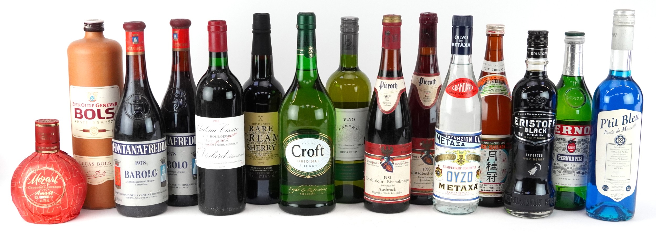 Fifteen bottles of alcohol including Oyzo, Pernod, 1983 Kallstadter Feuerberg and Château Lissac 1988 Médoc.