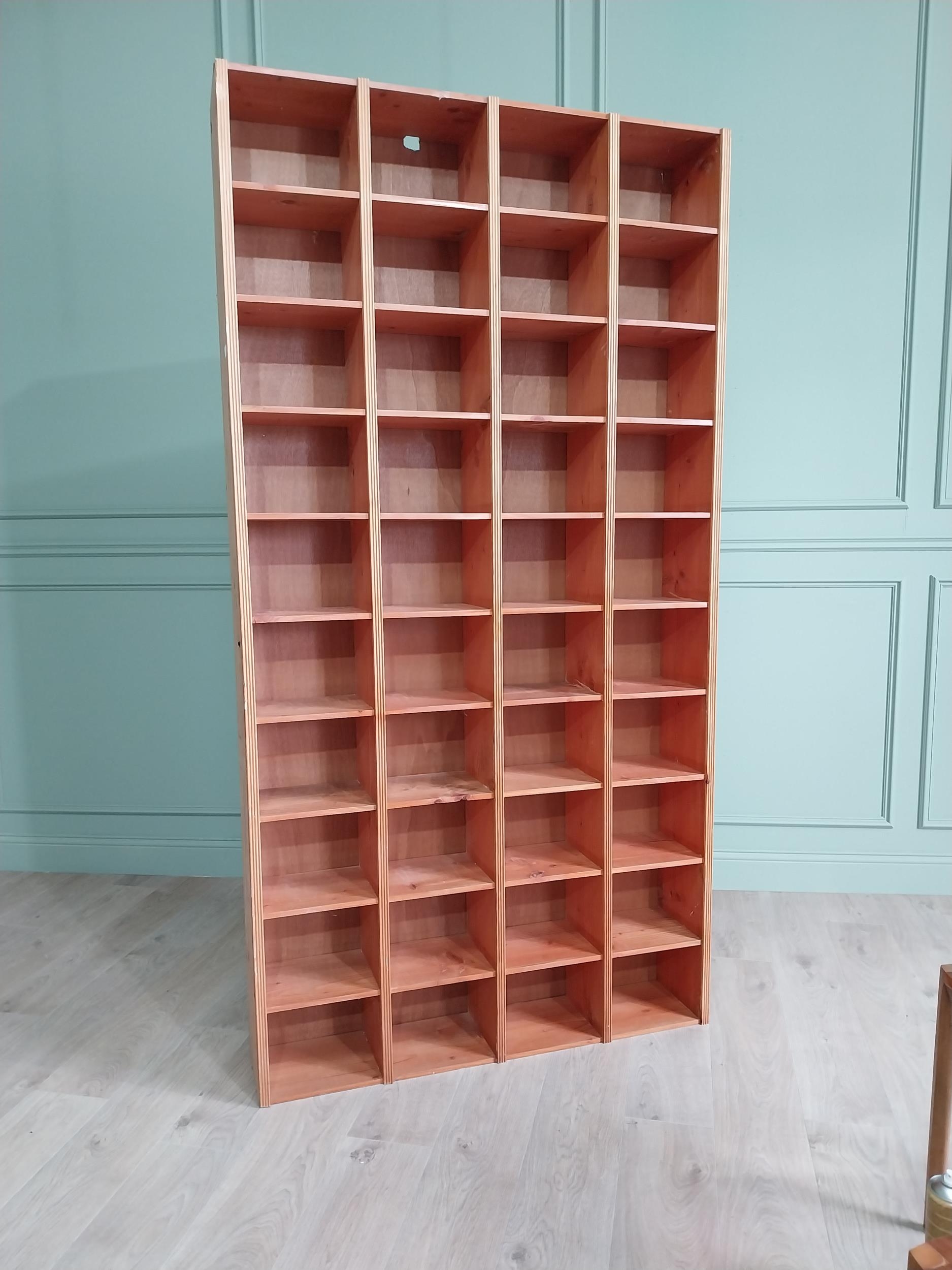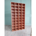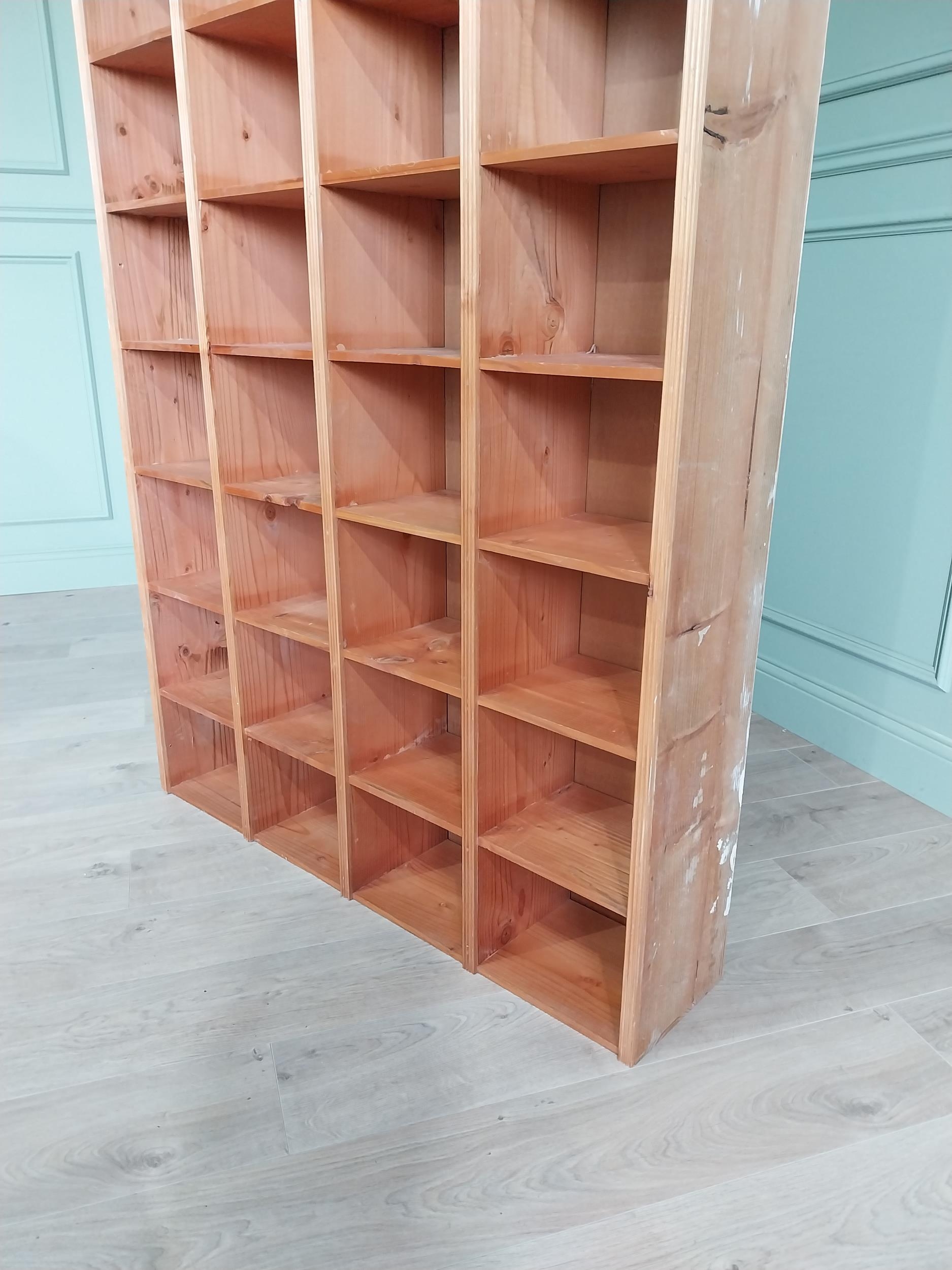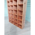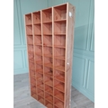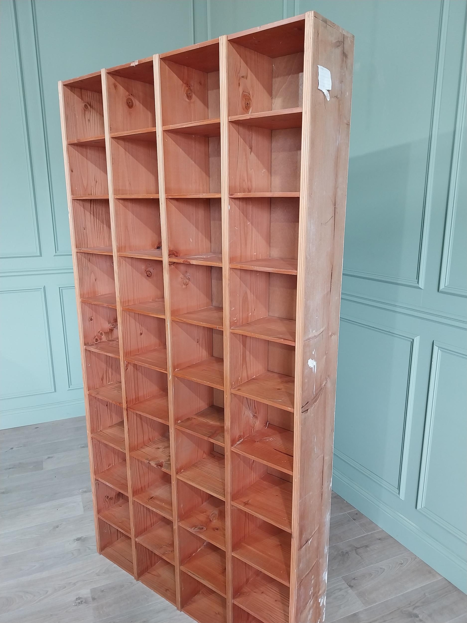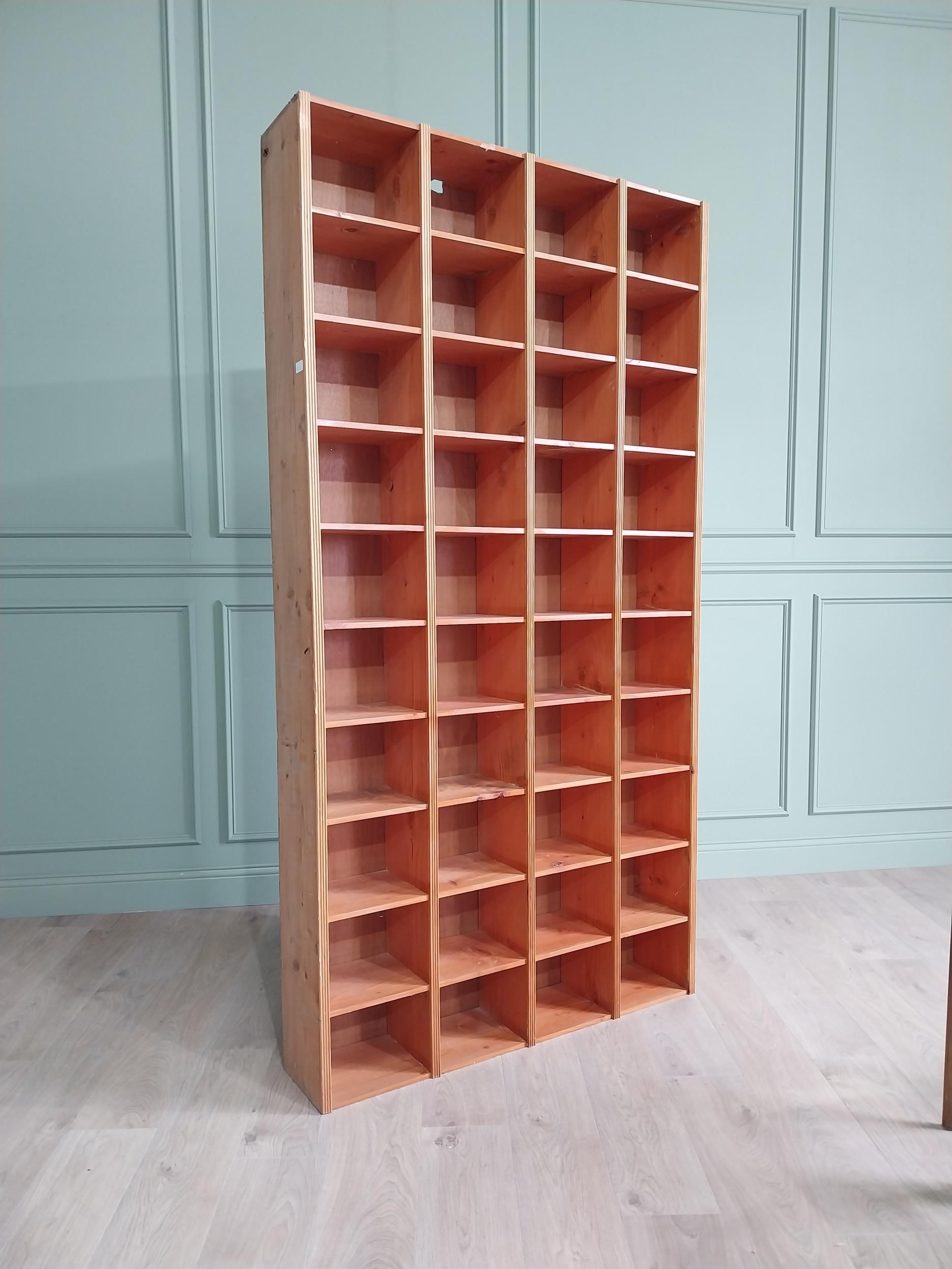 Pine bank of pigeon holes {214 cm H x 112 cm W x 24 cm D}.