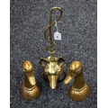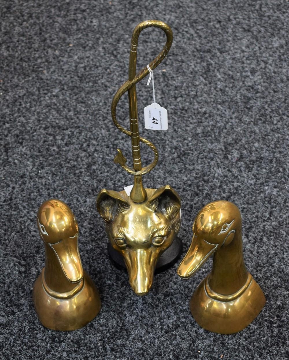 A pair of brass book ends, as duck's heads, 23.5cm high; a brass and cast iron doorstop as a fox's head (2)