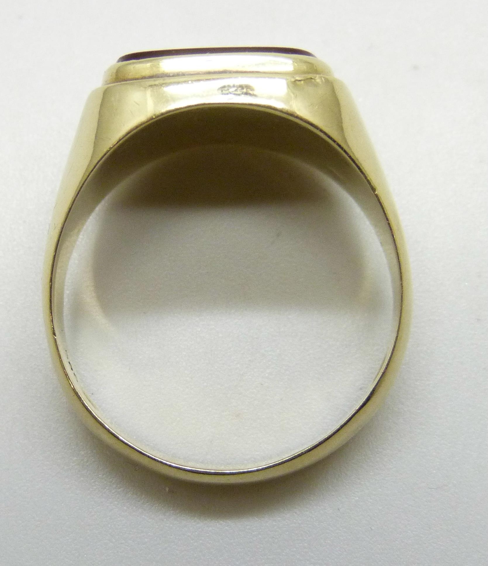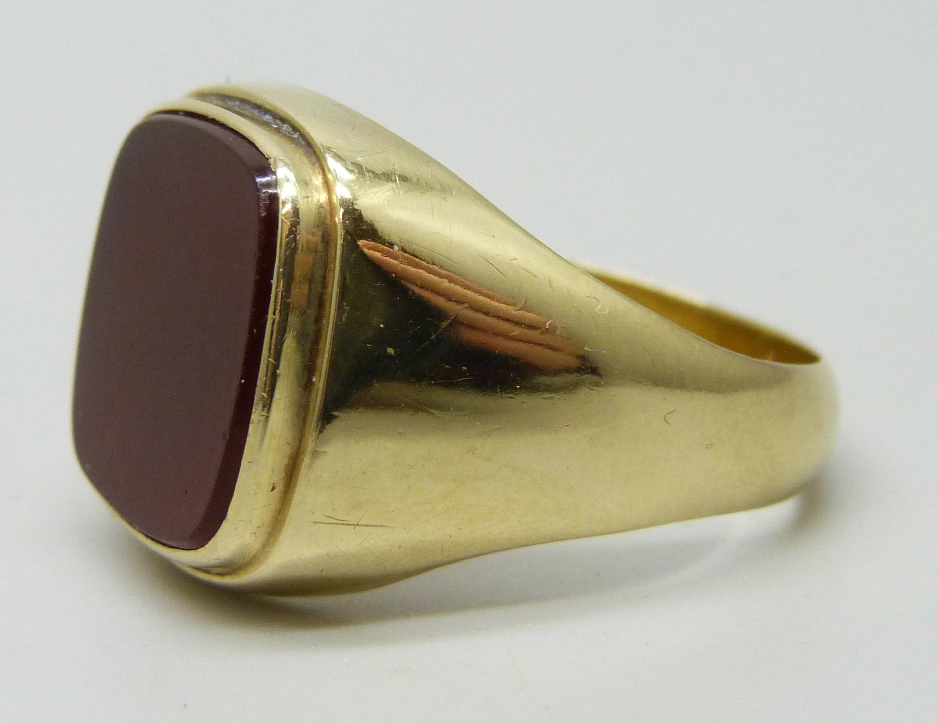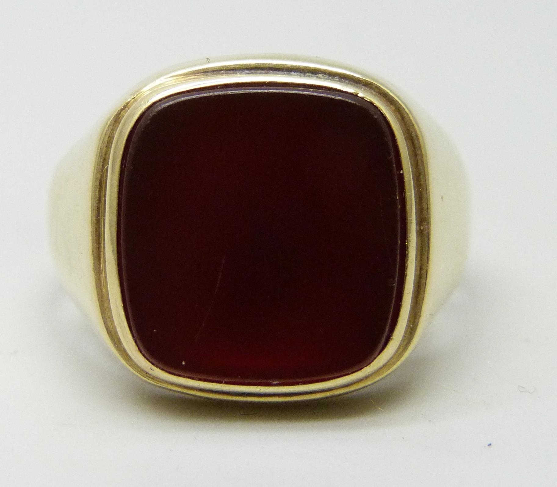 A 14ct gold signet ring set with a carnelian stone, 5.9g, Y