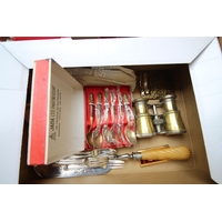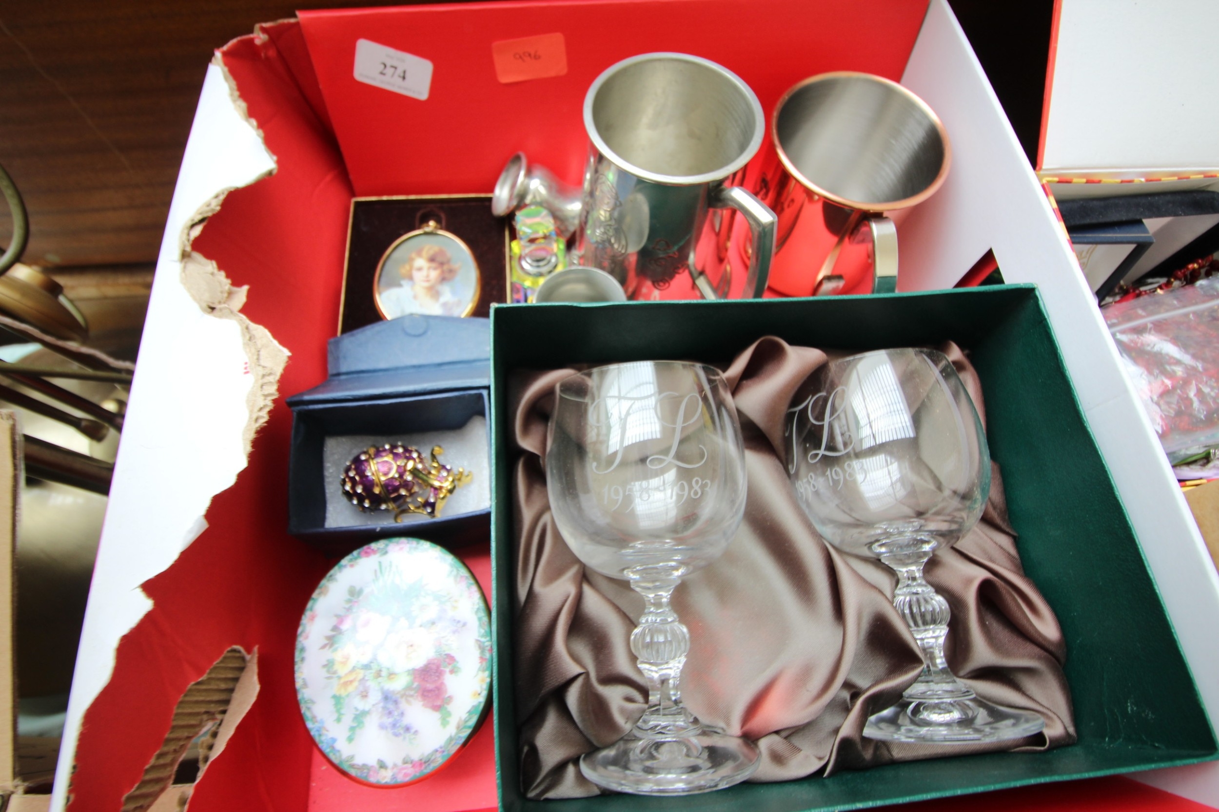 Presentation box, 2 glass goblets together with a mixture of pewter and copper tankards, miniature of young Queen Elizabeth, ceramic music box and an ornamental egg