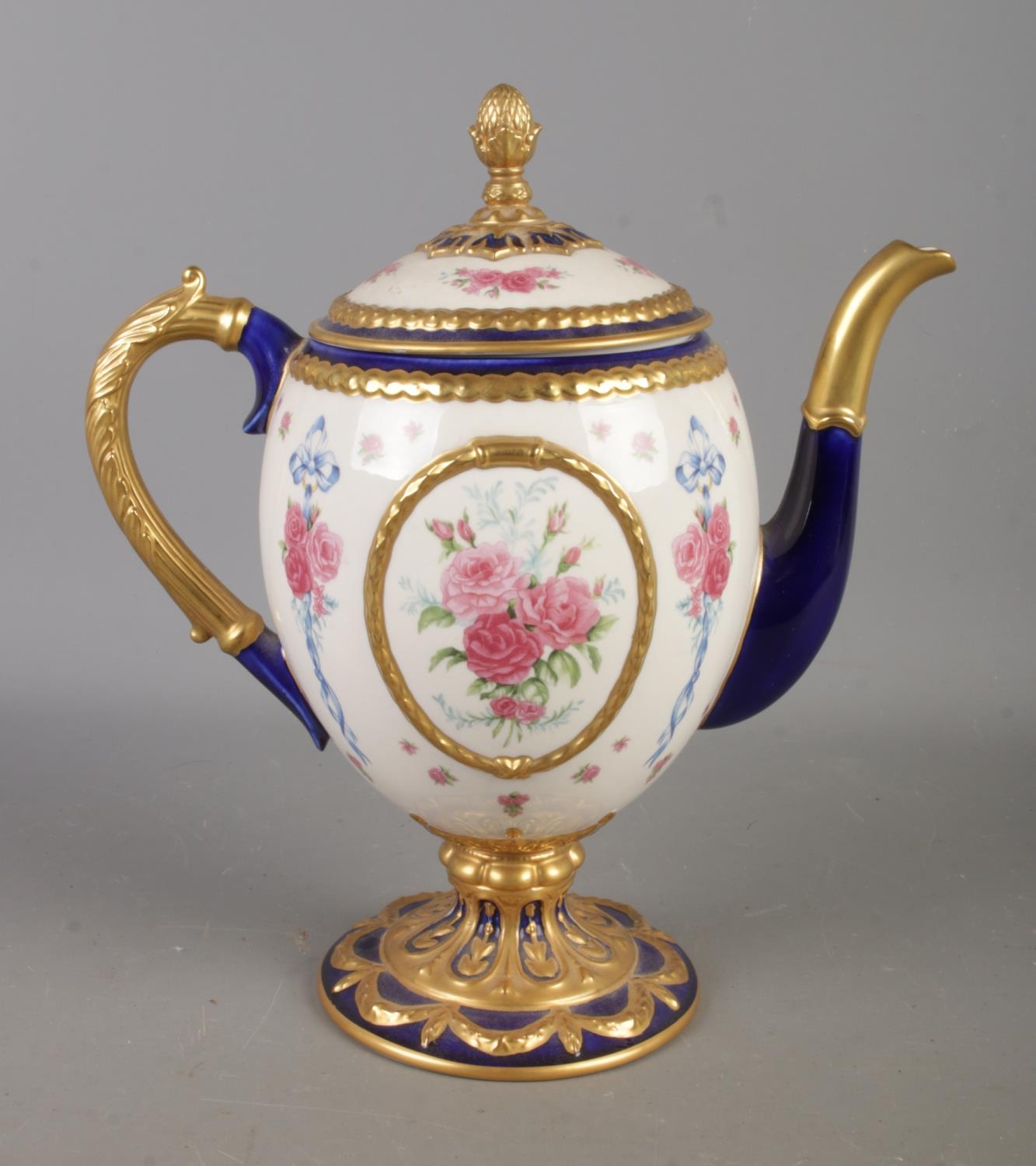 A House of Faberge 'The Faberge Egg Imperial Teapot' gilt decorated with rose motifs and acorn finial.