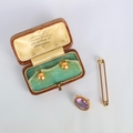 A selection of jewellery, including an early 20th century amethyst brooch, the oval cut stone within an engraved yellow metal mount with hinge pin to reverse, unmarked, 1.5cm wide, a yellow metal stock pin, stamped '9ct' and a pair of yellow metal dress studs, unmarked, gross weight 6gms (4) (box at fault)