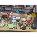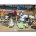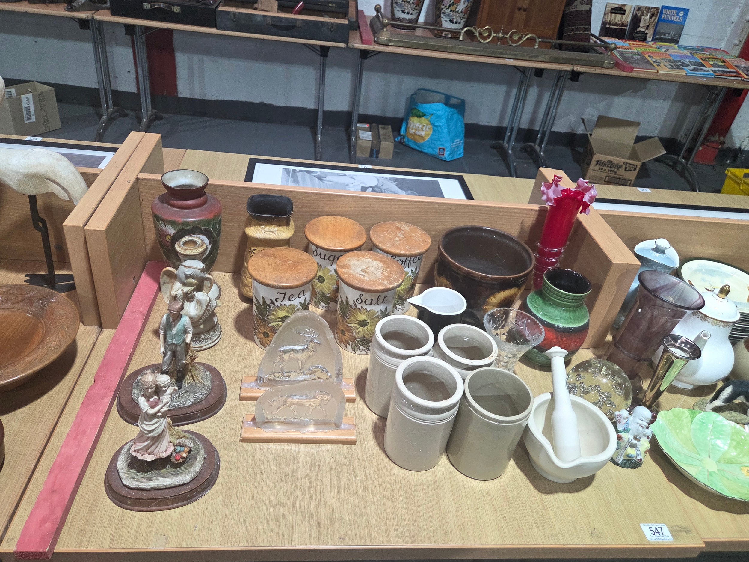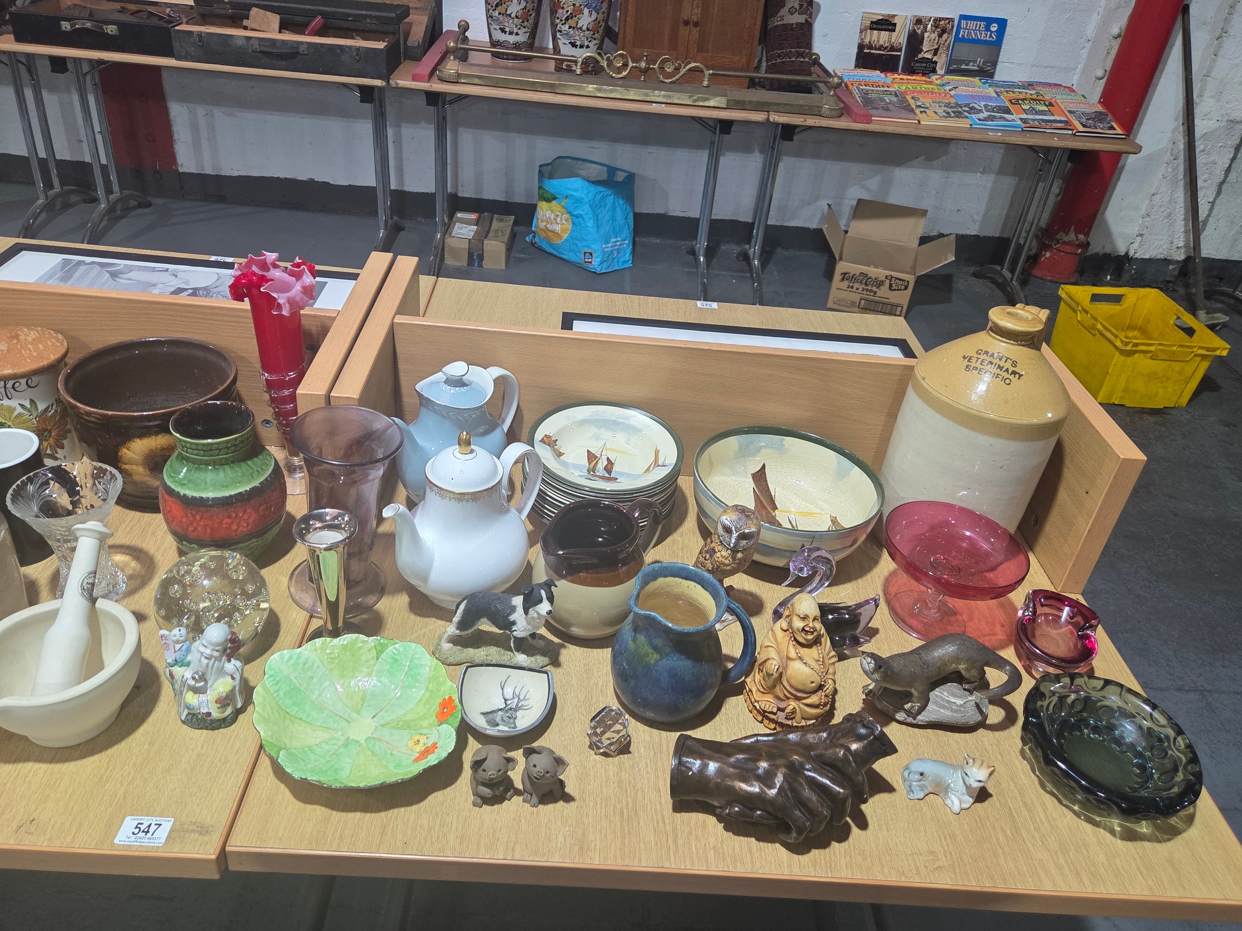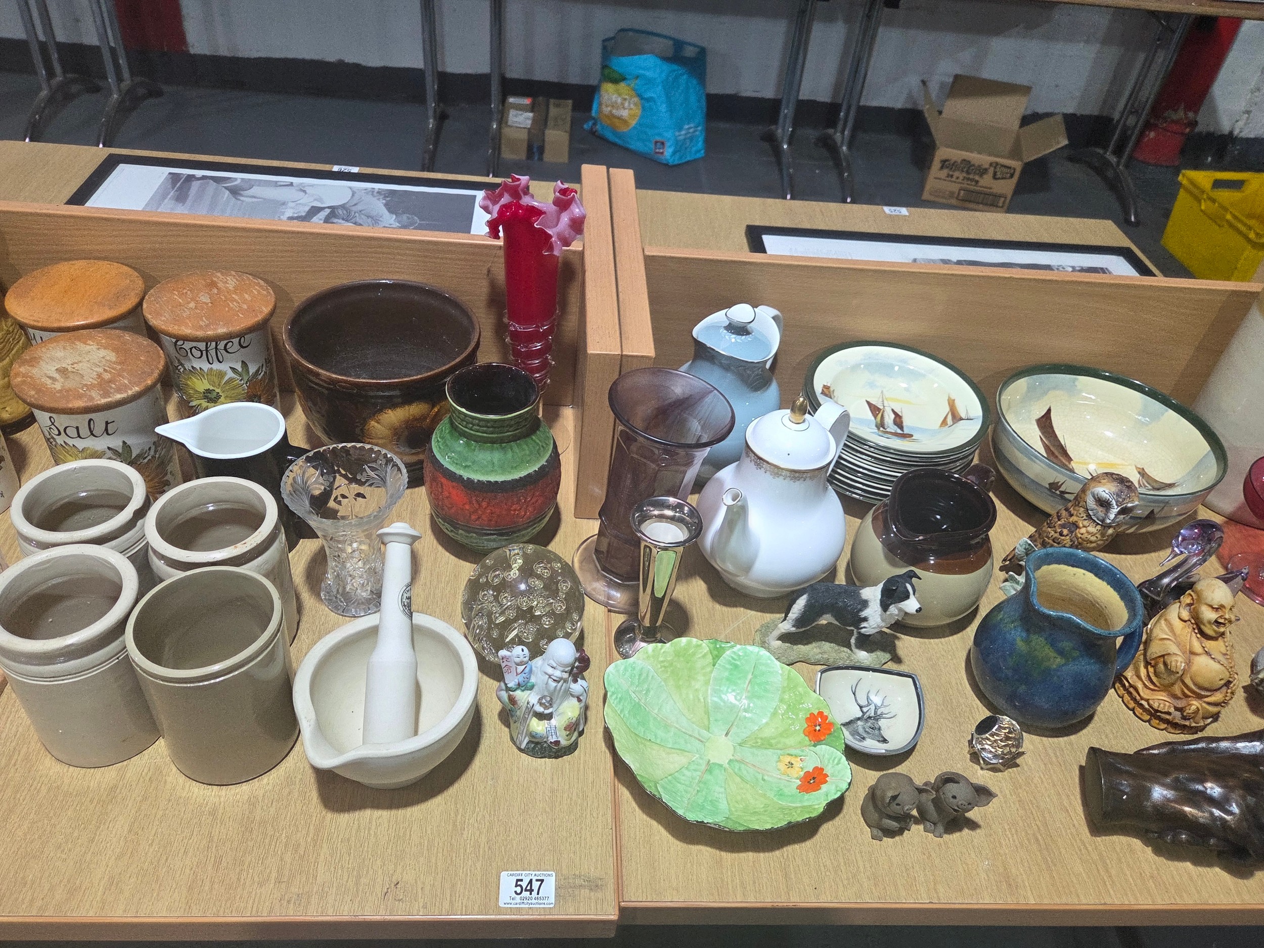 Decorative china and glassware to include West German vases, Royal Doulton, Goebel owl ornament