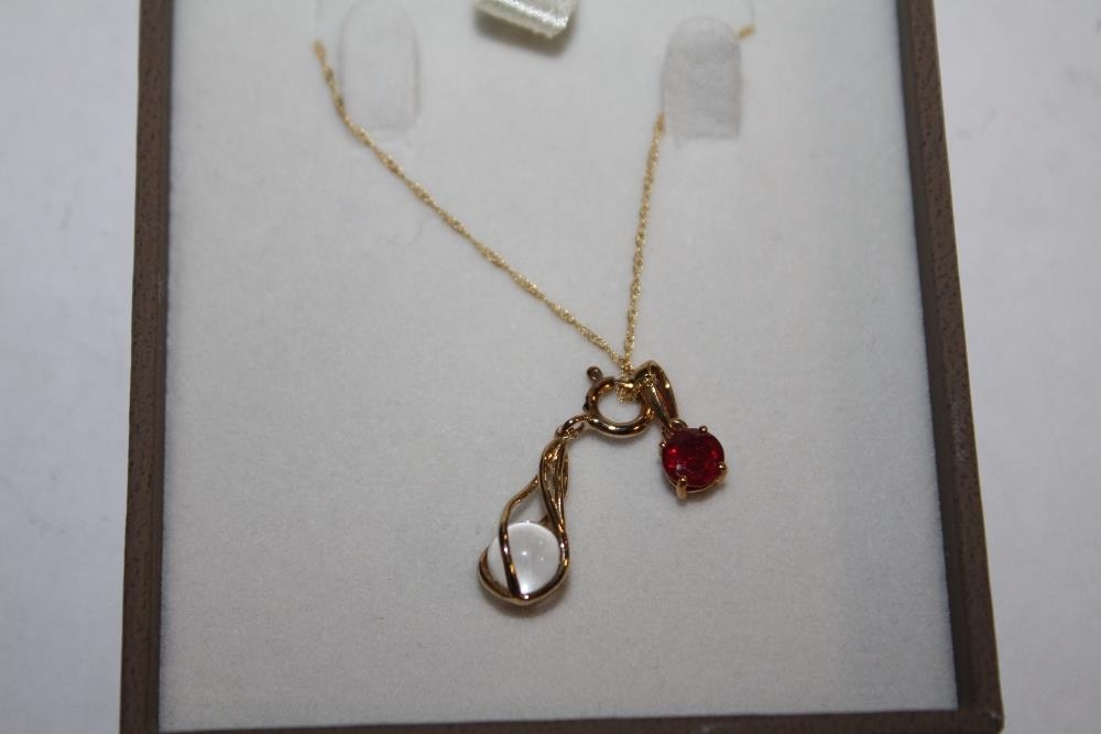 A 9 CARAT GOLD NECKLACE WITH TWO PENDANTS TO INCLUDE A RED GEM SET EXAMPLE