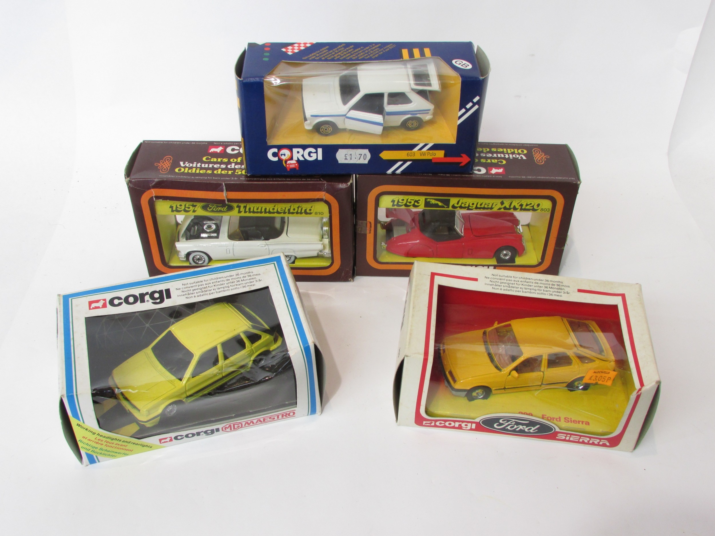 Five Corgi Toys diecast models to include #803 50's Classics 1953 Jaguar XK120, #810 50's Classics 1957 Thunderbird, #603 VW Polo, #299 Ford 2.3 Sierra Ghia, and #1009 Maestro MG 1600, all in original boxes