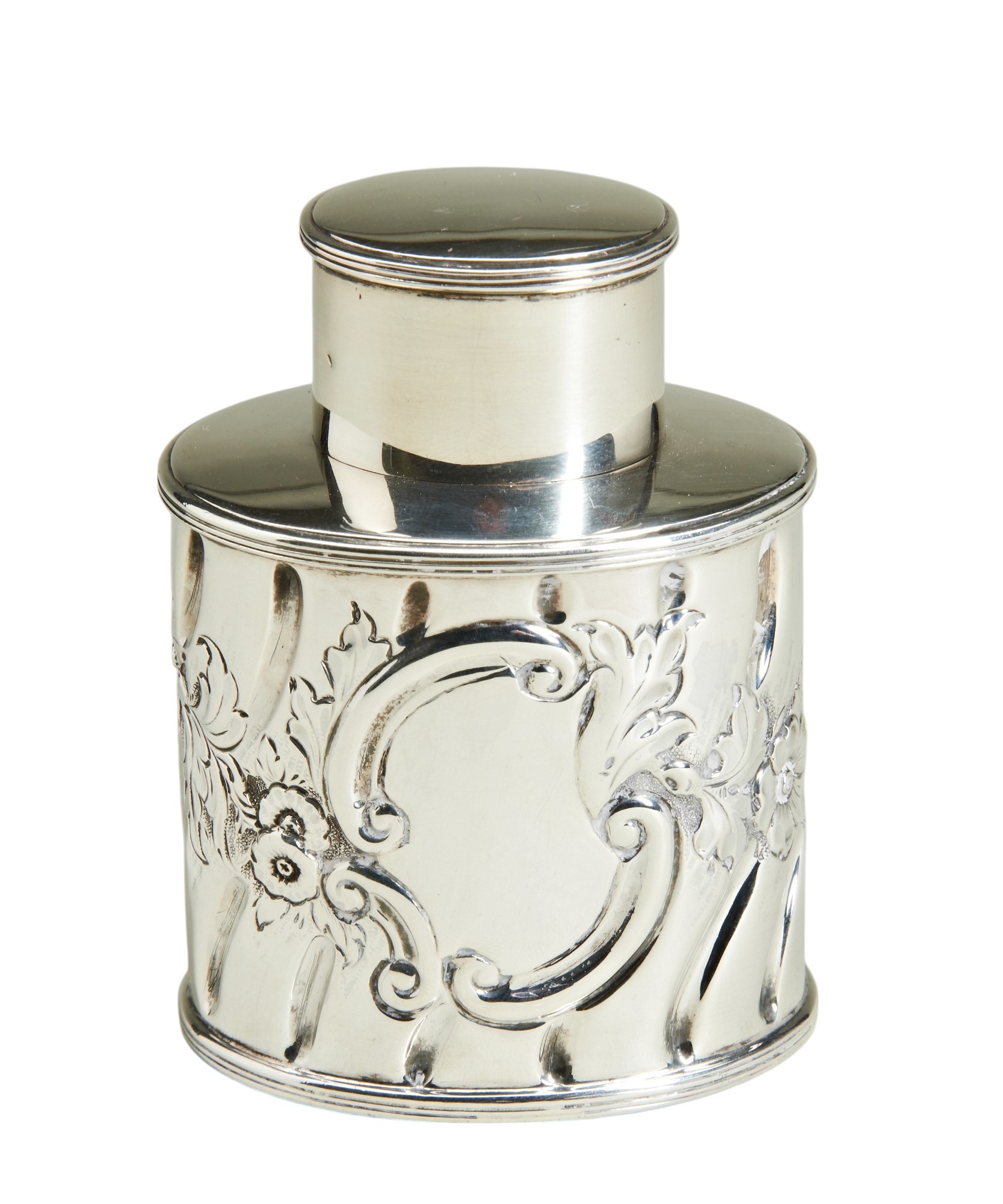 AN OVAL CHASED TEA CADDY, BIRMINGHAM 1900