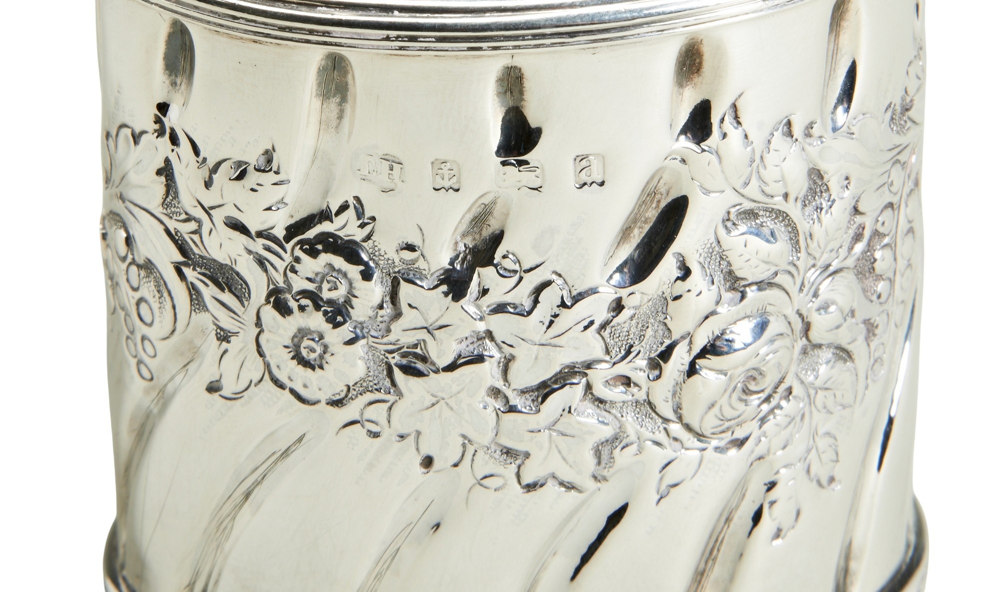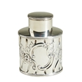 A tea caddy in Georgian style with pull off lid, chased with scrolls and flowers