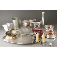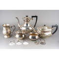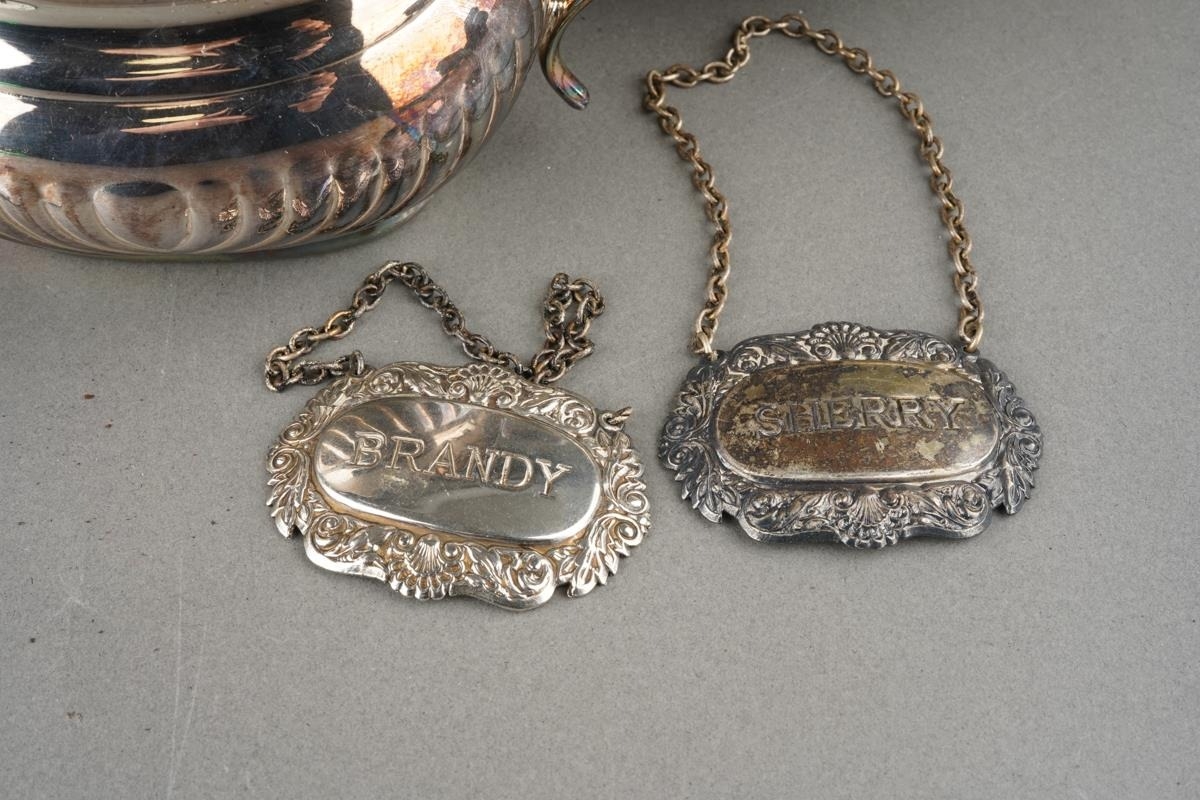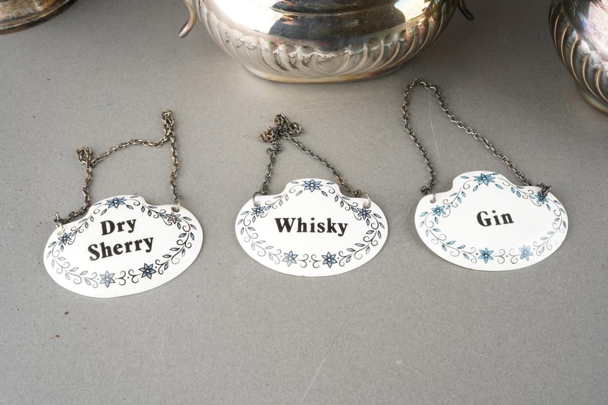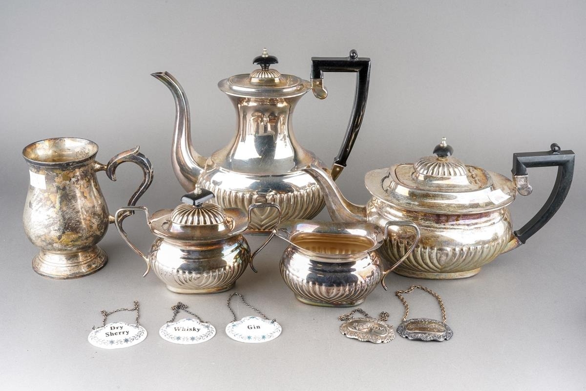 Sheffield Silver plated tea and coffee pot set, large EPNS tankard and 5 drinks labels to include 3 porcelain examples