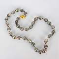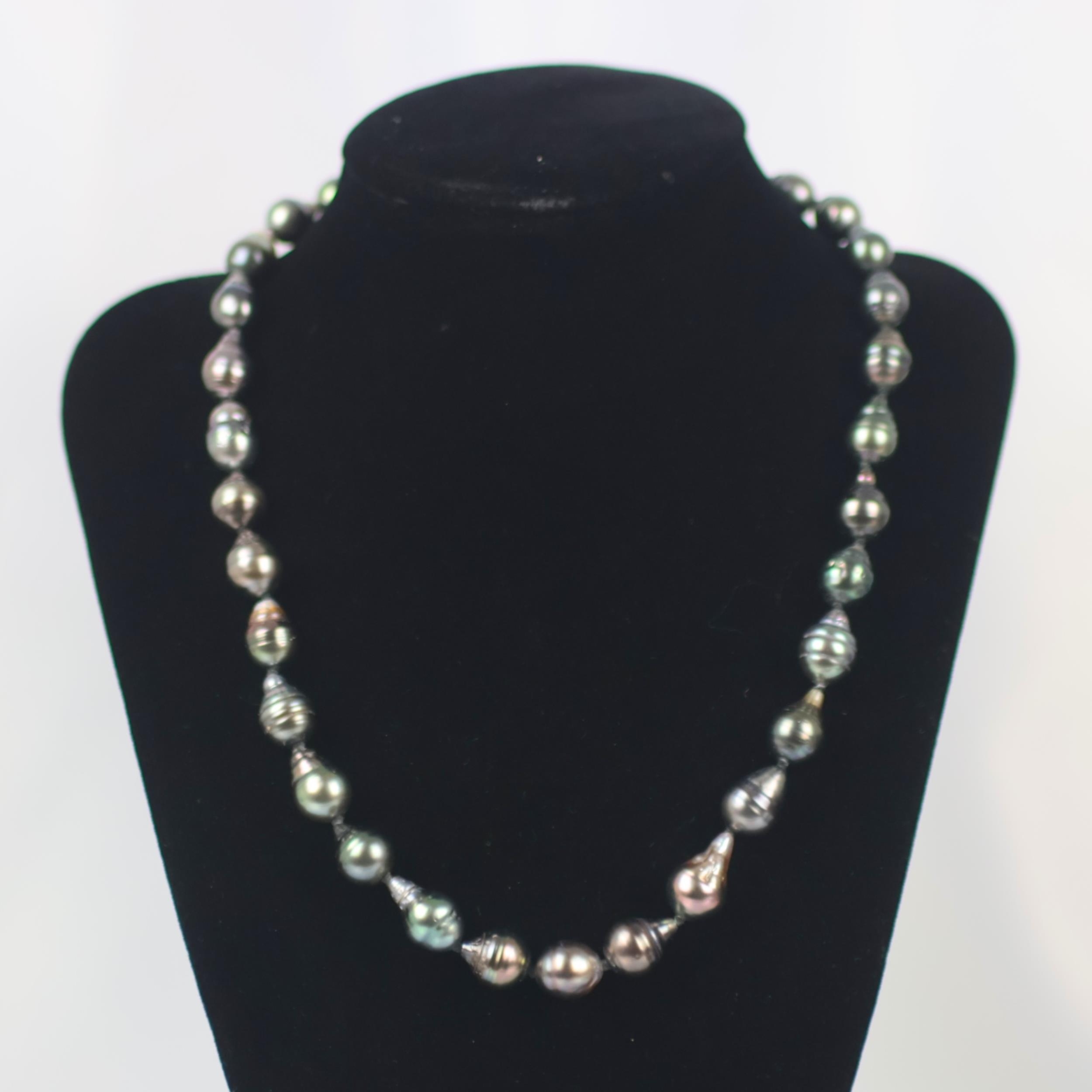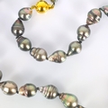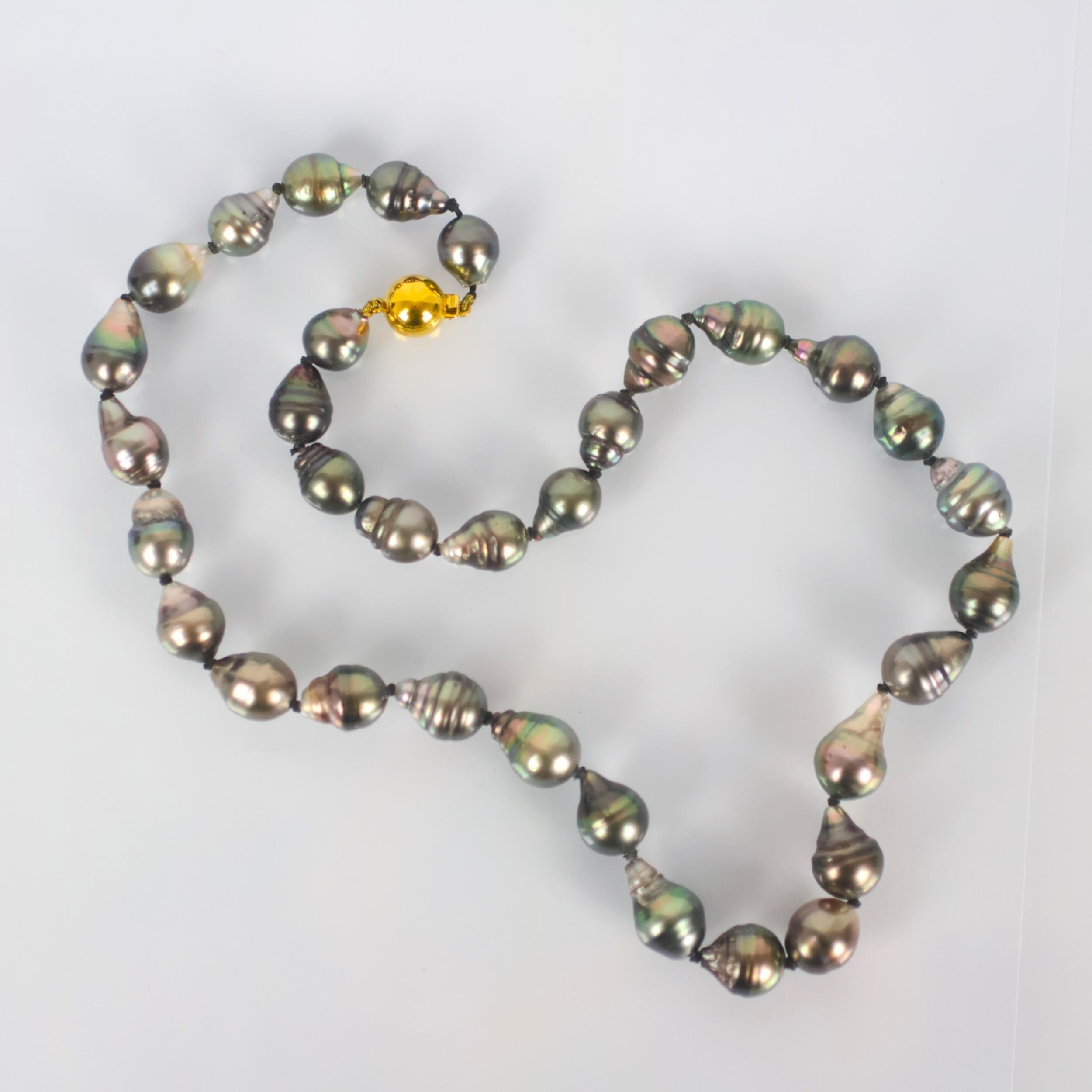 A strand of Tahitian cultured pearls, the thirty three non uniform cultured pearls with box and tongue fastening stamped ‘375’ 45cm long,45gms
