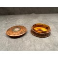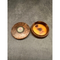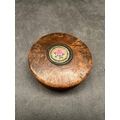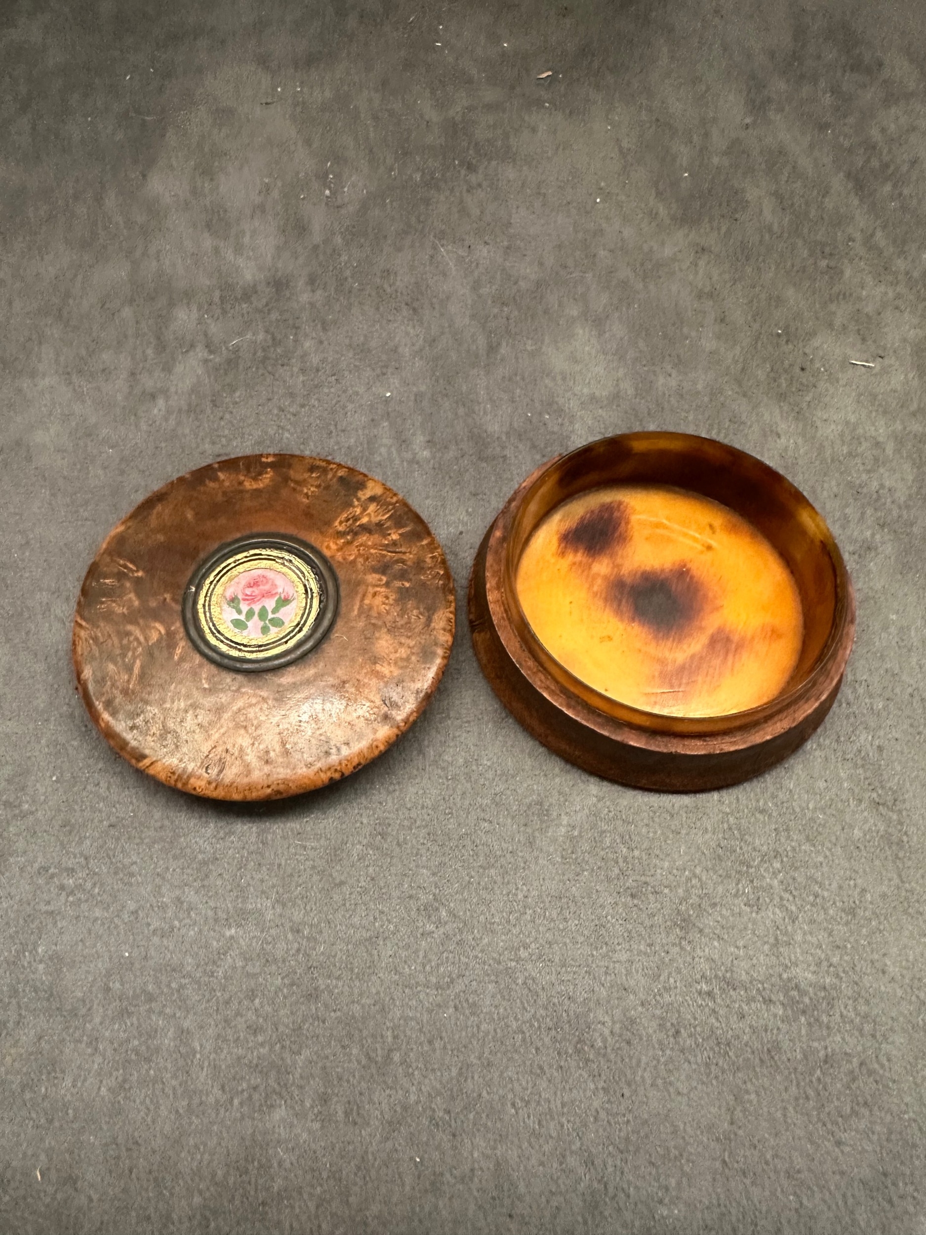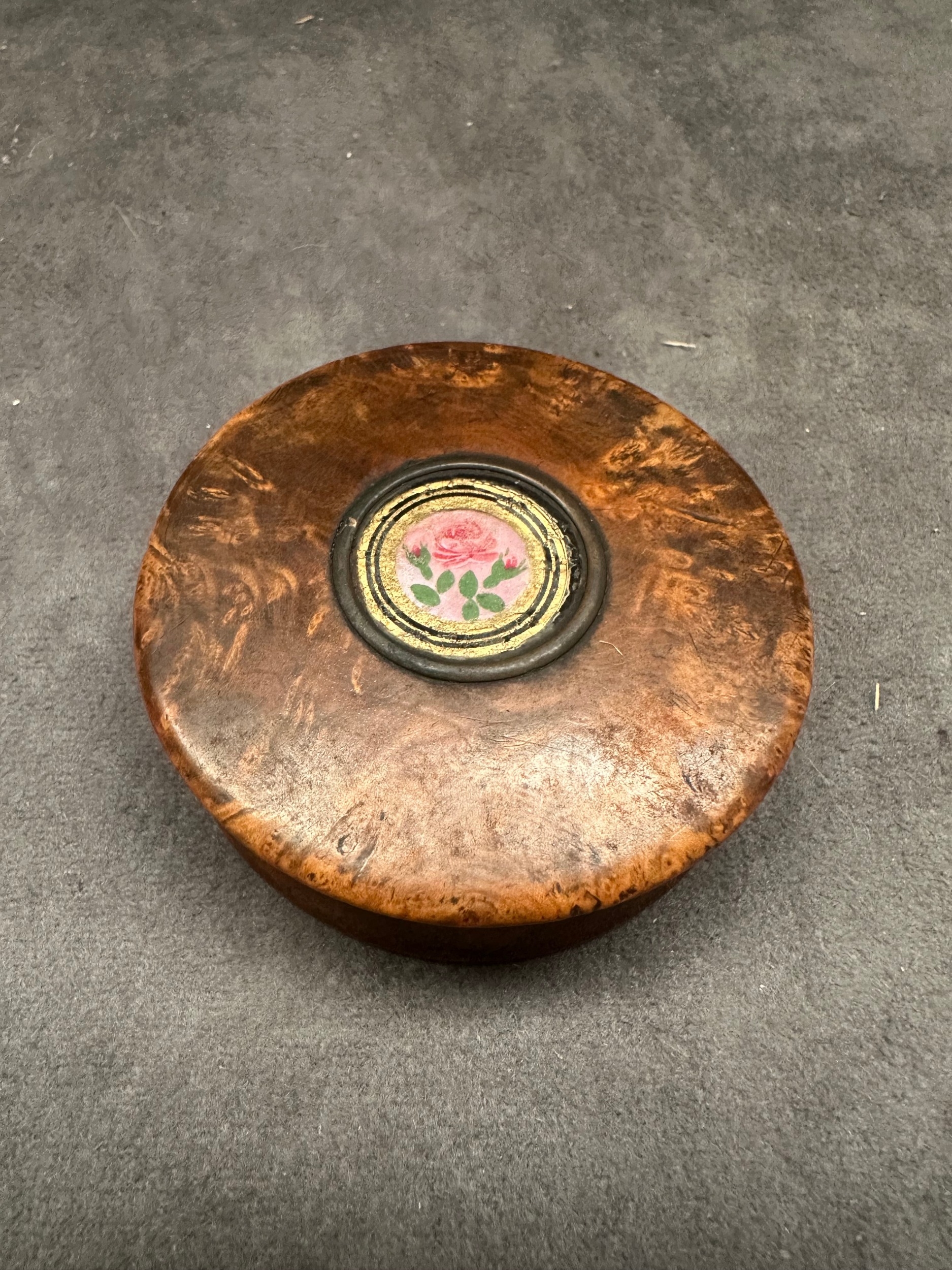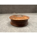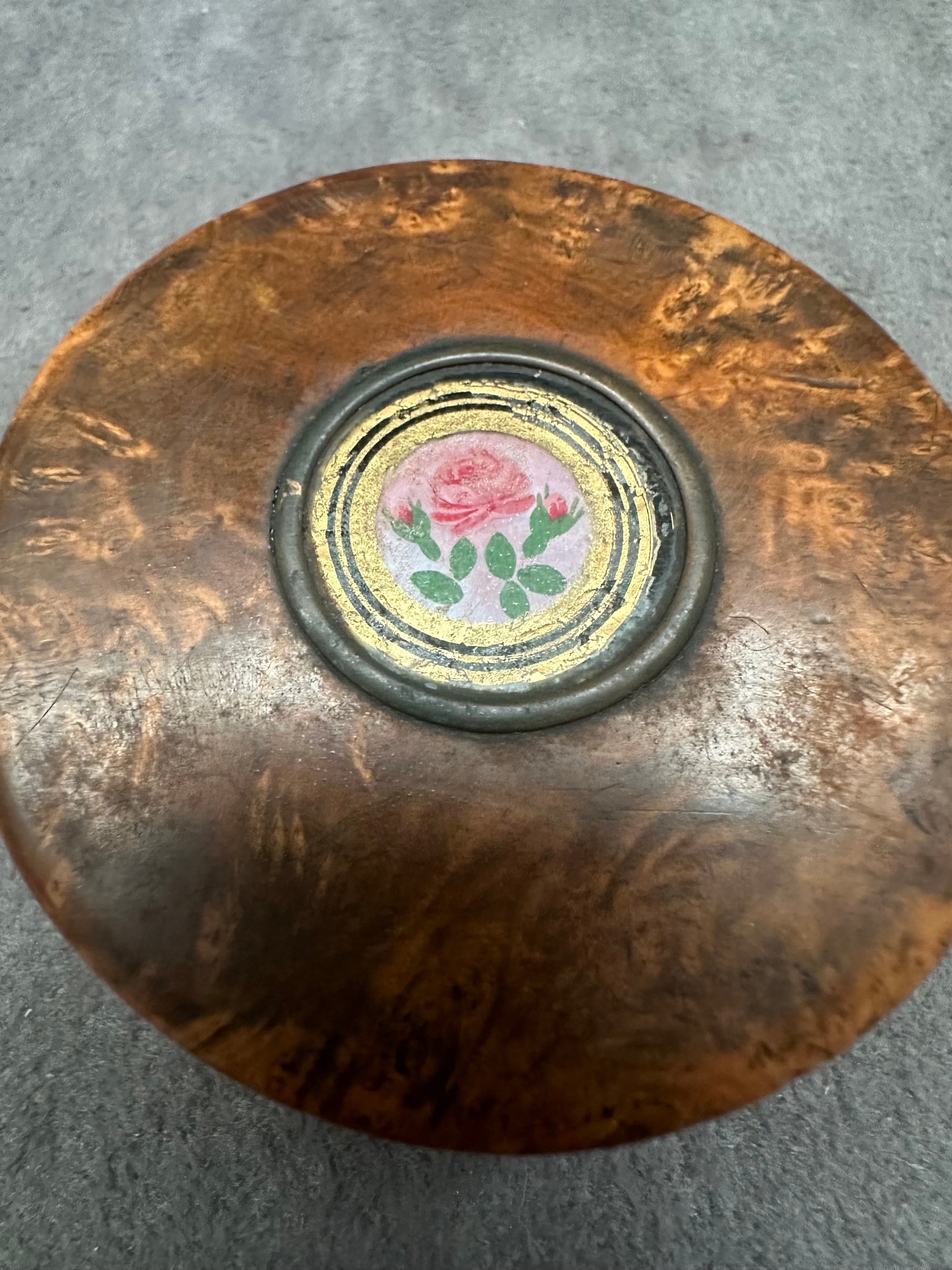 A small, round burl wood box featuring a lift-off lid. The lid is adorned with a central circular metal bezel encasing a micro mosaic plaque, depicting a single pink rose with green foliage set against a pale pink background with a gilded border. The interior of the box base is lined with tortoise shell. No text or identifying marks are visible.