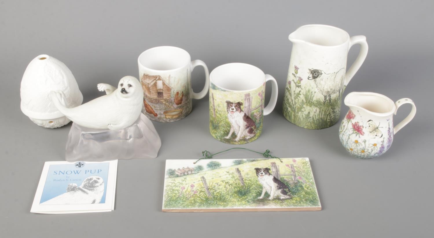 A collection of ceramics to include Jenny Bell, Lladro egg and Roslyn S. Carren Snow Pup.
