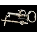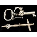 The barrel runs longitudinally through the key body, with a discreet trigger lever beneath and a rotating or hinged pan/cover near the bit, allowing the piece to function outwardly as a key while serving as a close-range defensive weapon. Such key-guns were carried by jailers or guards as last-resort arms, designed for surprise and compactness rather than accuracy, and are extremely scarce due to low production and heavy institutional wear.