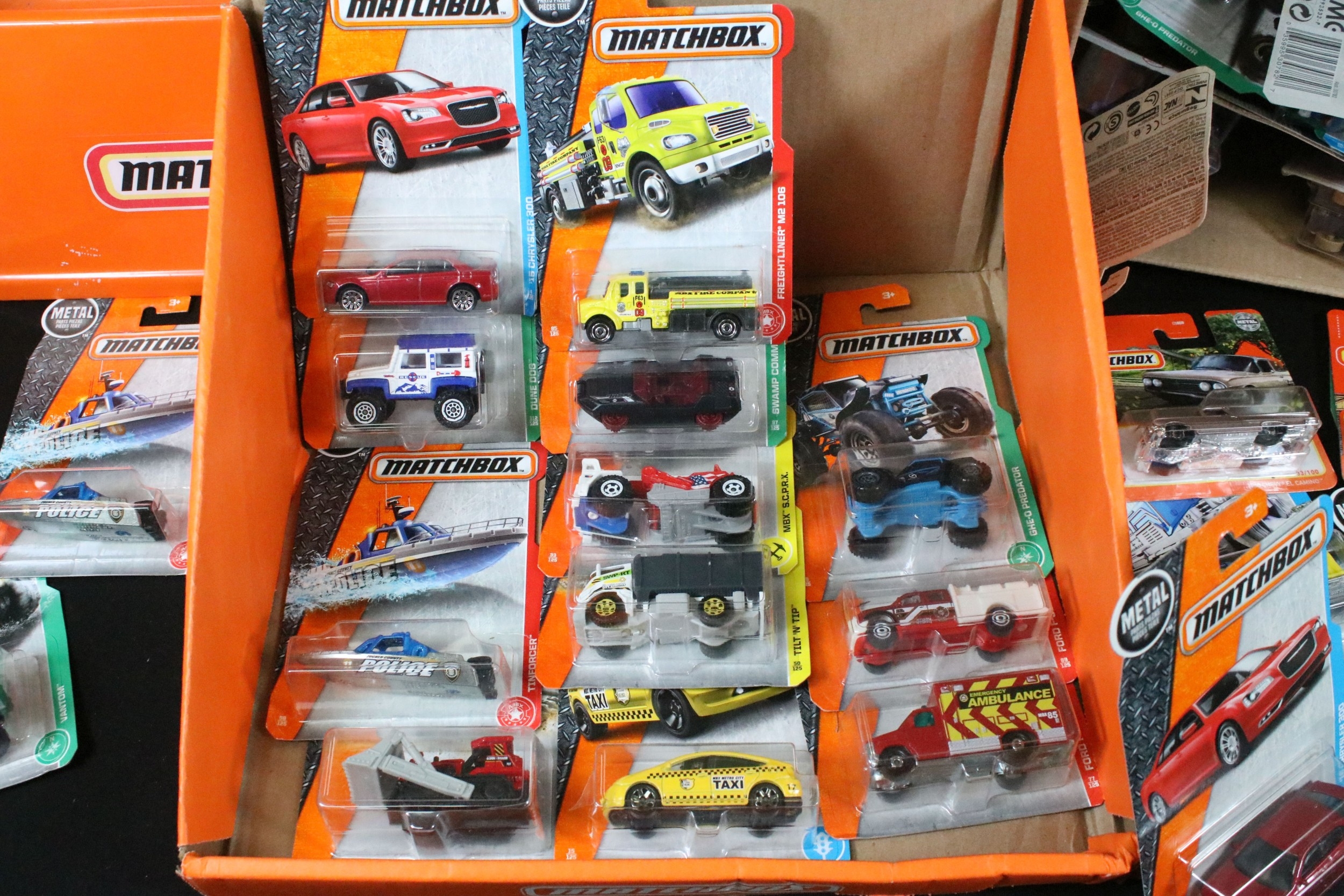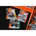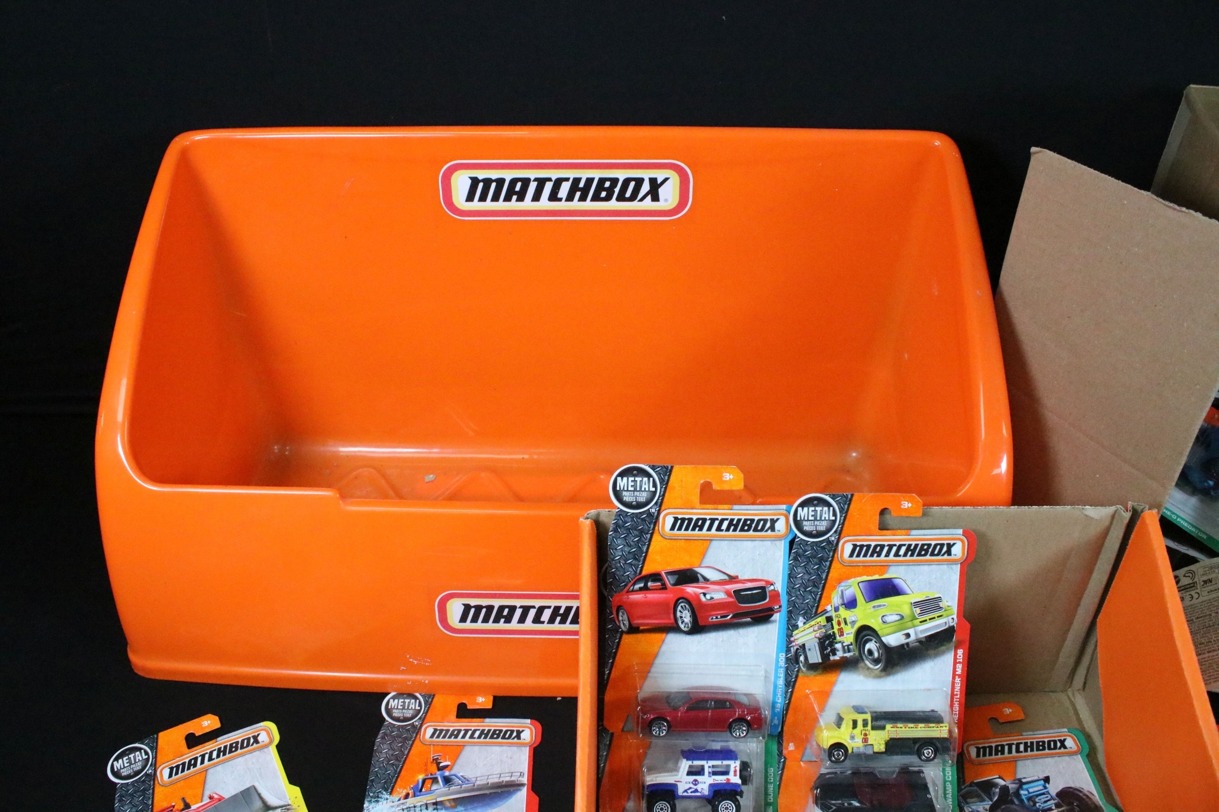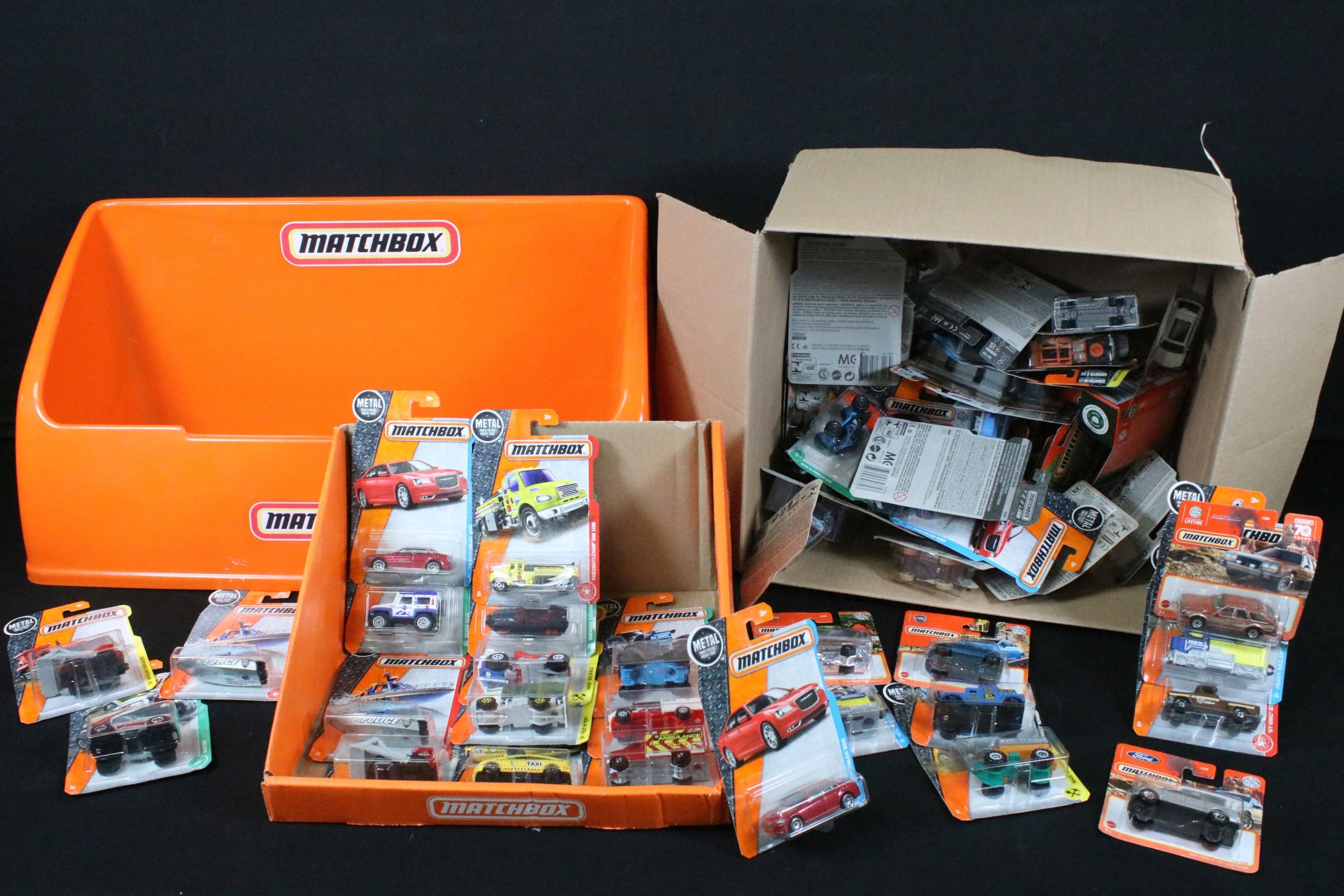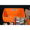 65 Carded Matchbox diecast models plus a related Matchbox diecast box and plastic tub display/carrier, vg-ex (2)