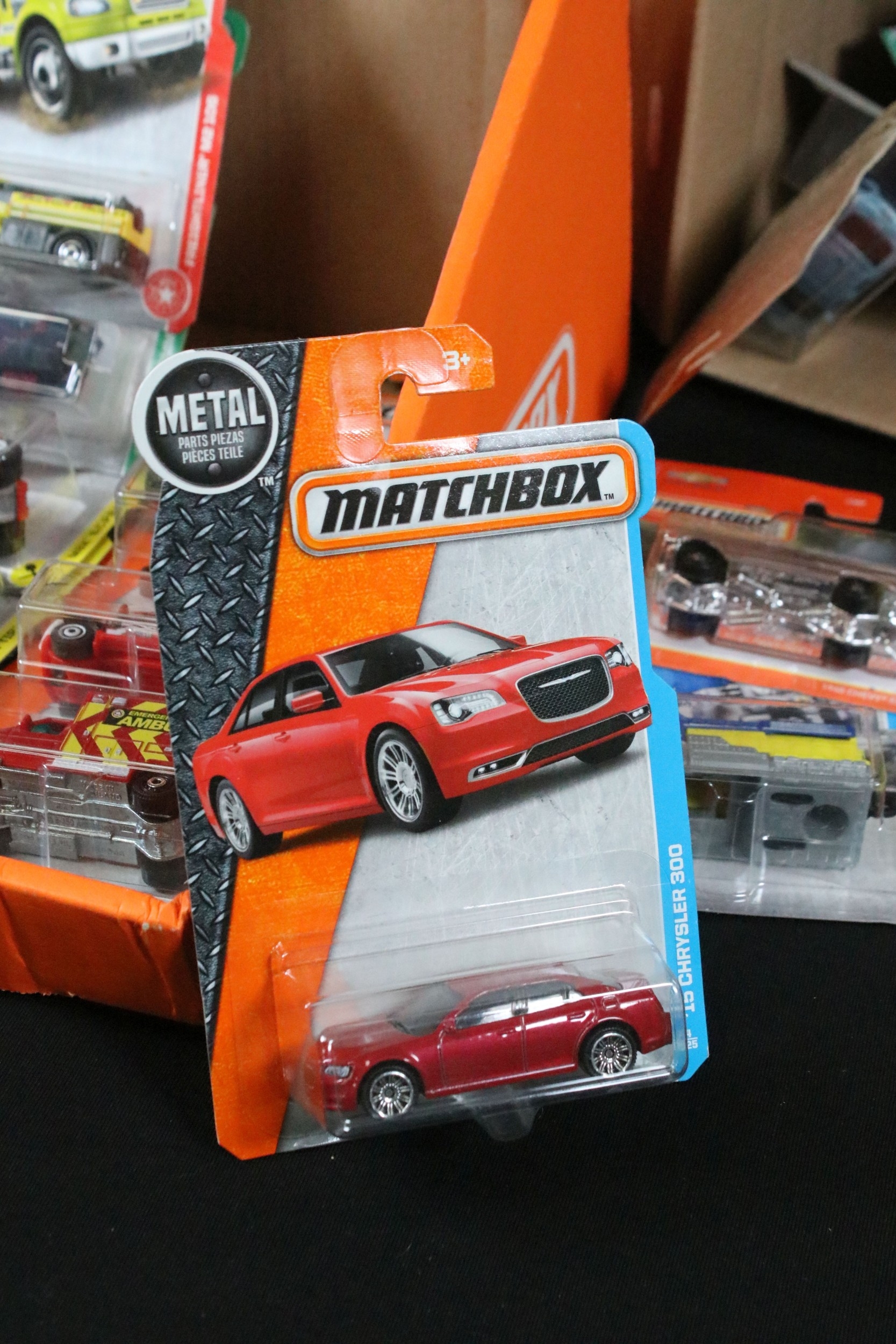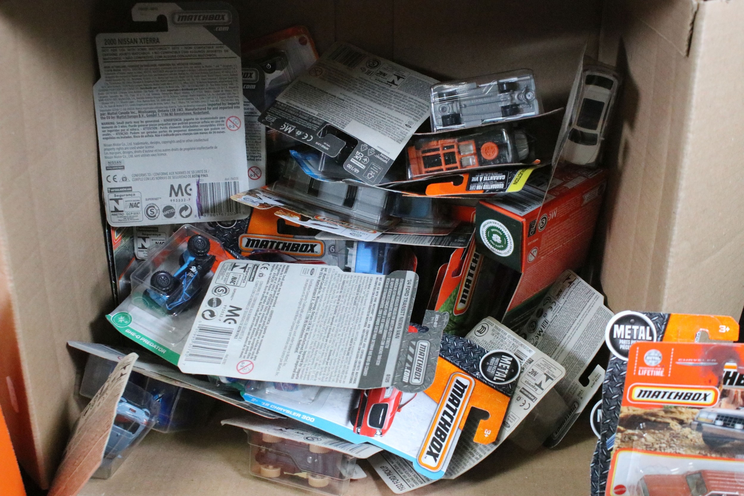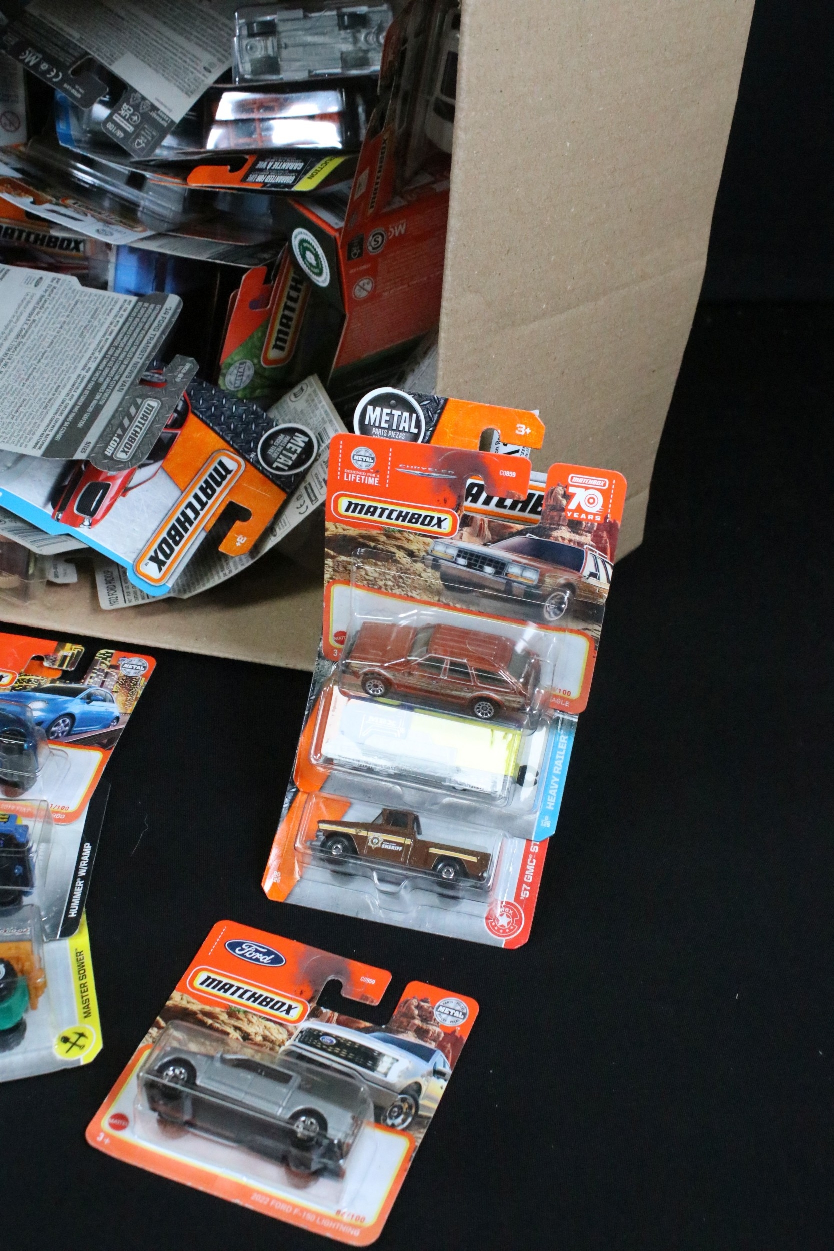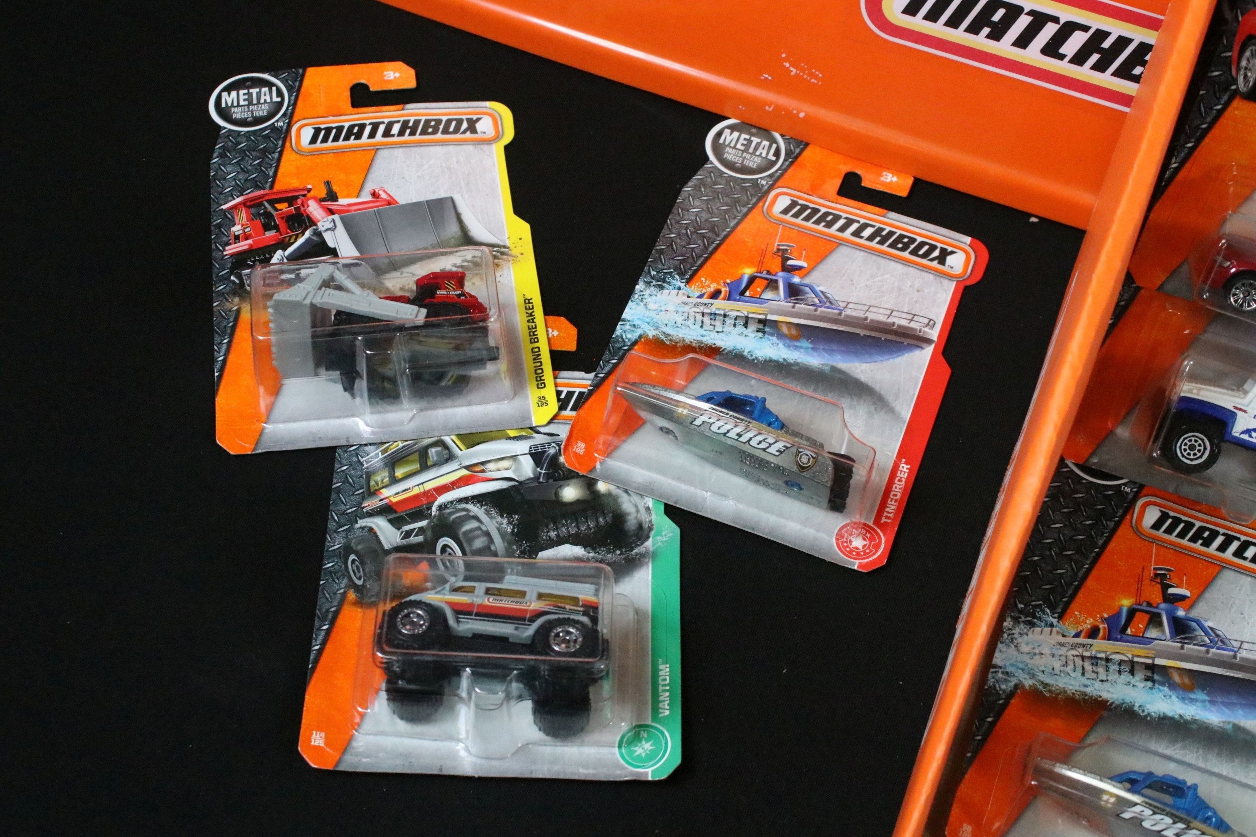 65 Carded Matchbox diecast models plus a related Matchbox diecast box and plastic tub display/carrier, vg-ex (2)