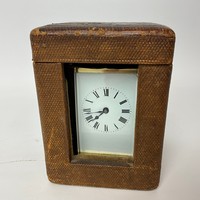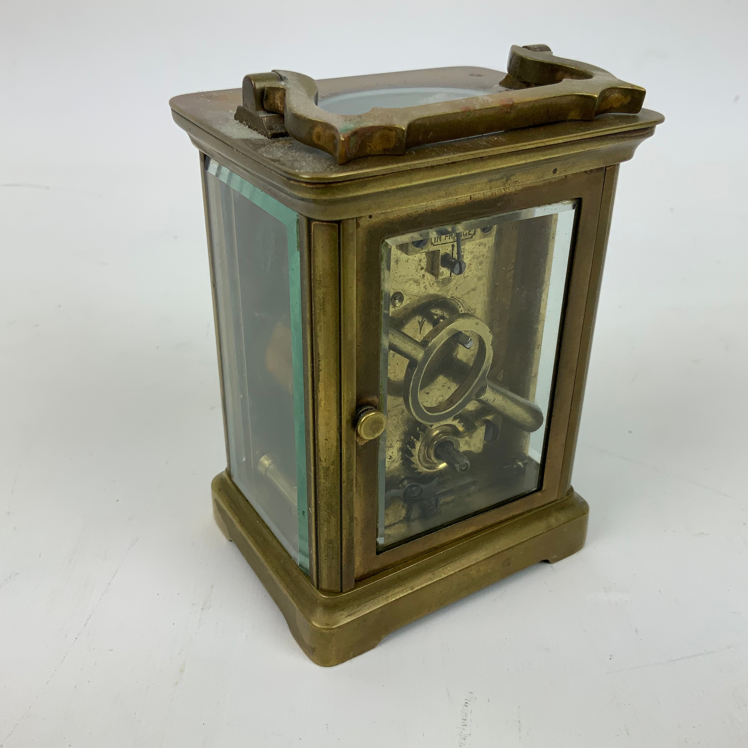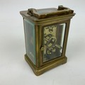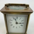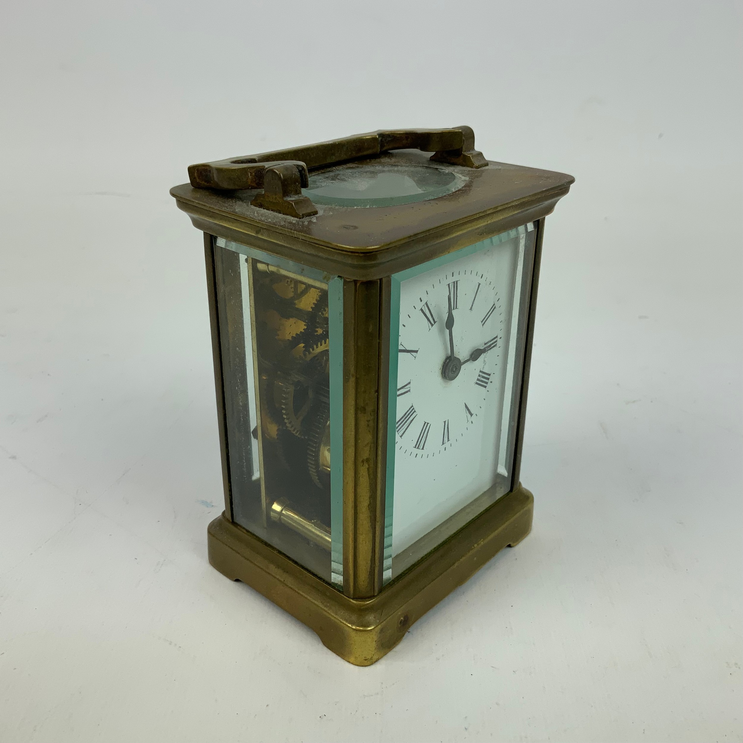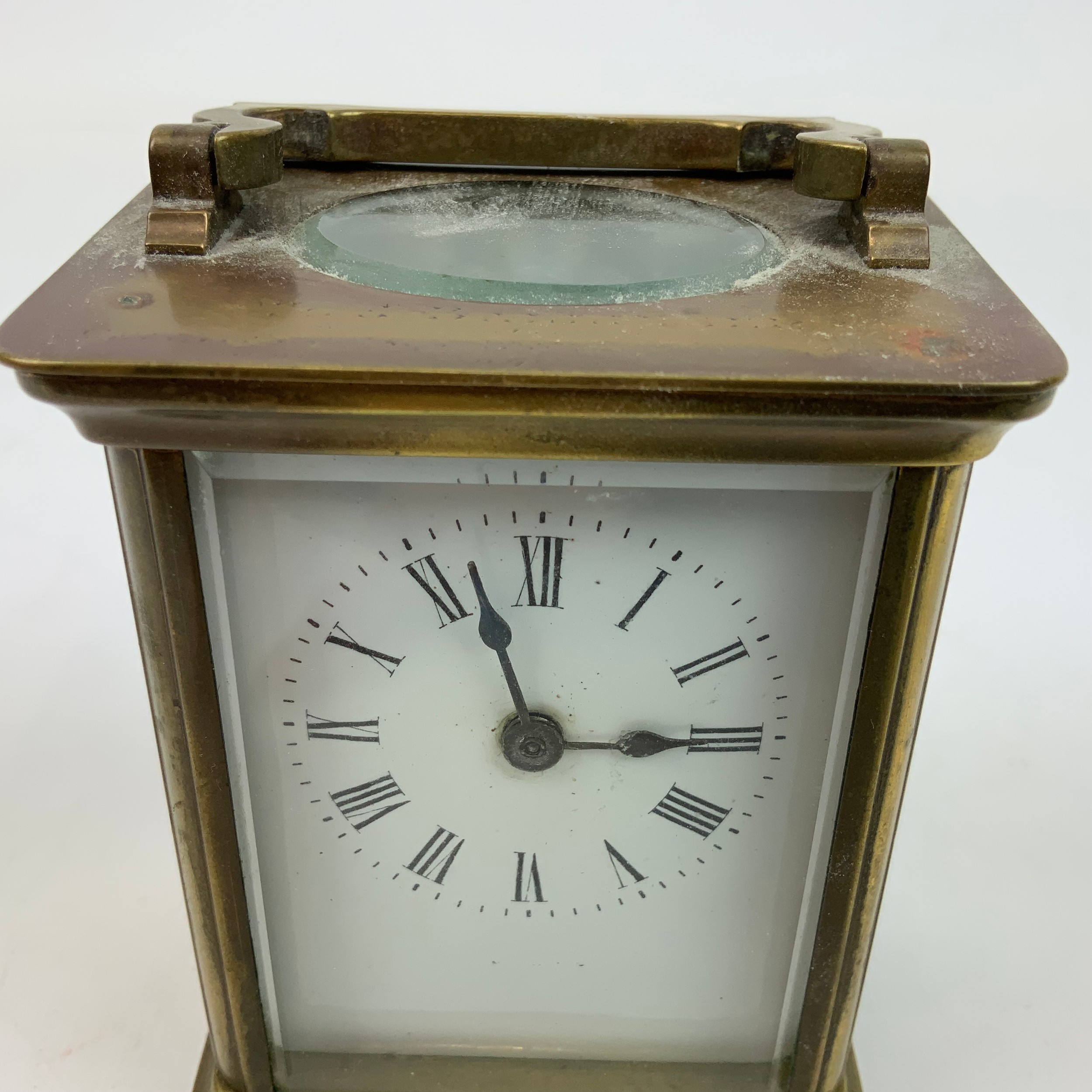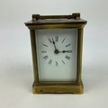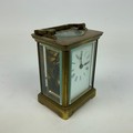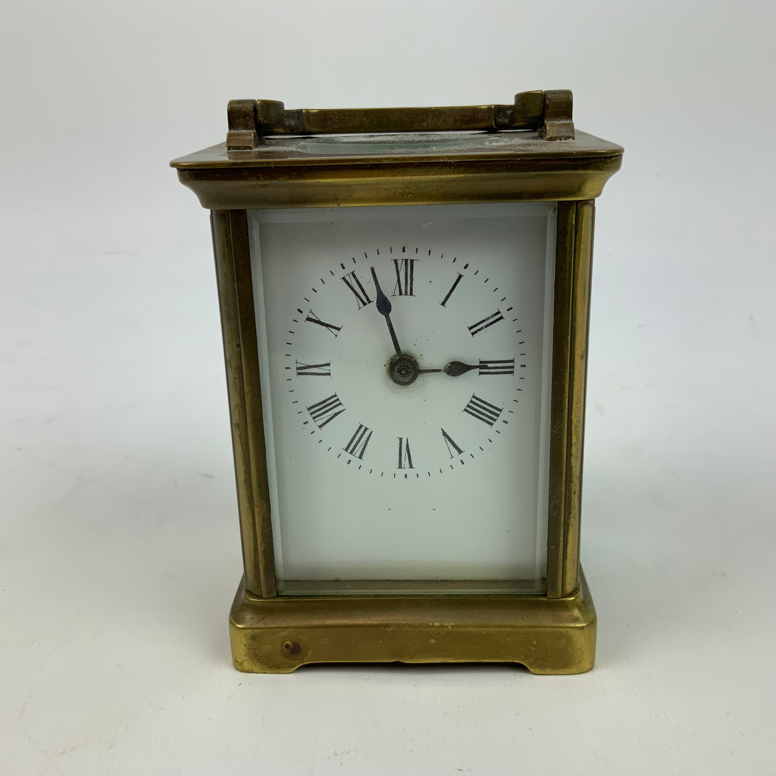 French brass cased carriage clock, with white enamel dial and Roman numeral increments, bevelled glass sides, and swing handle to top. H10.5cm.