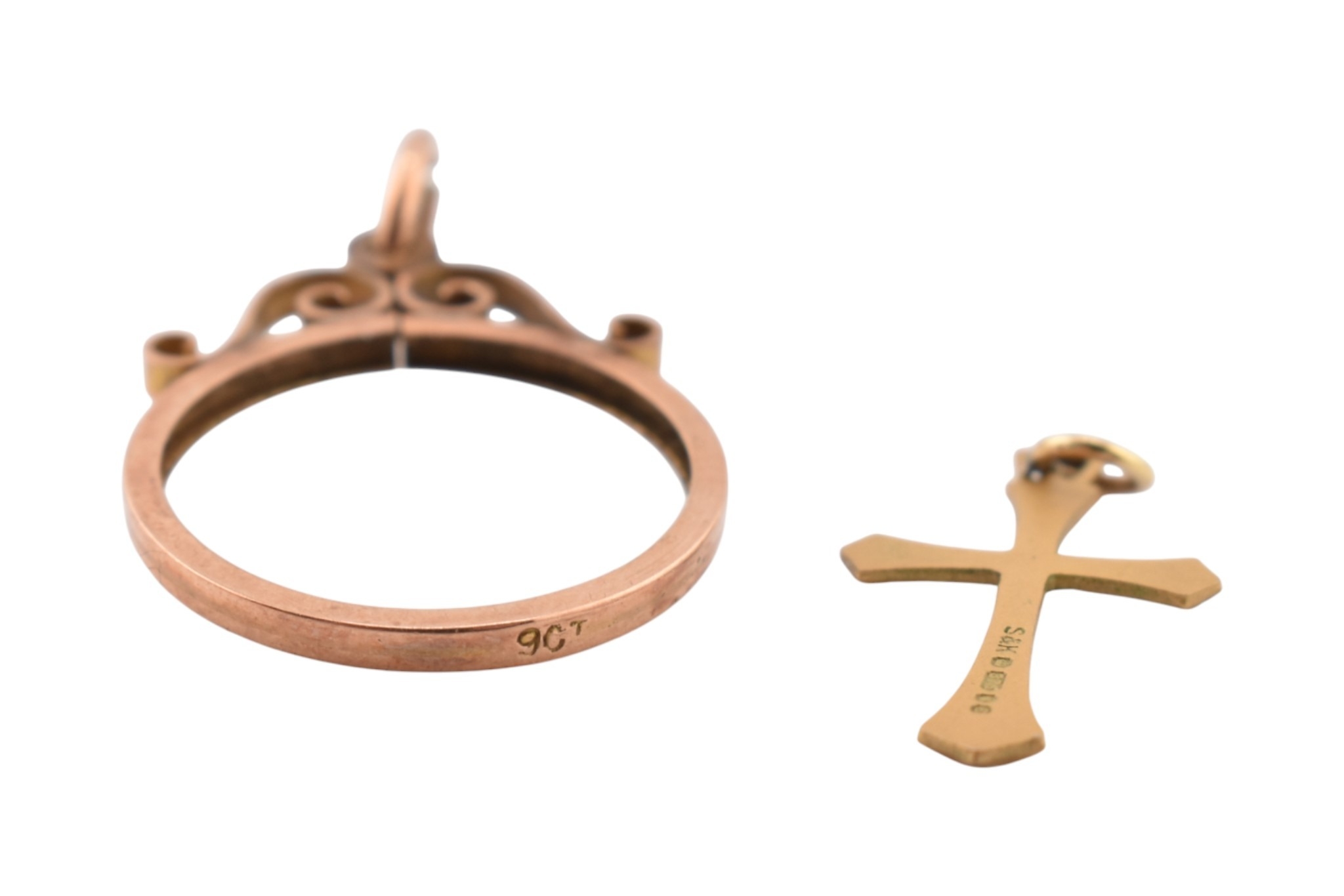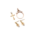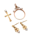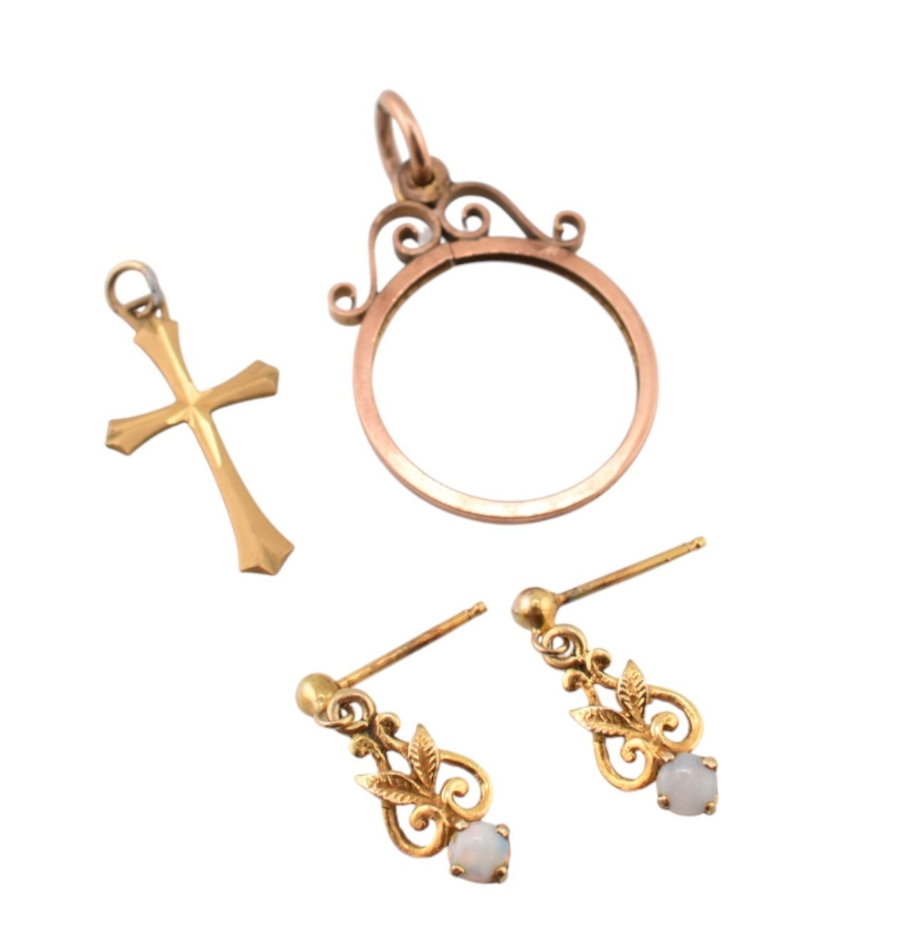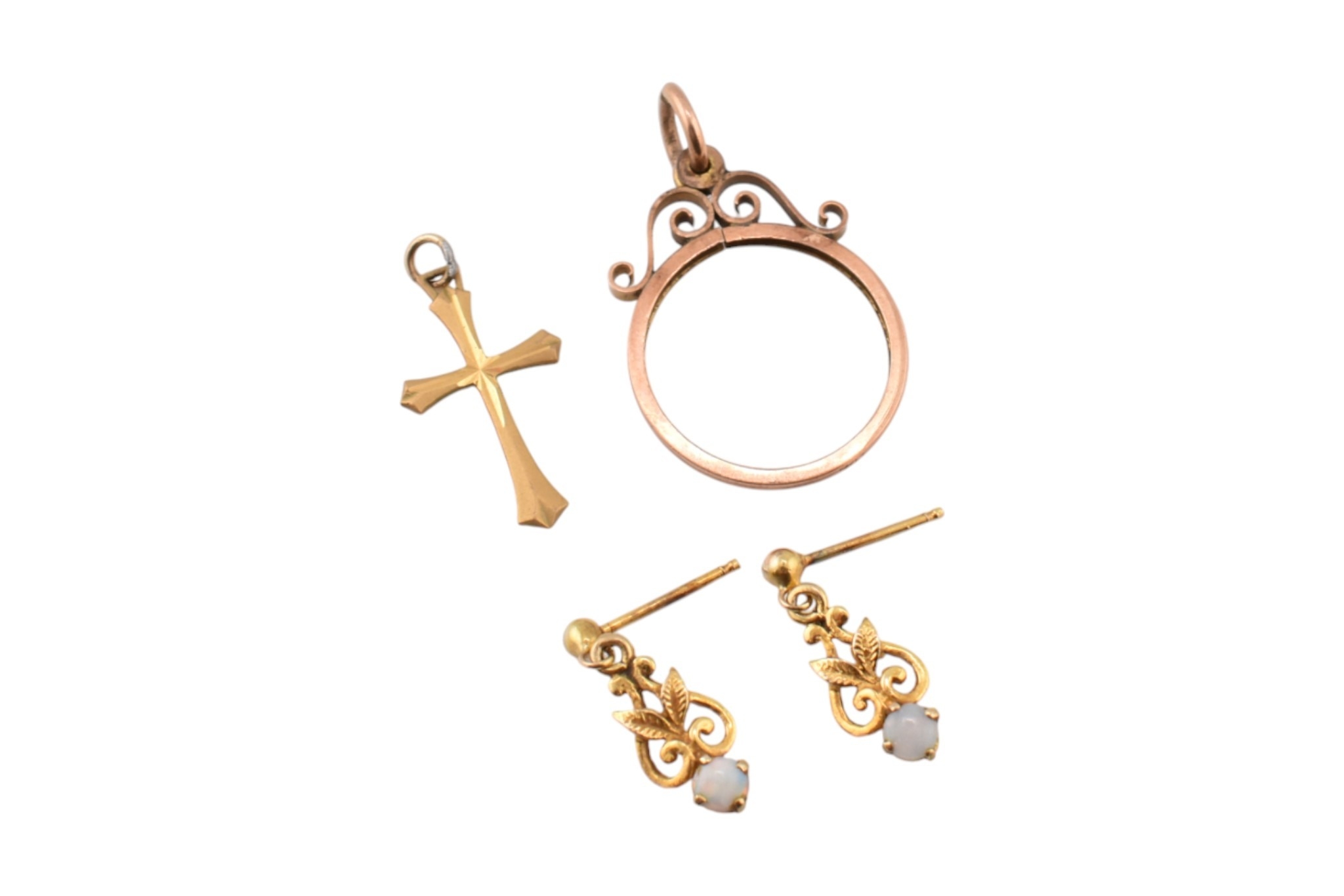 An assortment of gold jewellery. The jewellery to include a sovereign mount stamped 9ct, a hallmarked 9ct gold earrings set with opal and a hallmarked 9ct gold cross pendant with star cut decoration. Total weight 2.9g.